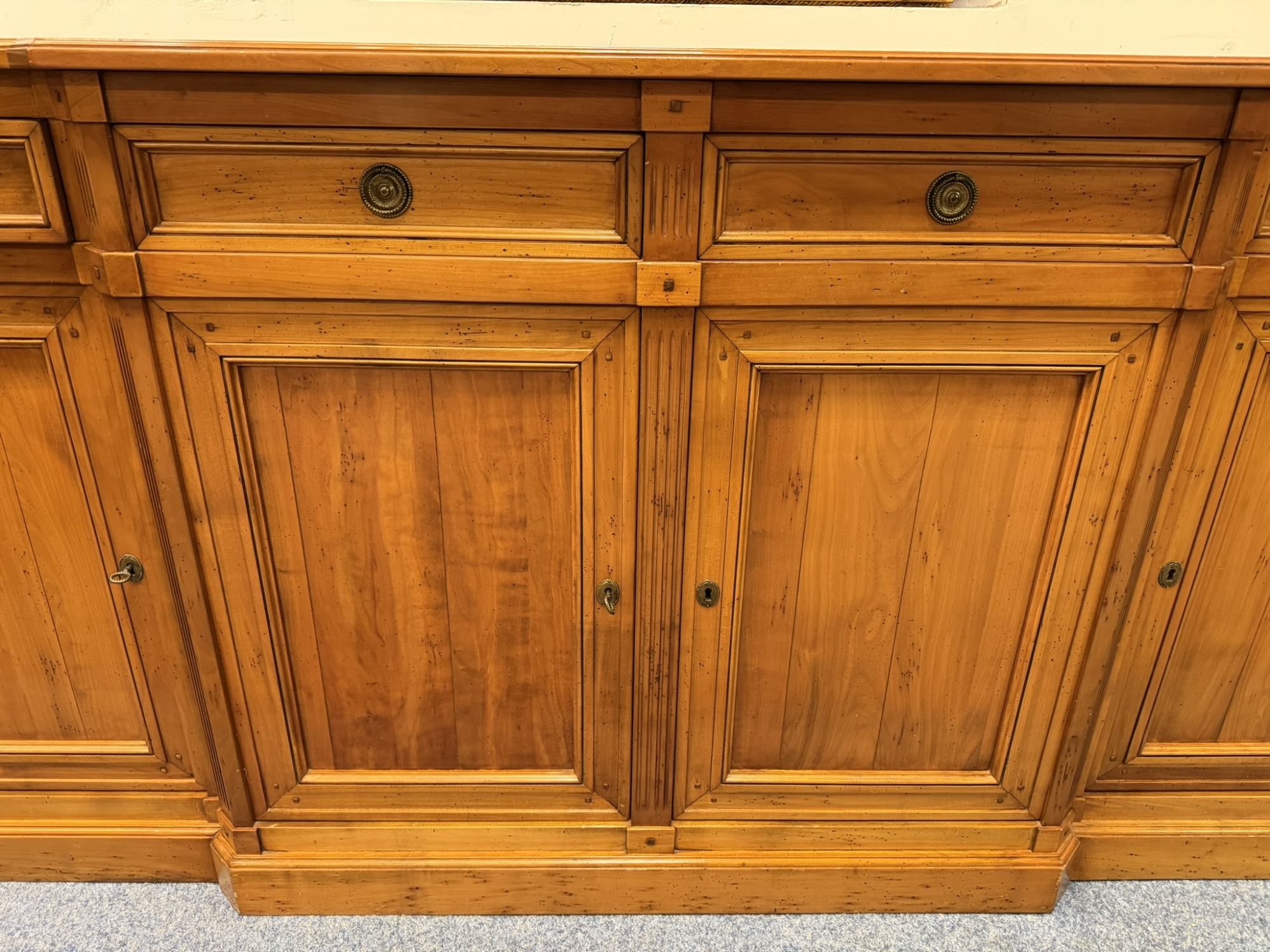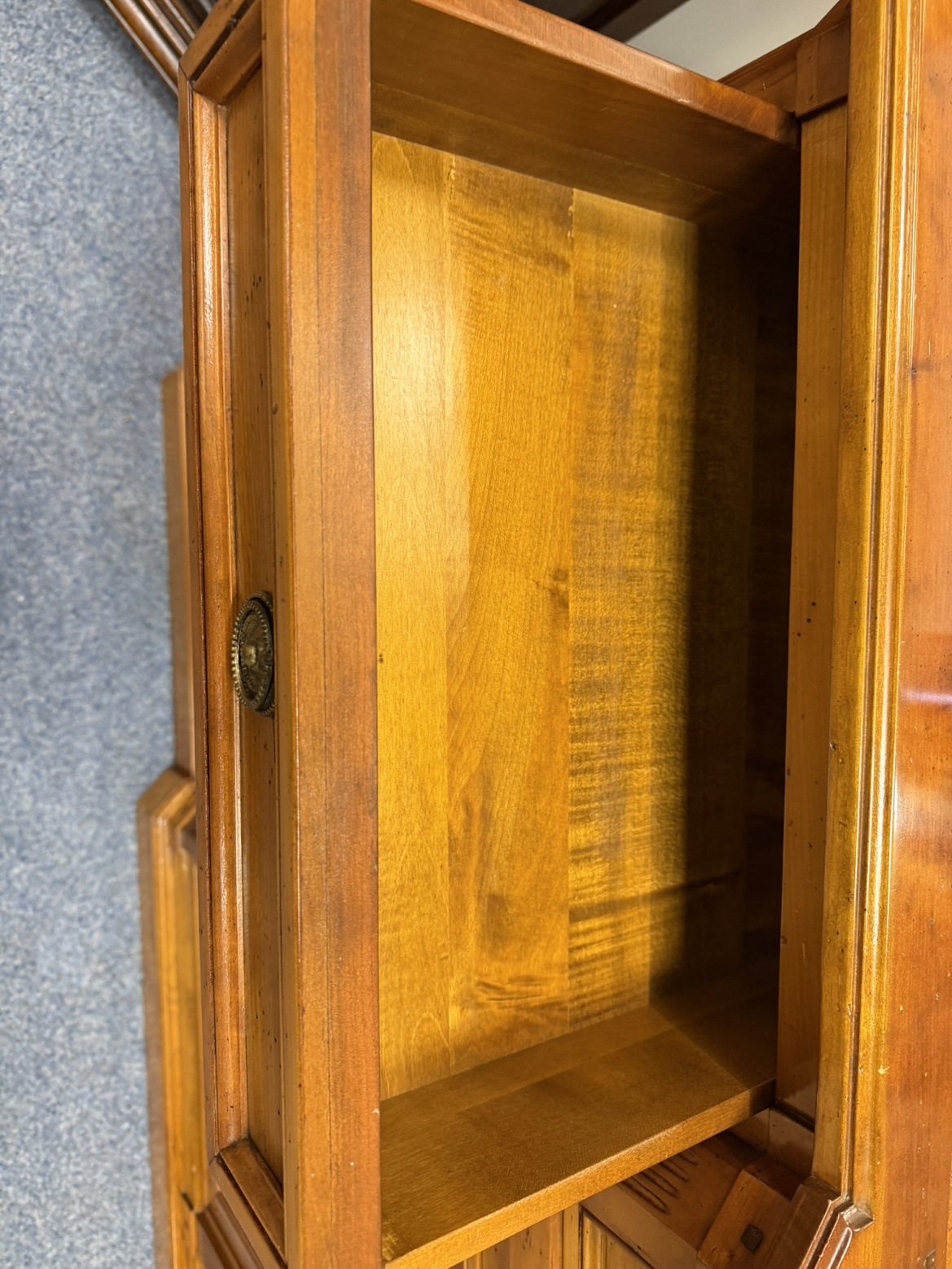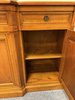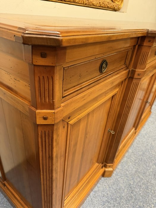 Komoda z třešňového masivu s kazetovými dvířky a zásuvkami, doplněná svislým ozdobným dělením a členěním. Teplý odstín dřeva zvýrazňuje kresbu a precizní truhlářské zpracování. Nabízí dostatek úložného prostoru. Mosazné úchytky s decentní patinou harmonicky ladí s celkovým pojetím.15 650 Kč