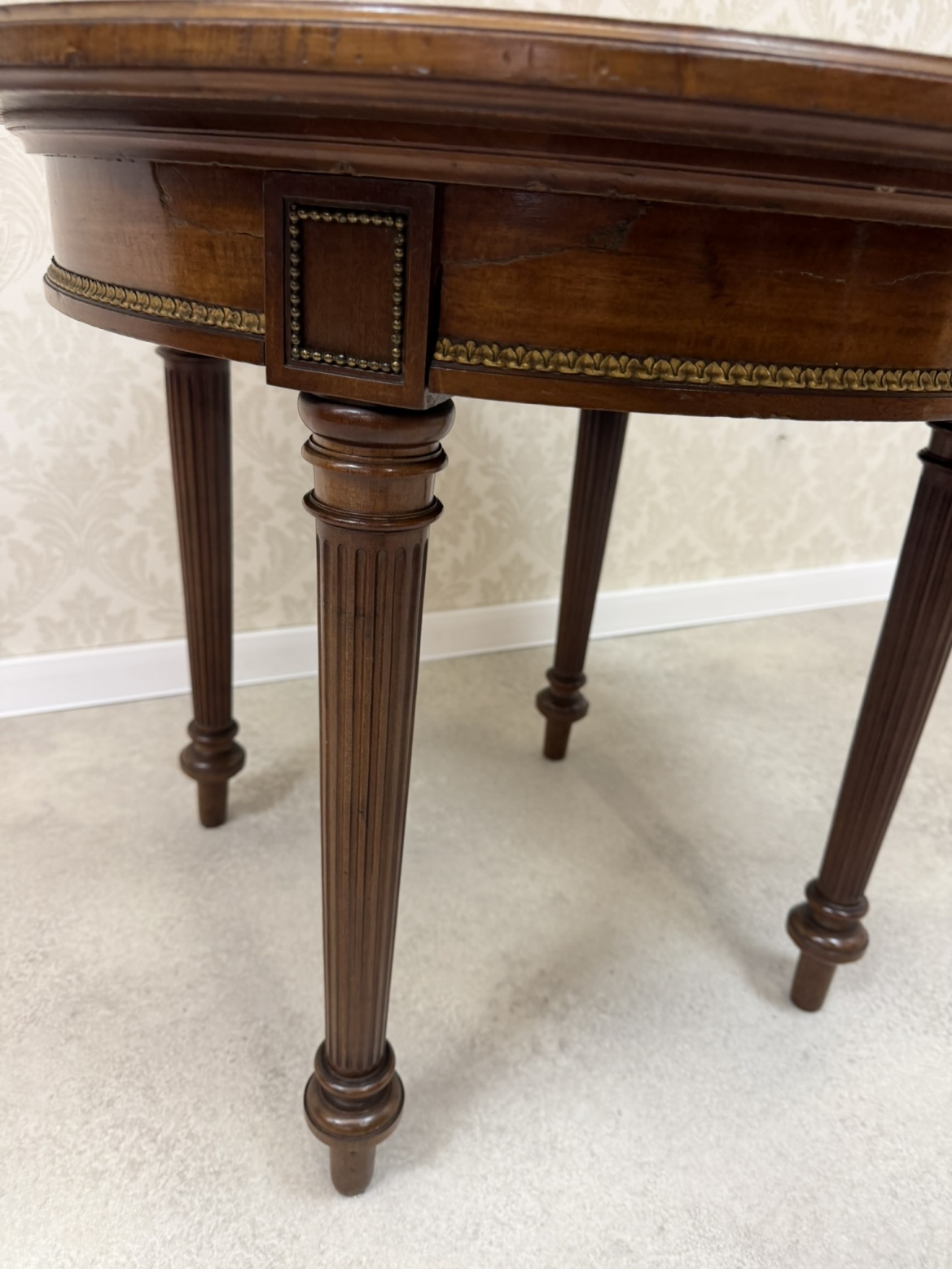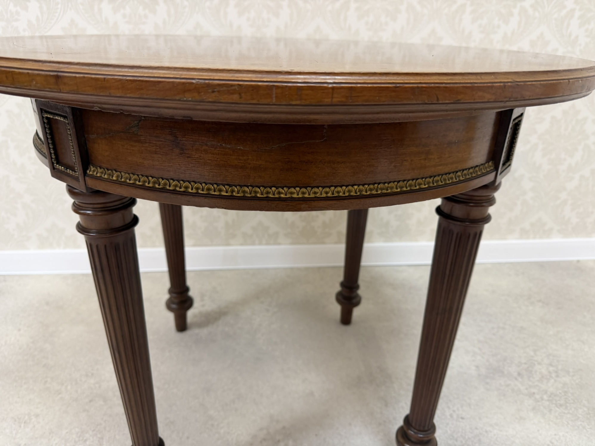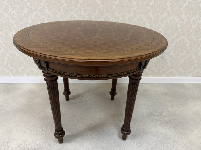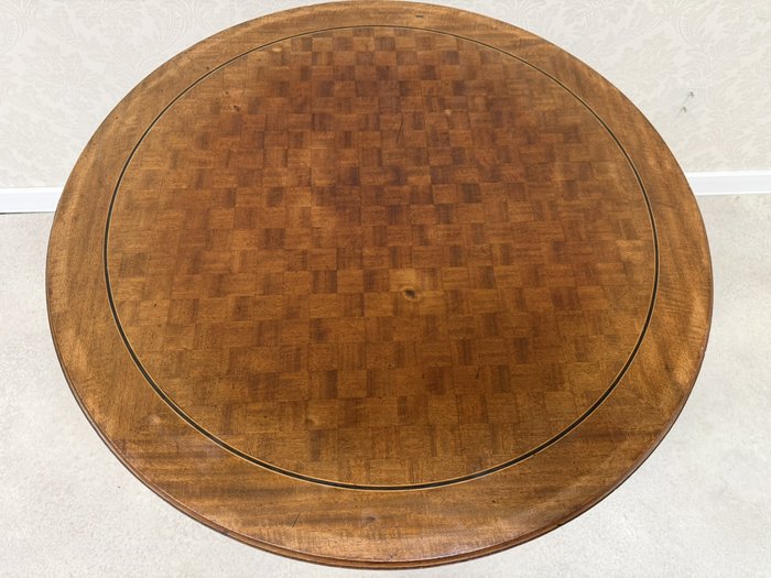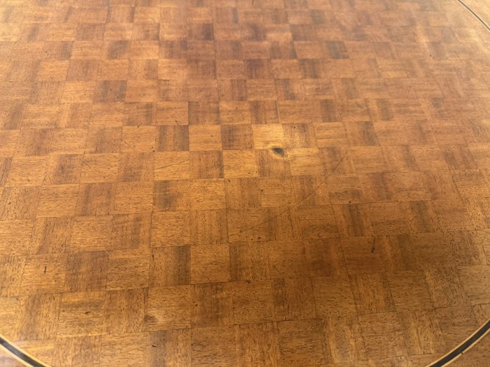 Kulatý stůl s deskou zdobenou dýhou ve čtvercovém vzoru šachovnice. Po obvodu stolu je aplikován ozdobný pásek s motivem listů.3 980 Kč