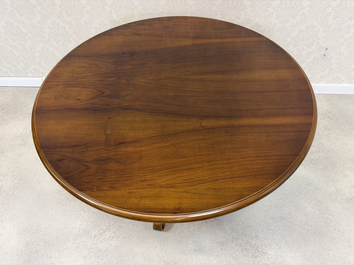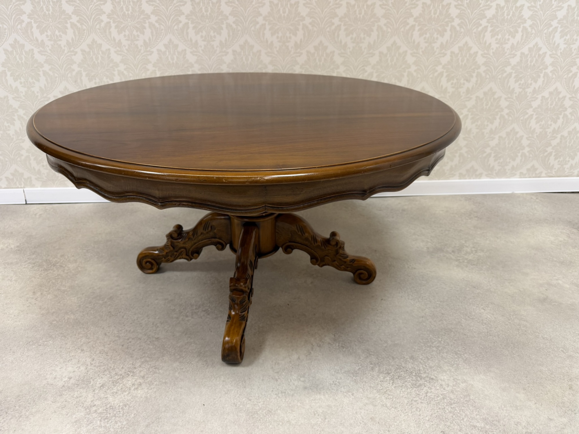Stolek s lesklou povrchovou úpravou. Stojí na centrální noze, která se rozvětvuje do tří dekorativně řezaných nohou s jemnými volutami. Bohaté řezby v barokním duchu dodávají nábytku na výraznosti.6 450 Kč