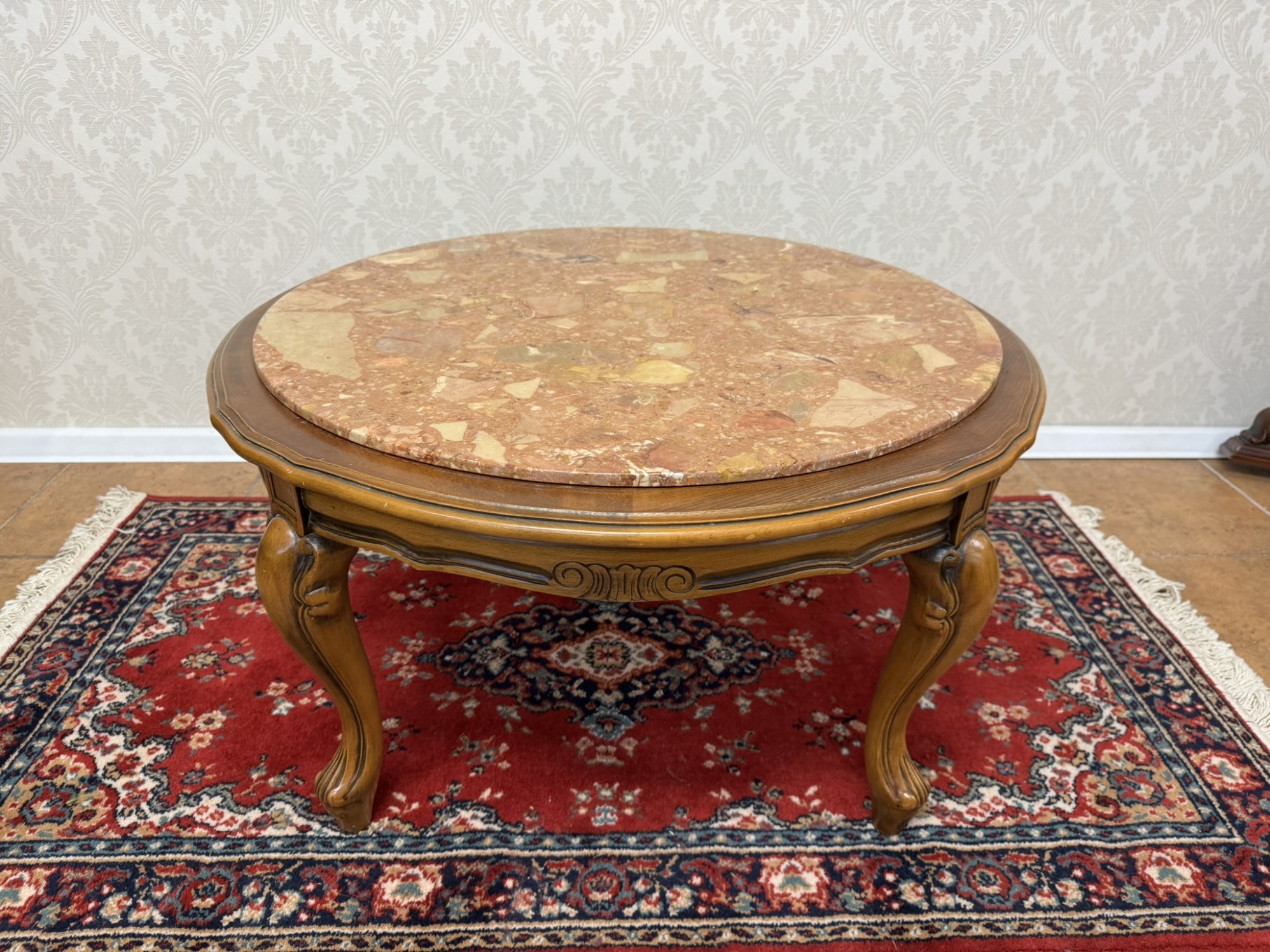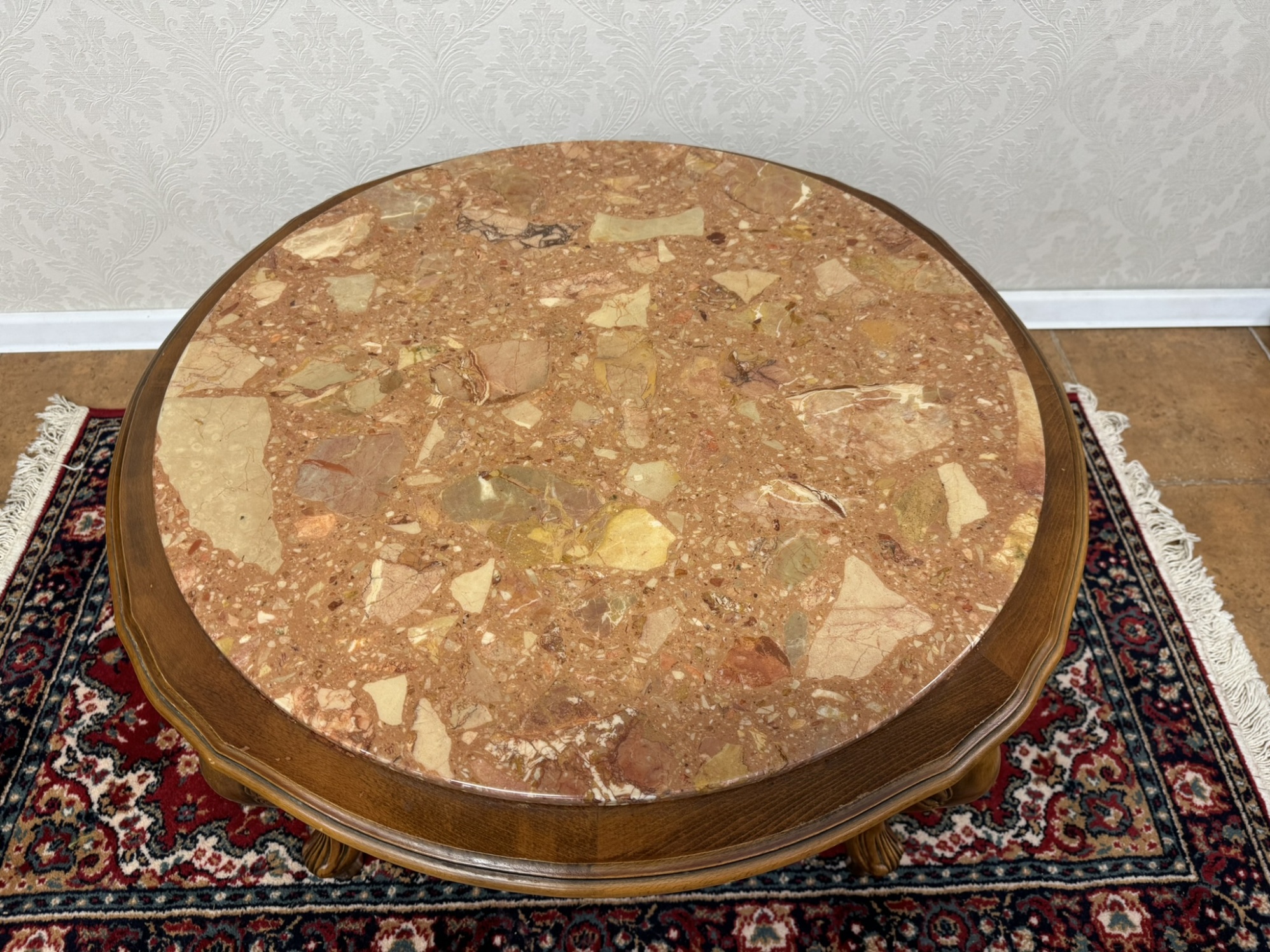 Kulatý stolek se dvěma deskami z mramoru s výraznou kresbou. Bohatě řezbovaný okraj, girlandy, rozviliny i stylizované rozetky dodávají stolku luxusní charakter. Zakřivené nohy přecházejí do jemně profilované spodní police.Nová výroba - Replika