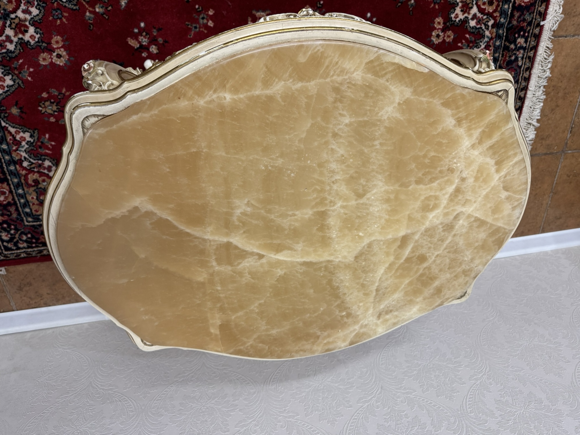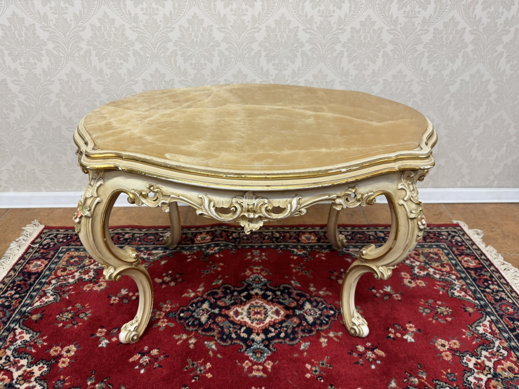 Stolek s mramorovou deskou, zasazenou do rámu se stylovým bílým nátěrem s jemnou patinou. Bohaté plastické řezby s motivy akantových listů a květin zdobí celý přední pás i rohy stolku.Nová výroba - Replika