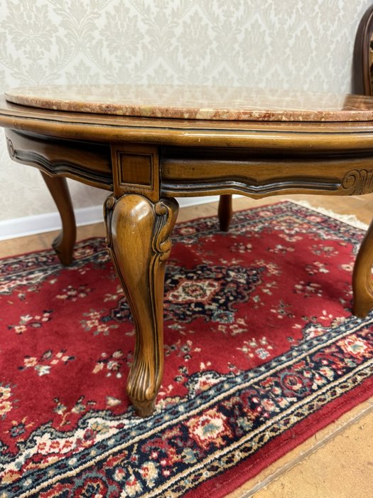 Elegantní konzolový stolek s masivní řezbou v tmavém dřevě a růžovou mramorovou deskou s výraznou kresbou žil. Vyniká křivkami a florálními motivy, typickými pro rokokový styl, jemné detaily na nohách připomínají lví tlapy.Konferenční stolek, cena za ks