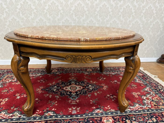 Konferenční stolek s výraznou deskou z růžového mramoru a podnoží z tvarovaného dřeva. Profilované nohy a jemné rytí pod deskou dodávají stolku lehkost, zatímco mramorová deska zajišťuje odolnost i reprezentativní vzhled.