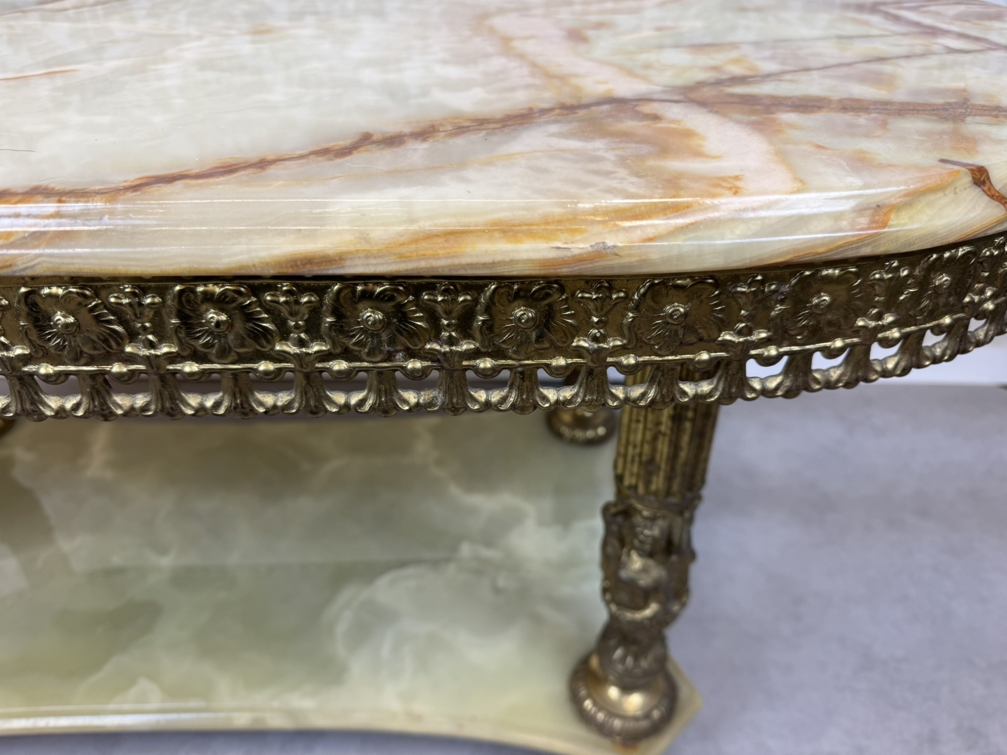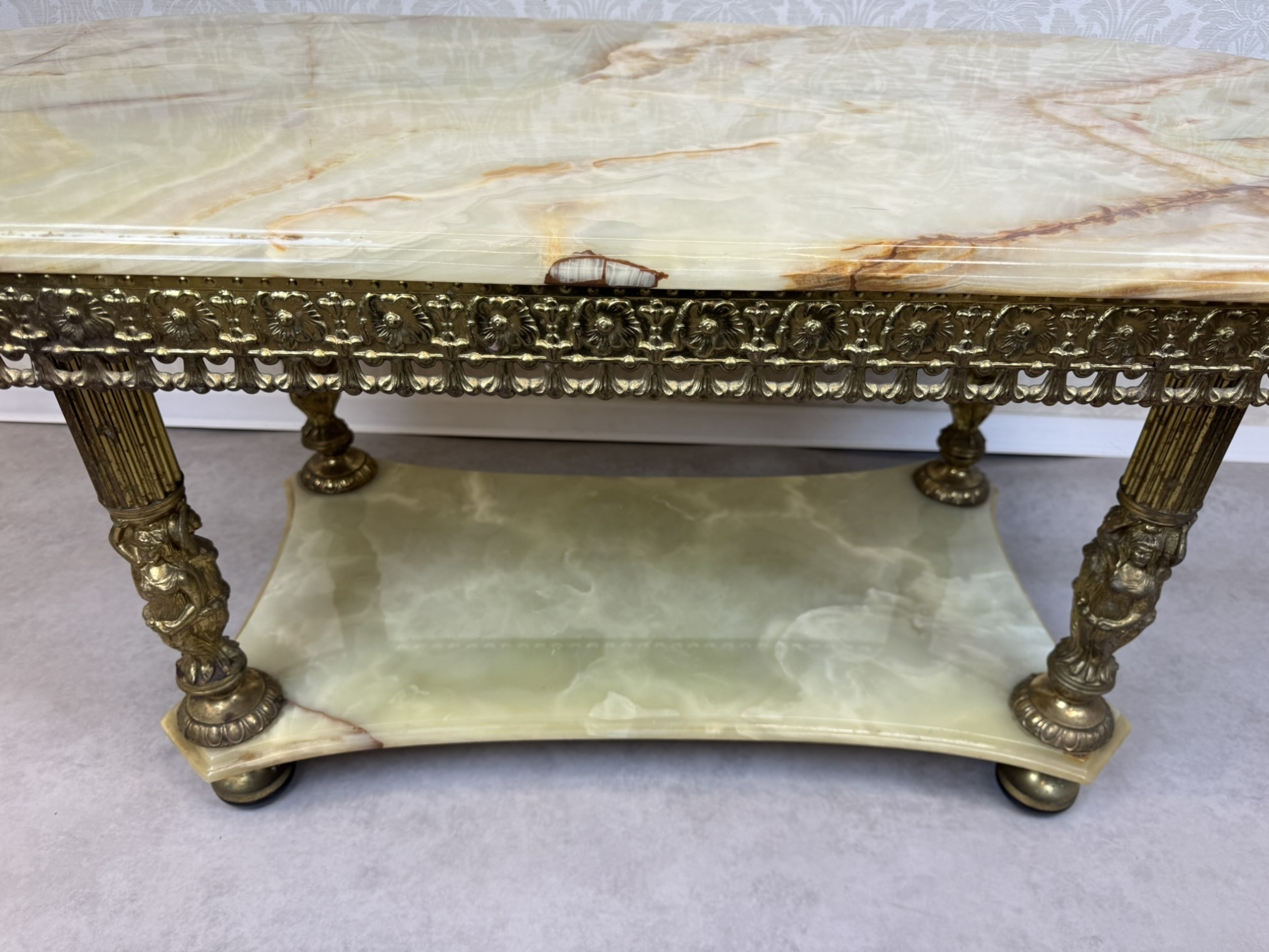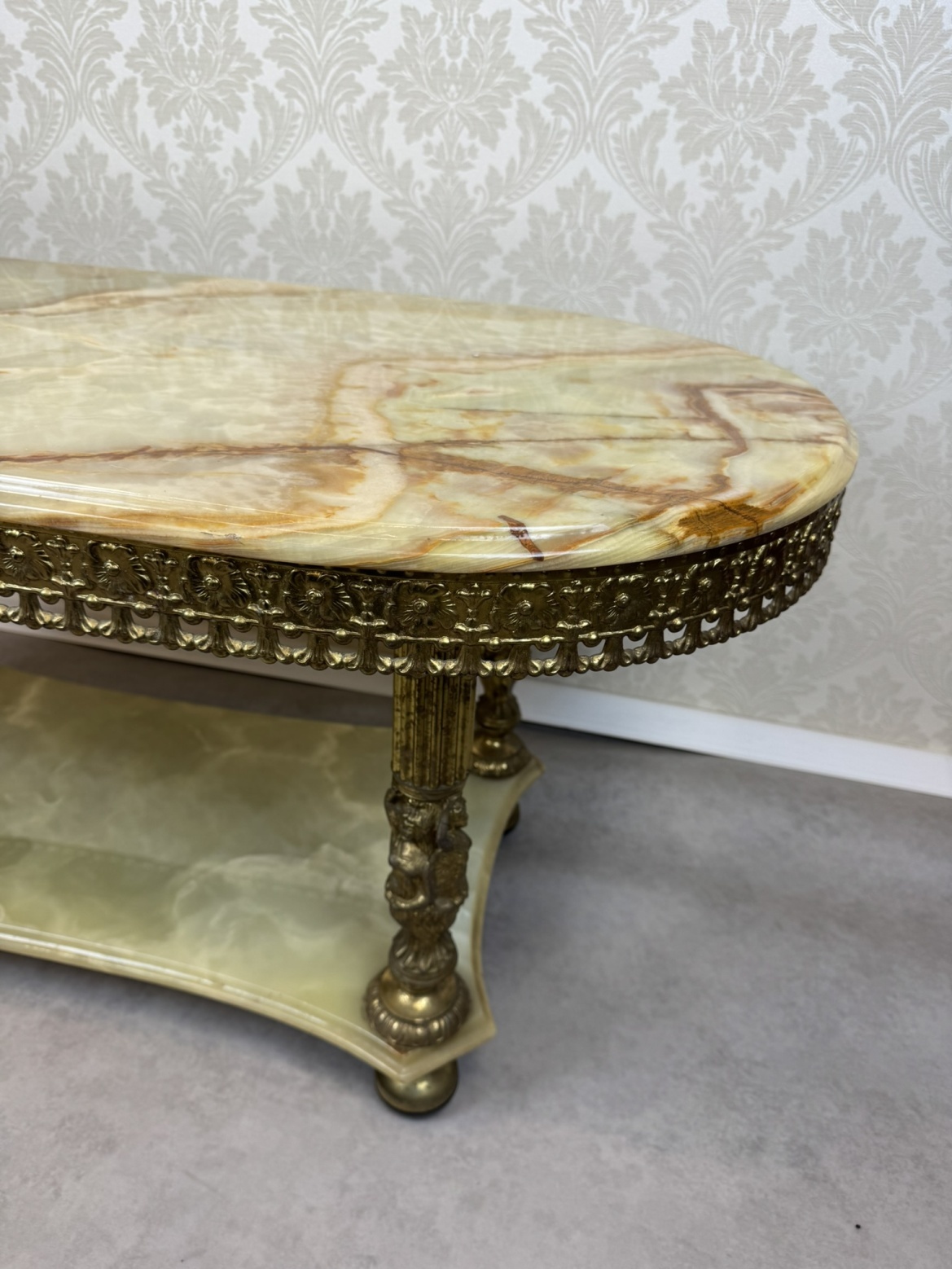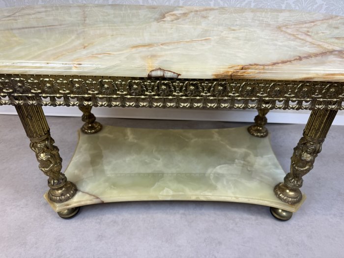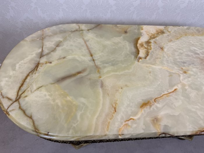 Tento stolek má kombinaci mosazi a onyxu, přičemž bohatě zdobený okraj desky a plastické ornamenty na nohách odrážejí barokní estetiku. Onyxová deska s výraznou kresbou dodává stolu noblesní vzhled, zatímco precizně litá mosazná konstrukce zajišťuje pevnost.