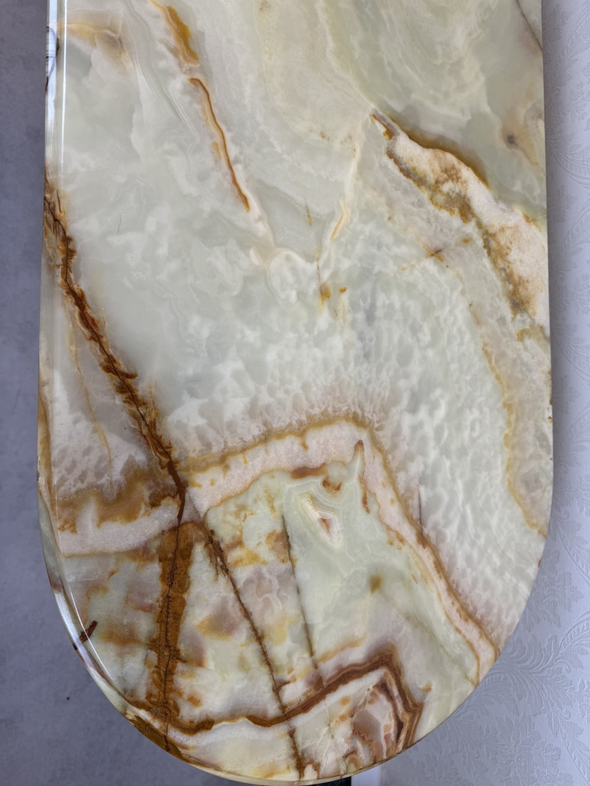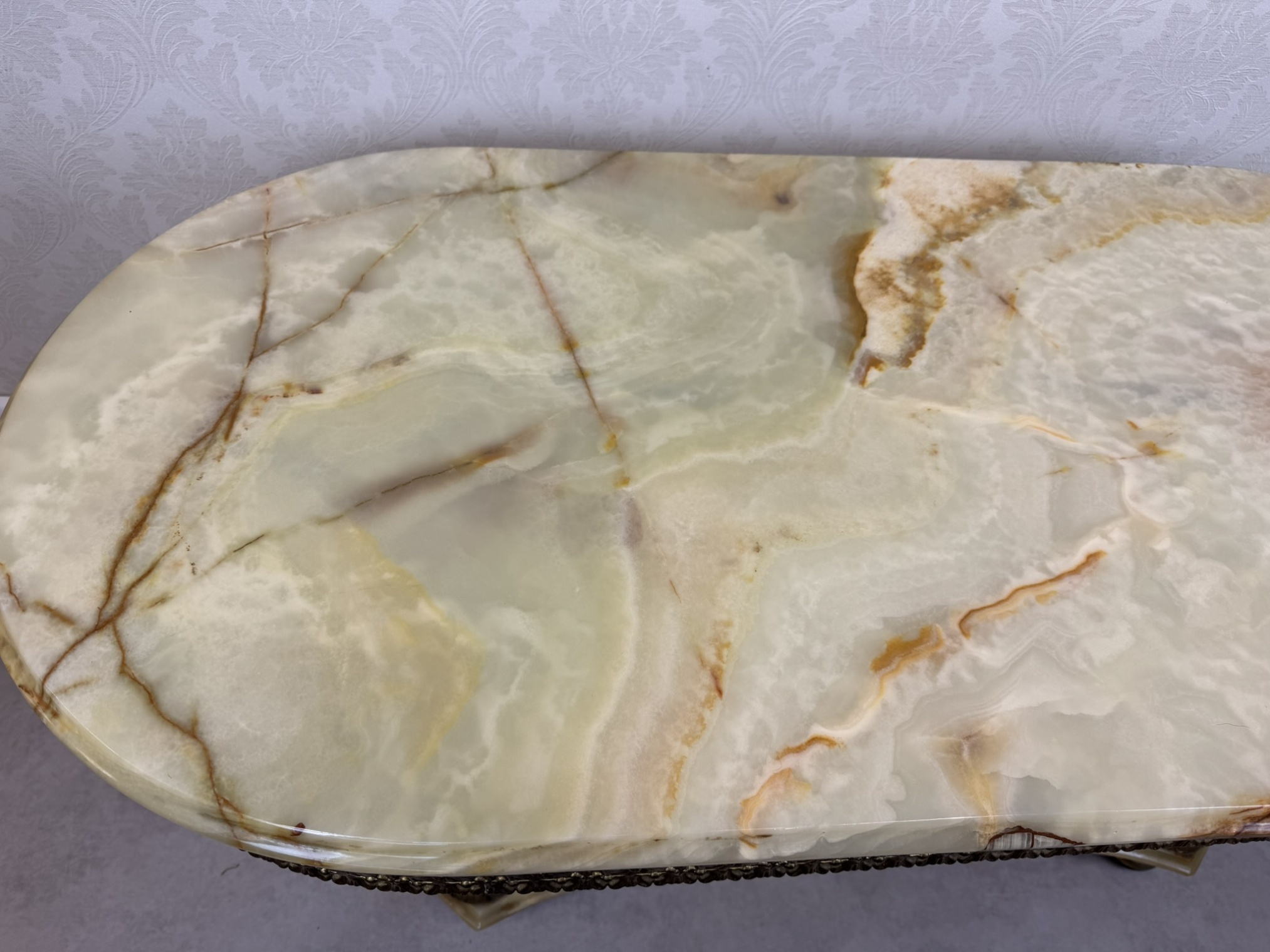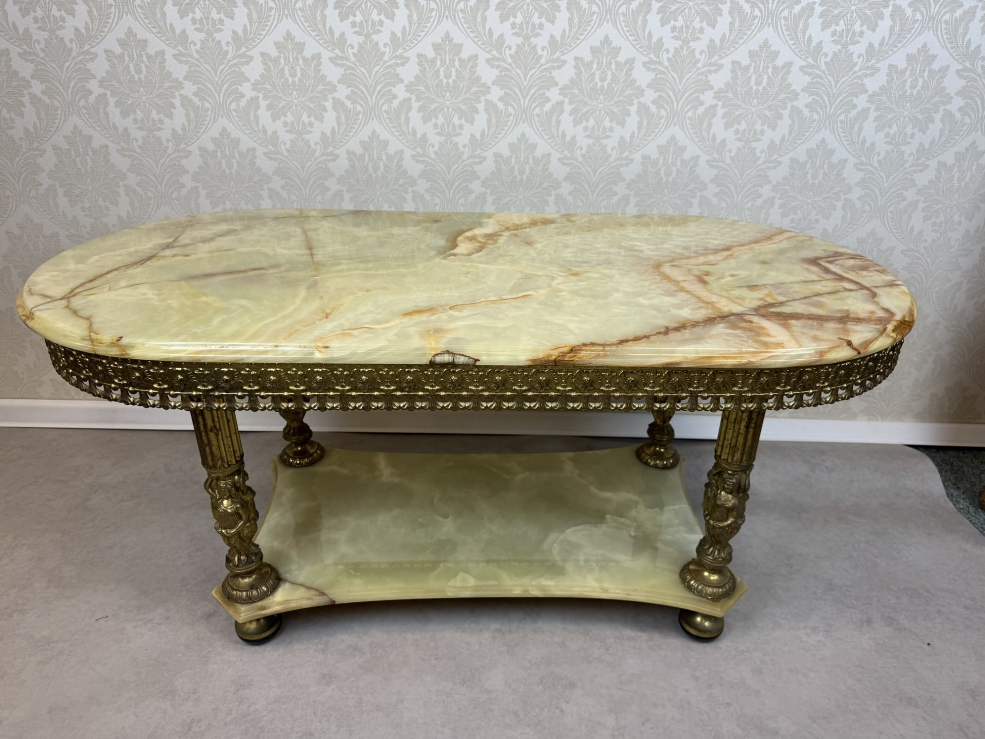 Tento stolek má kombinaci mosazi a onyxu, přičemž bohatě zdobený okraj desky a plastické ornamenty na nohách odrážejí barokní estetiku. Onyxová deska s výraznou kresbou dodává stolu noblesní vzhled, zatímco precizně litá mosazná konstrukce zajišťuje pevnost.