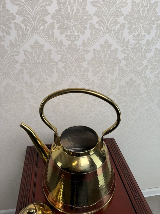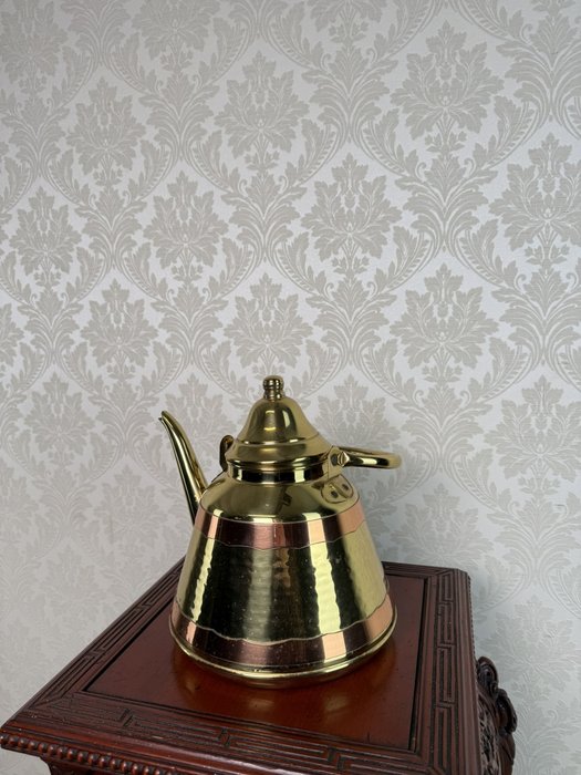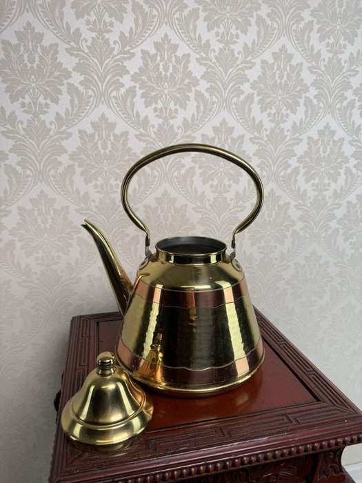 Konvice z leštěné mosazi v kombinaci s měděným pásem uprostřed těla. Má vyjímatelné víko, vysoké držadlo a úzký výtok. Povrch je jemně tepaný, celkový vzhled dekorativní, ale původní funkce zůstává zachována.2 180 Kč