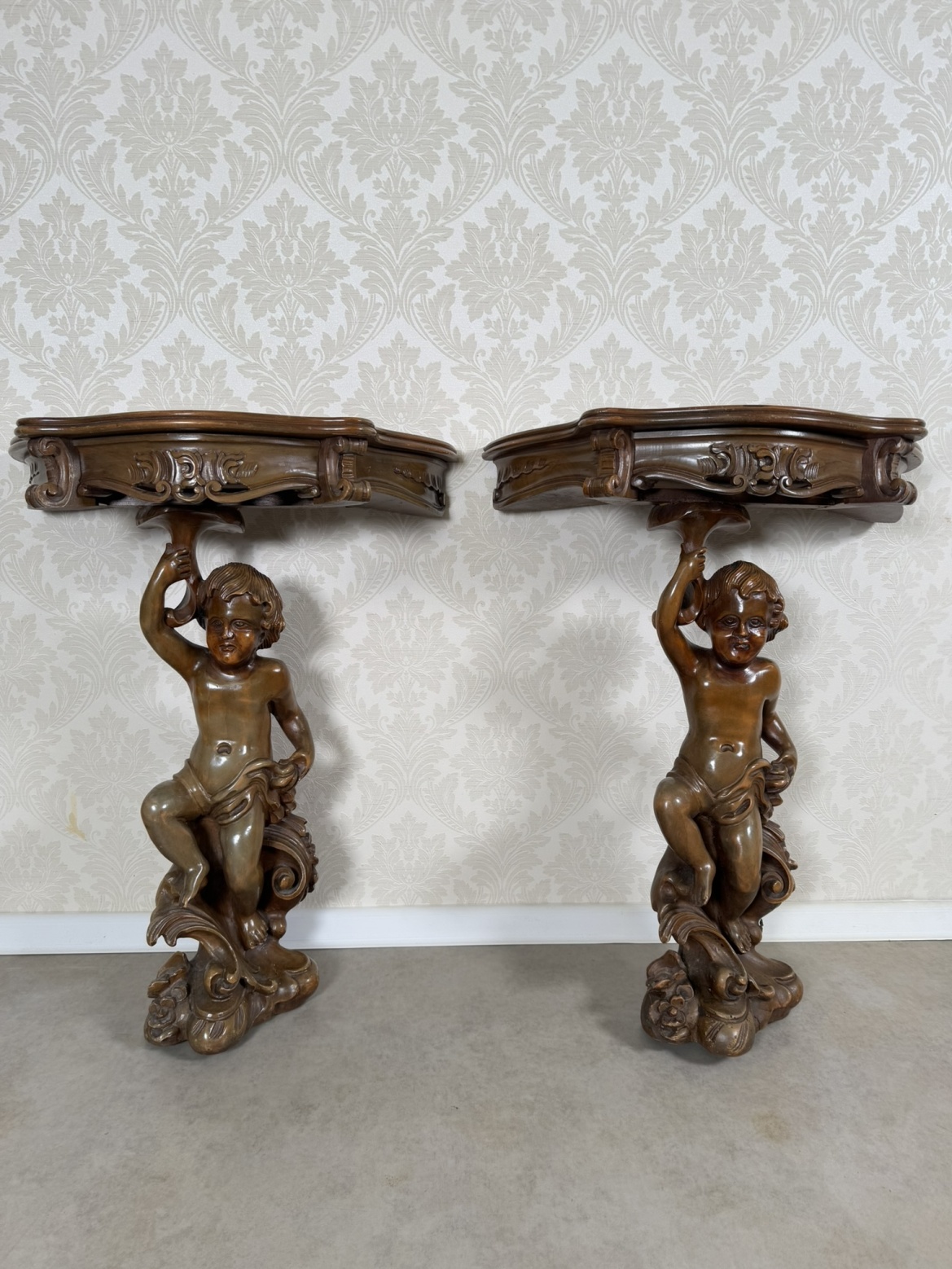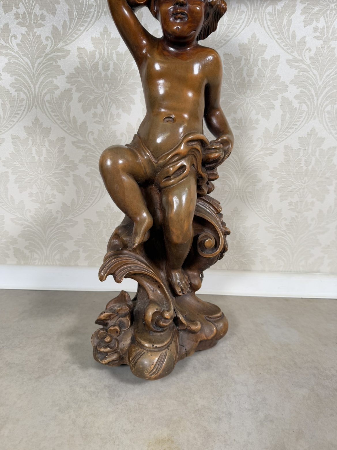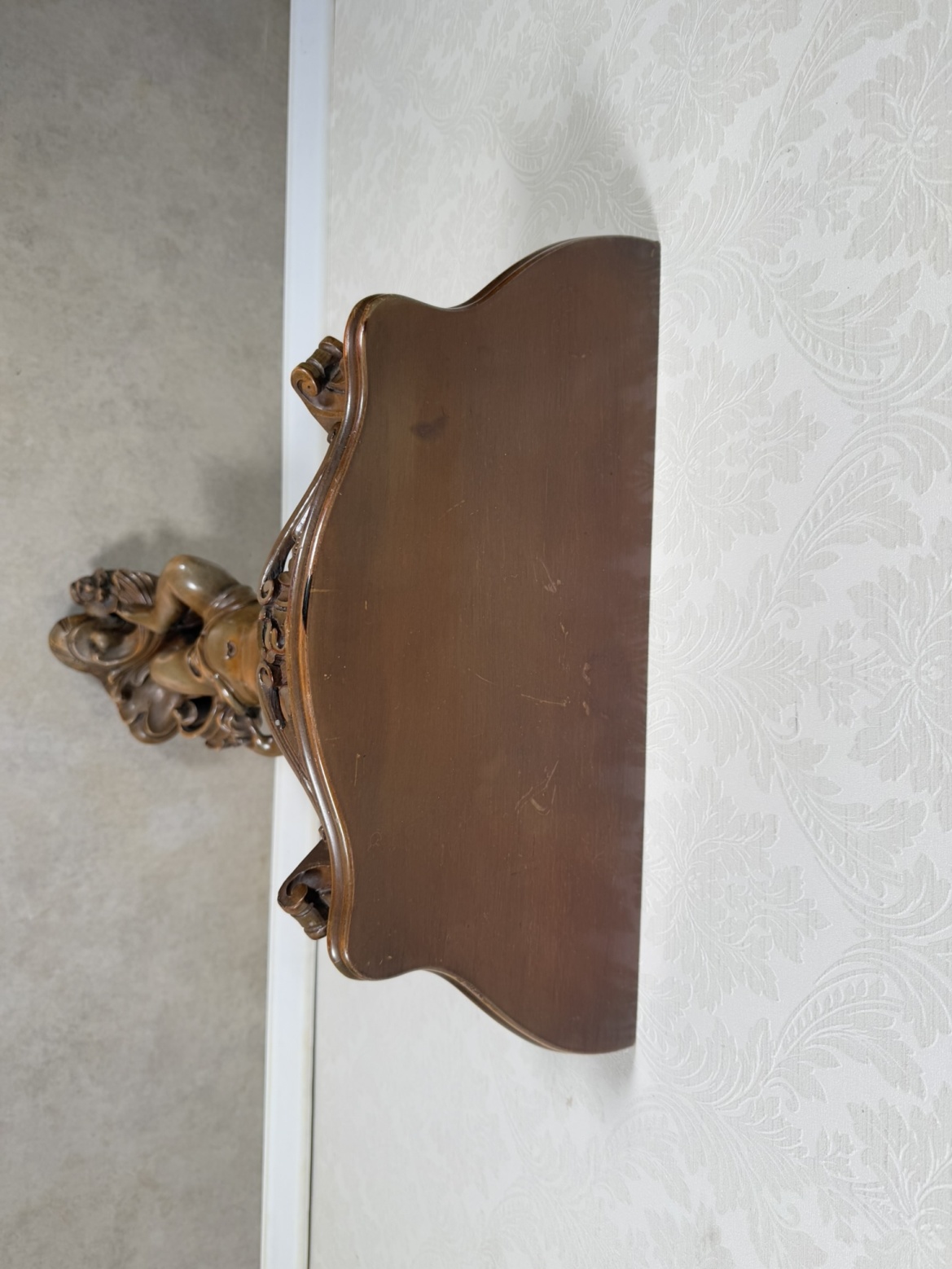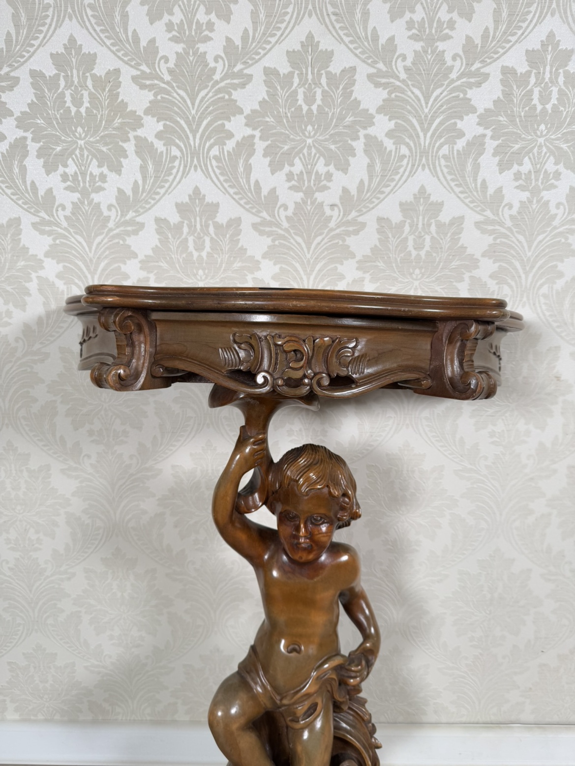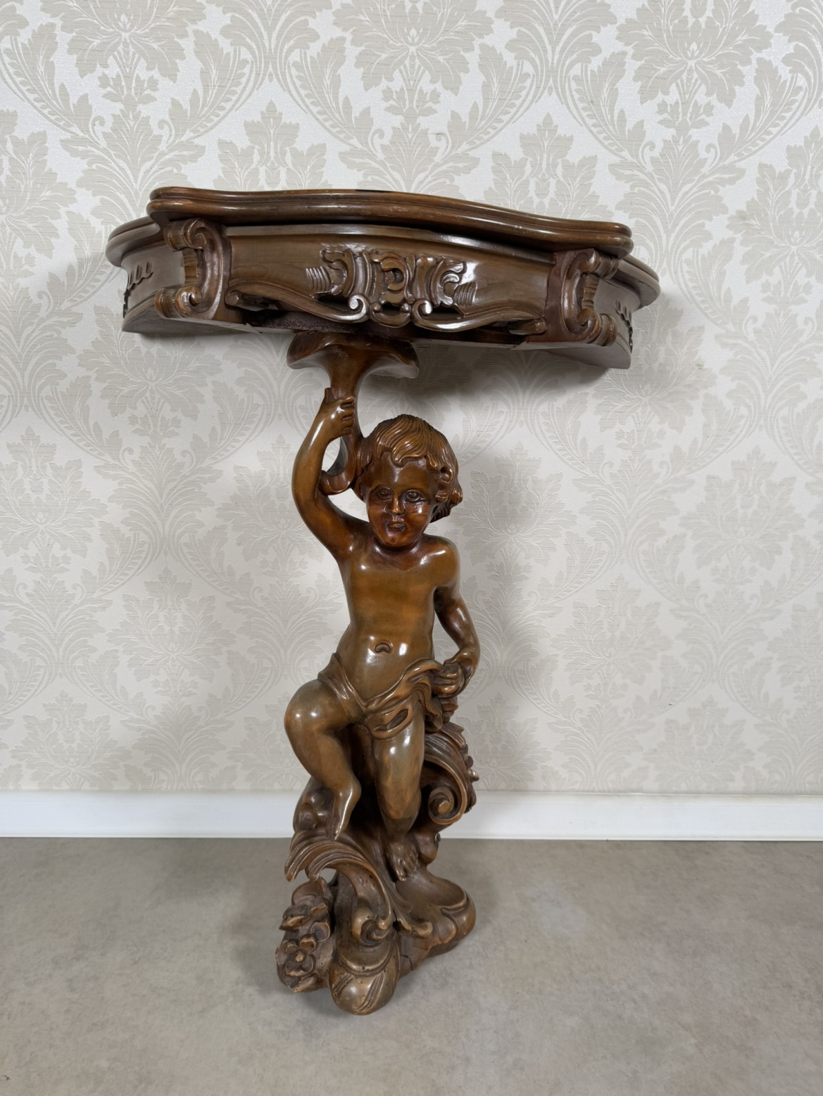 Elegantní konzolový stolek z masivního dřeva, nesený plastickou figurou putta (andílka). Postava v dynamickém pohybu drží bohatě zdobenou desku s profilovaným okrajem a ornamentální řezbou ve stylu rokoka.11 280 Kč