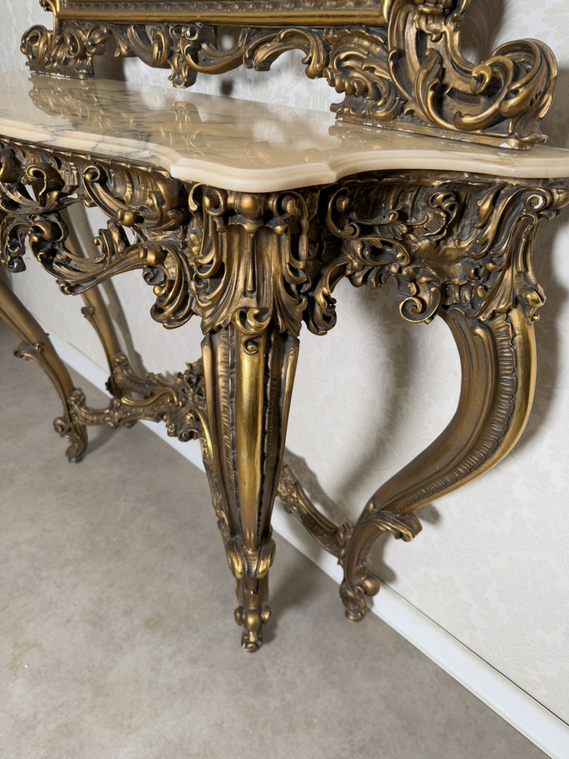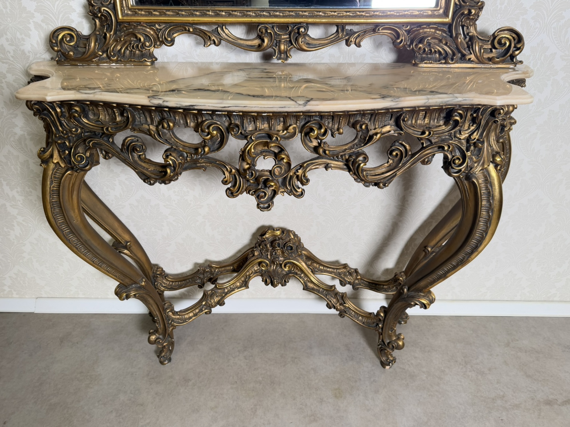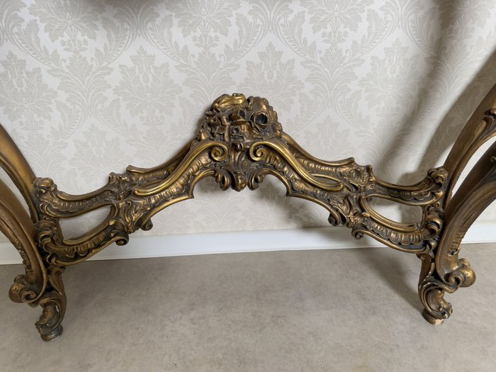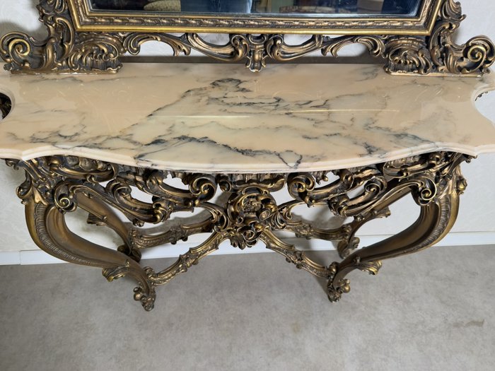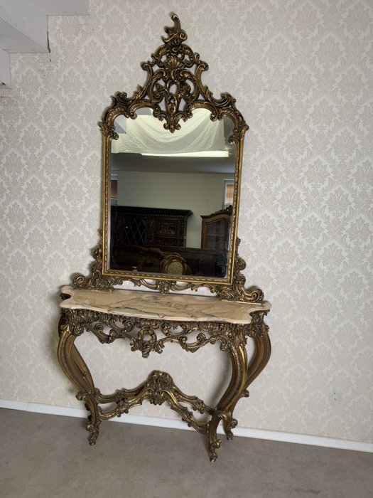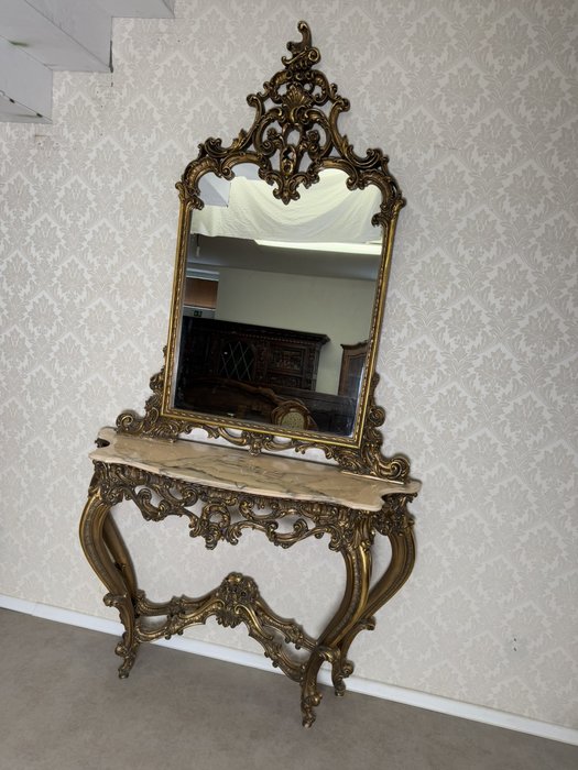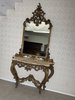 Impozantní nástěnná konzole se zrcadlem, vyrobená z bohatě řezaného dřeva se zlatou patinou. Horní deska z leštěného mramoru kontrastuje s dynamickým ornamentálním dekorem plným volut, lastur a rostlinných motivů. Celek stojí na elegantně prohnutých nohách. Rozměry stolku:130x40x95 , zrcadlo:120x6x157.29 890 Kč