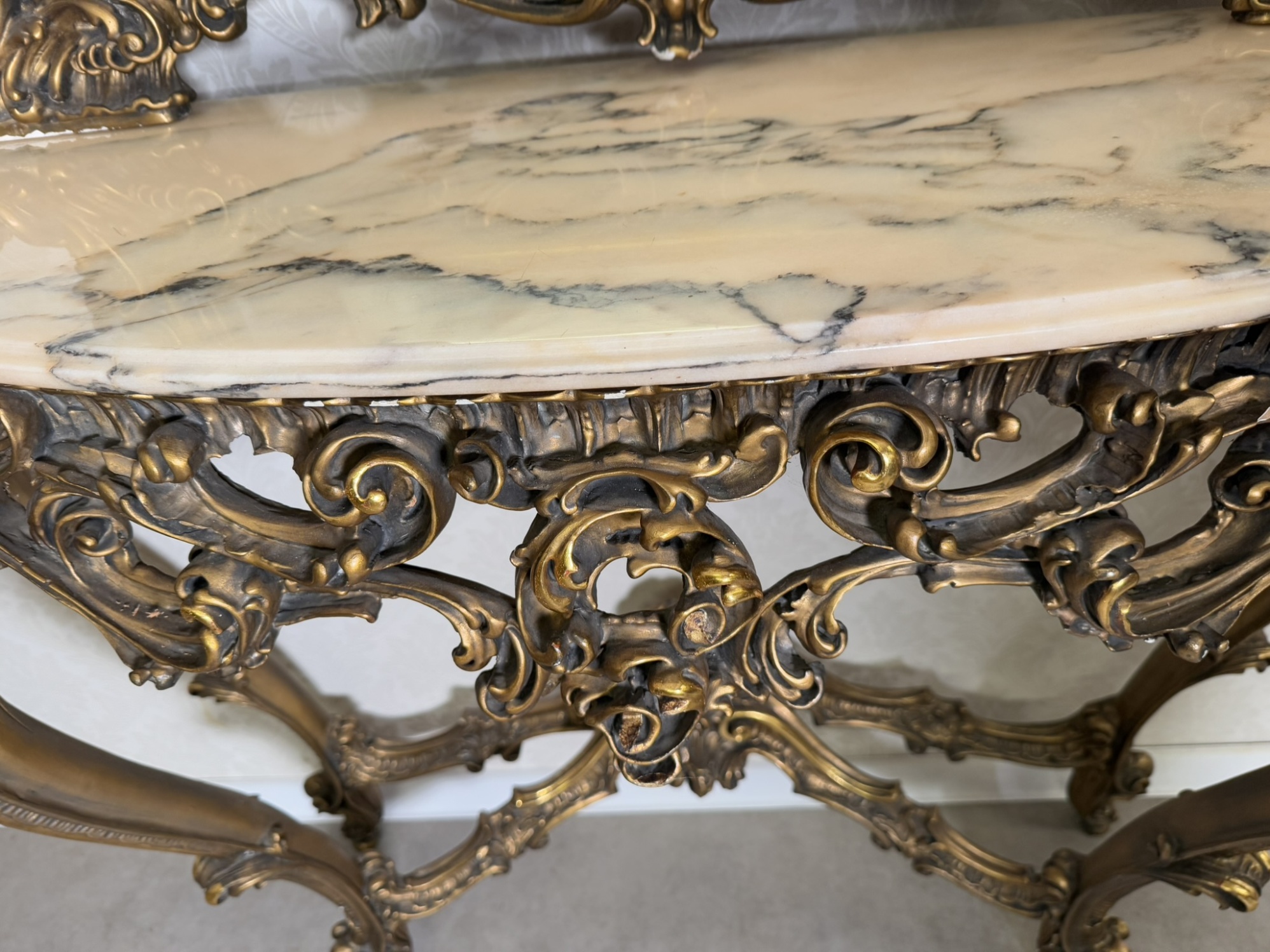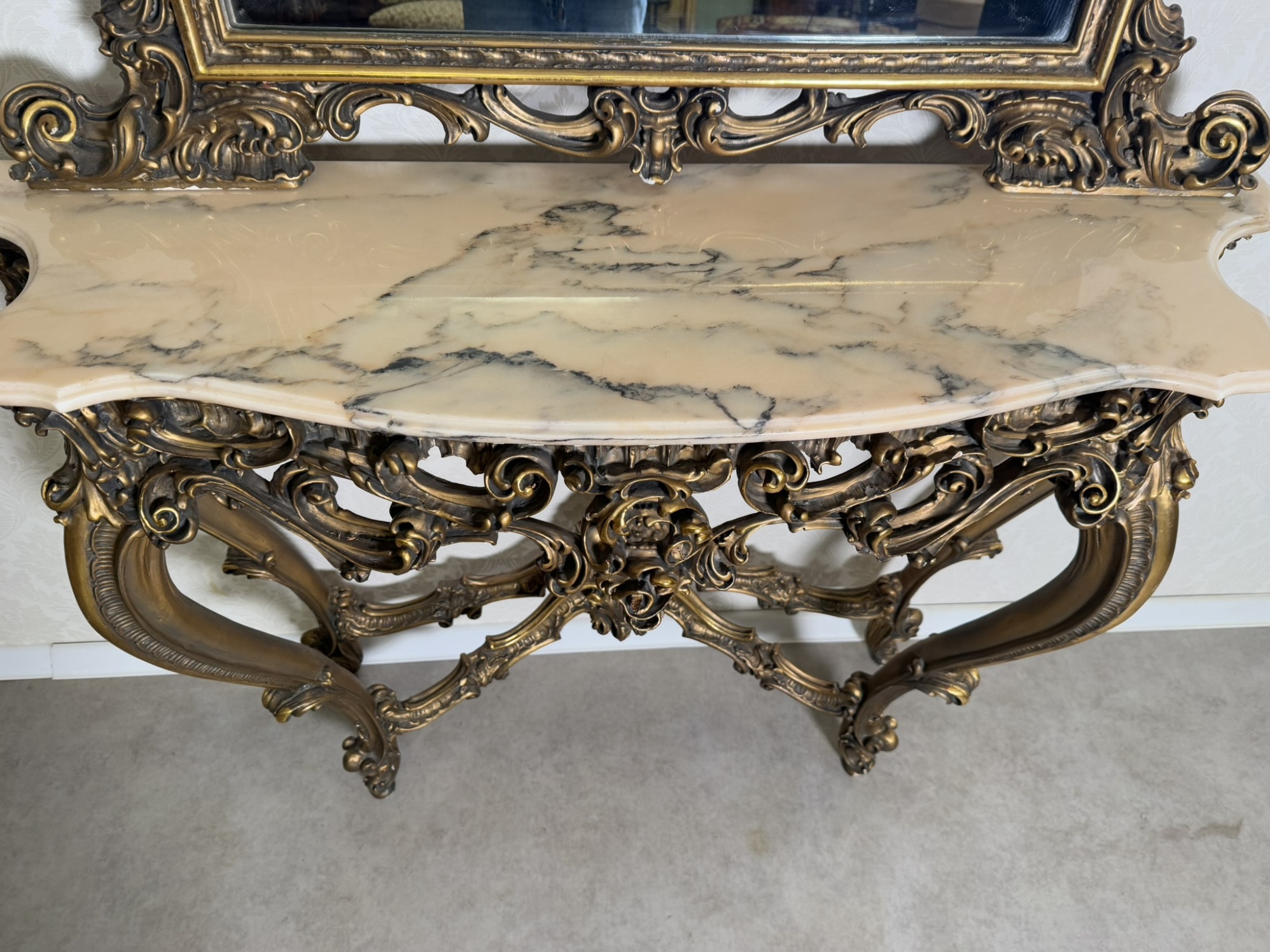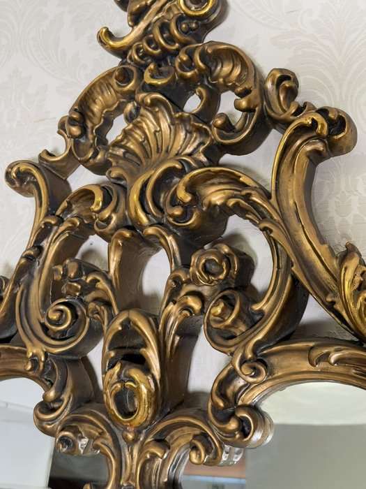 Impozantní nástěnná konzole se zrcadlem, vyrobená z bohatě řezaného dřeva se zlatou patinou. Horní deska z leštěného mramoru kontrastuje s dynamickým ornamentálním dekorem plným volut, lastur a rostlinných motivů. Celek stojí na elegantně prohnutých nohách. Rozměry stolku:130x40x95 , zrcadlo:120x6x157.29 890 Kč