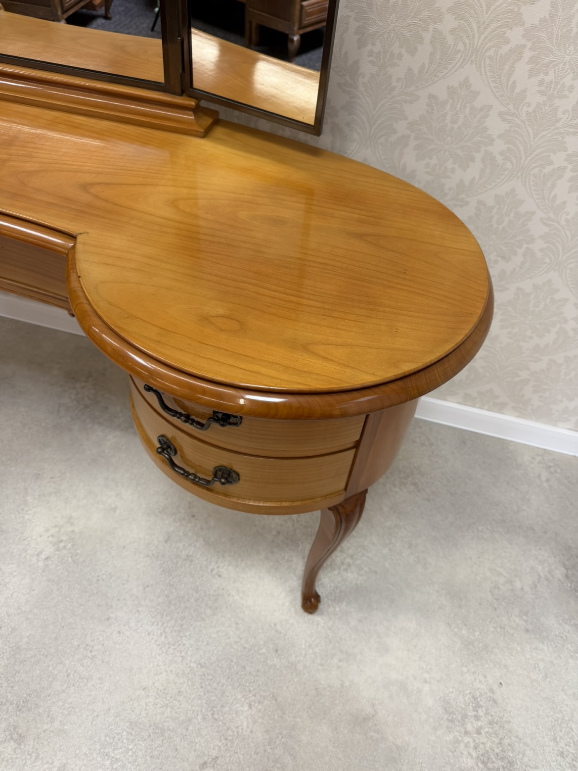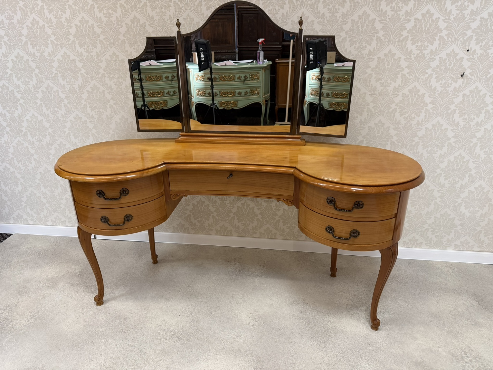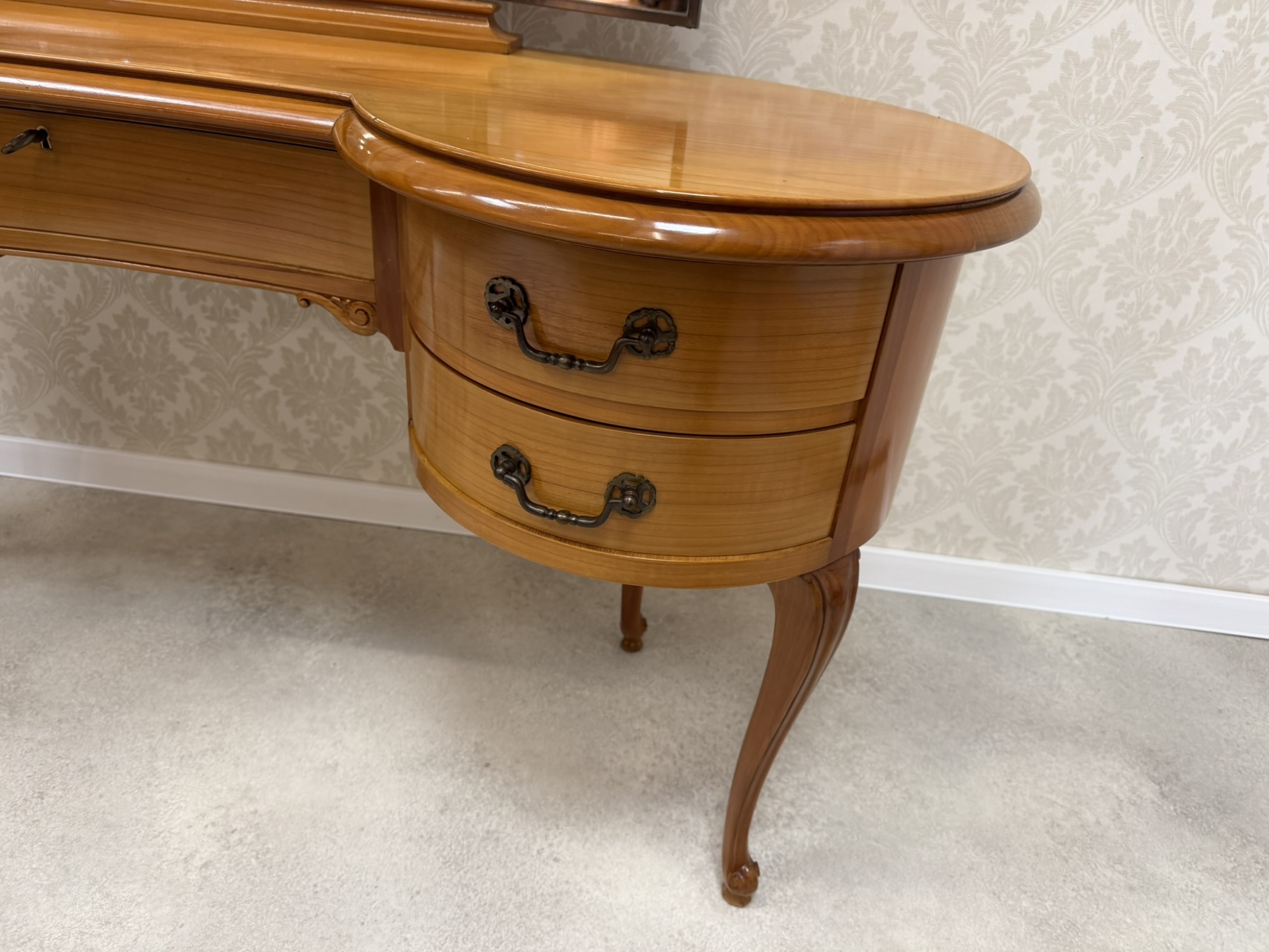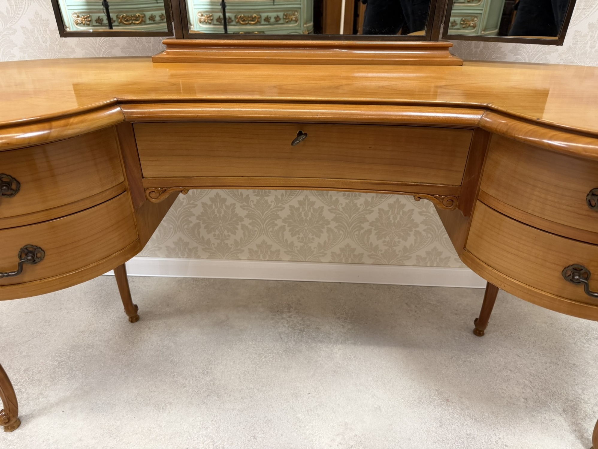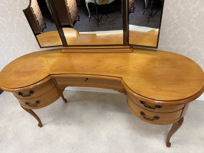 Lehký a elegantně působící kosmetický stolek s tvarovanou horní deskou a trojdílným zrcadlem, jehož boční části lze prakticky sklopit. Po stranách se nacházejí dvě obloukové části se čtyřmi zásuvkami, doplněné středovou zásuvkou.