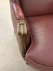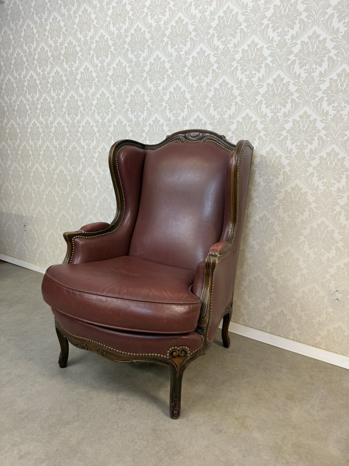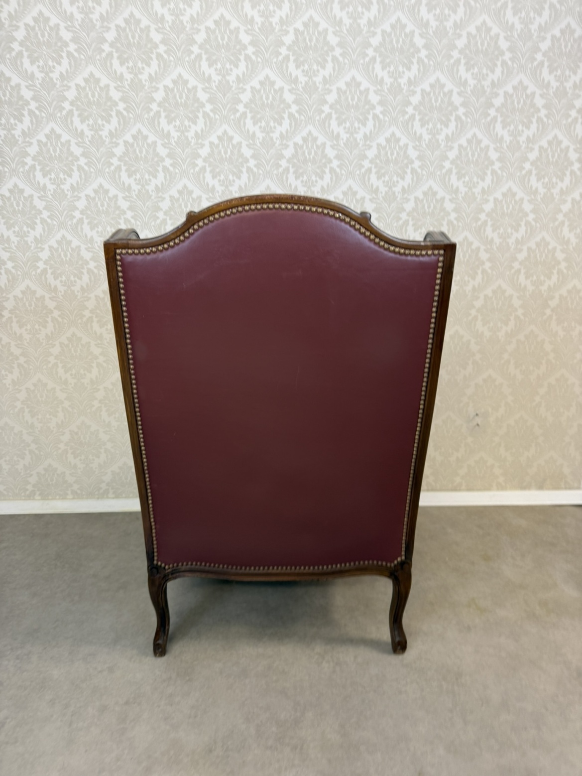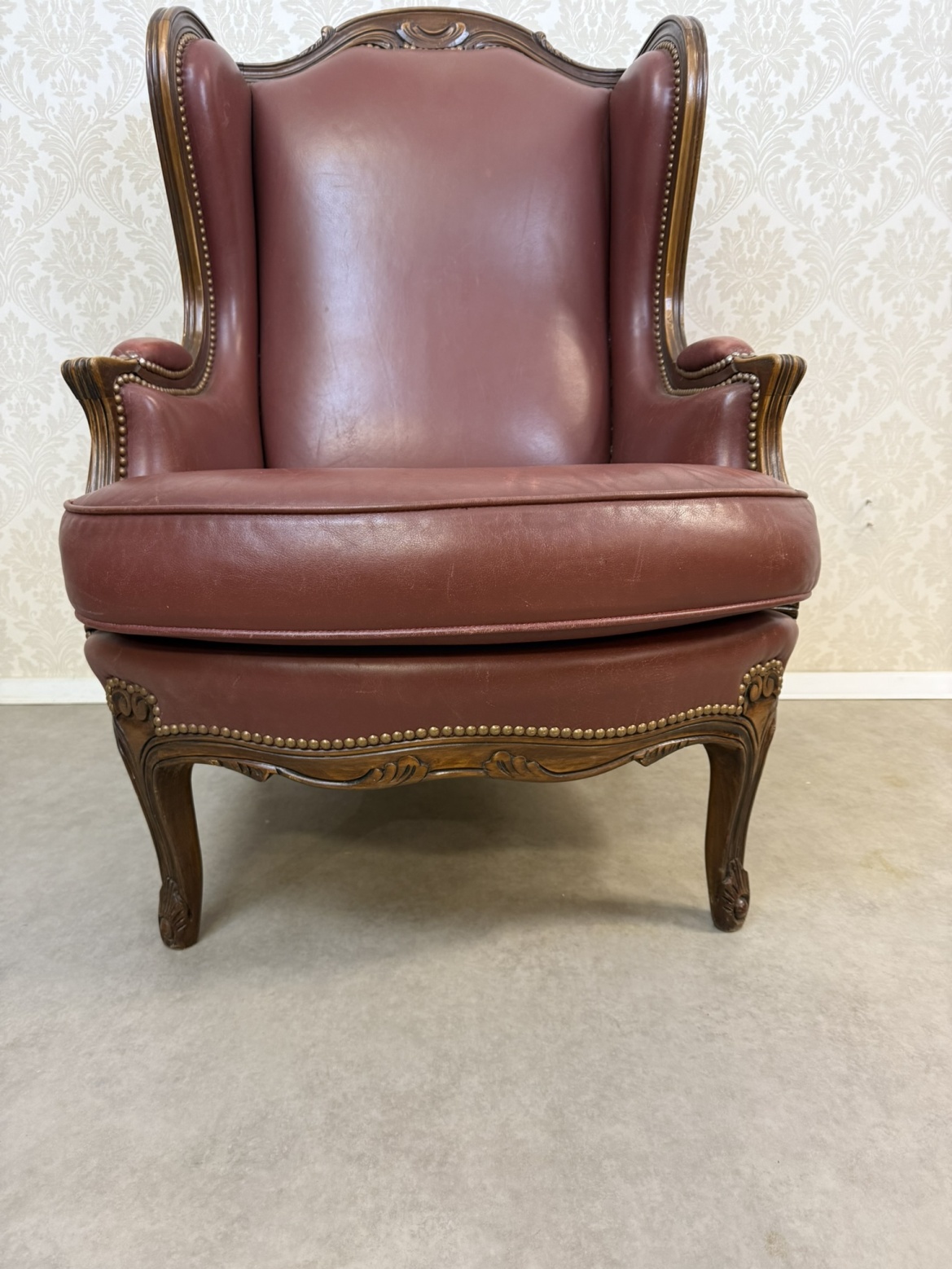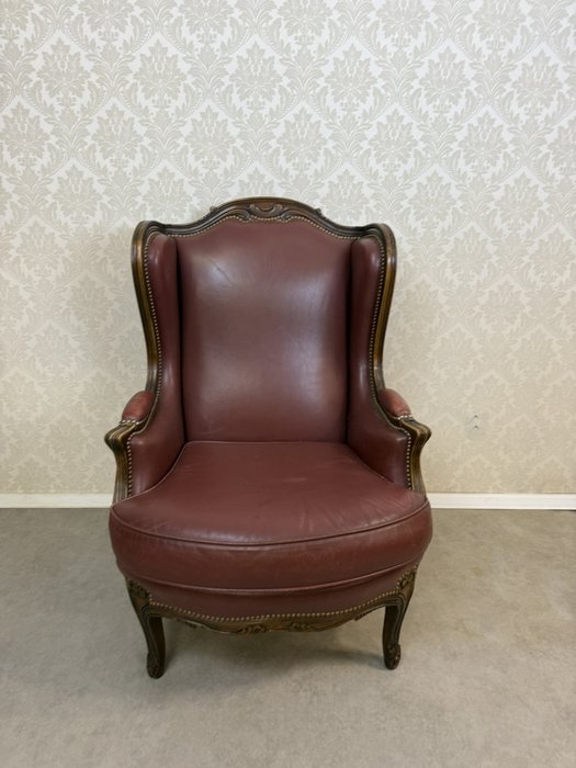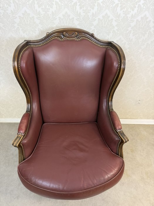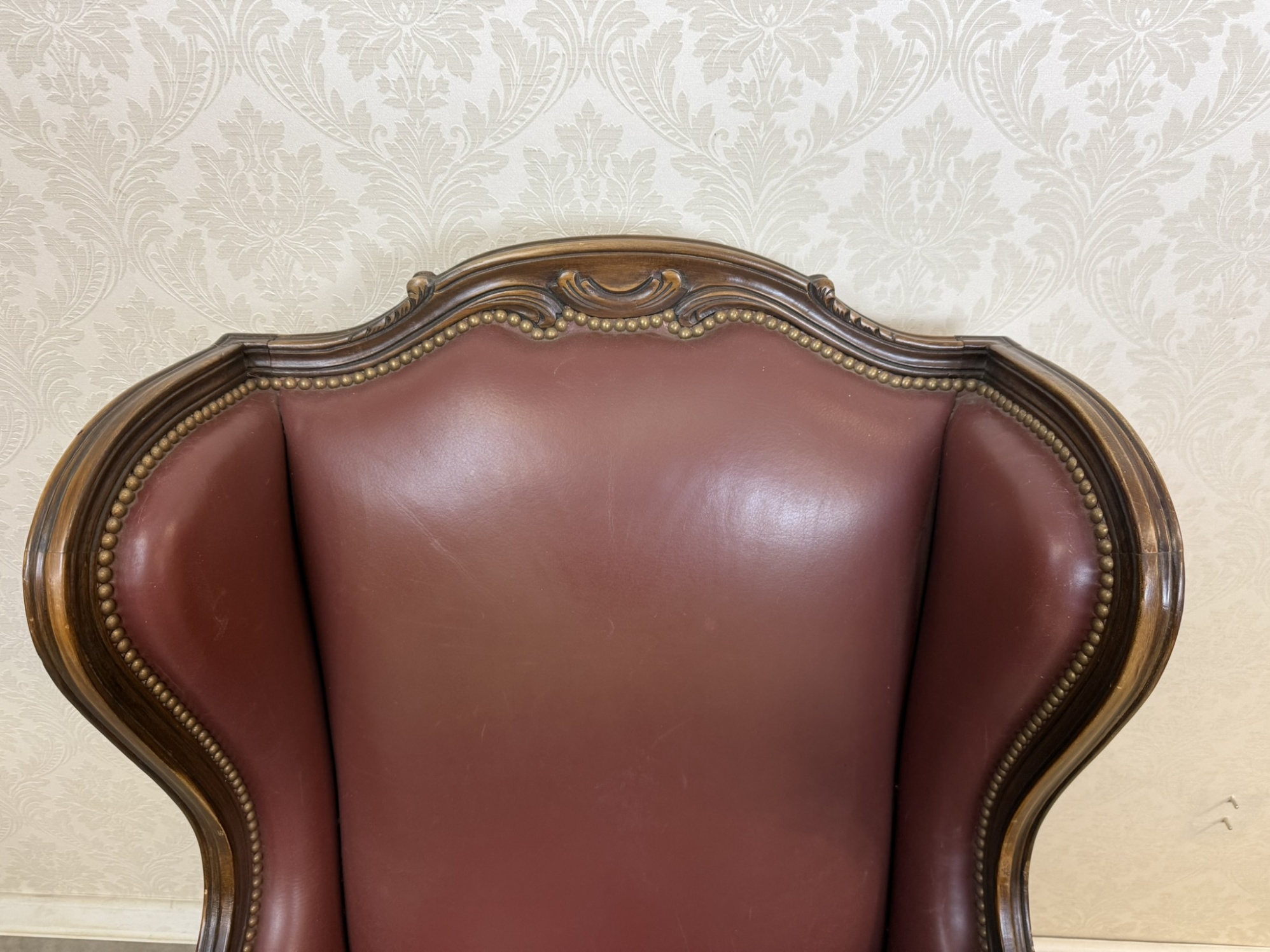 Elegantní kožené křeslo typu „ušák“ s bohatě tvarovanou dřevěnou konstrukcí. Bordó kožené čalounění je lemováno dekoračním hřebíčkovým zakončením po celém obvodu. Rám zdobí ručně vyřezávané detaily v horní části opěradla.