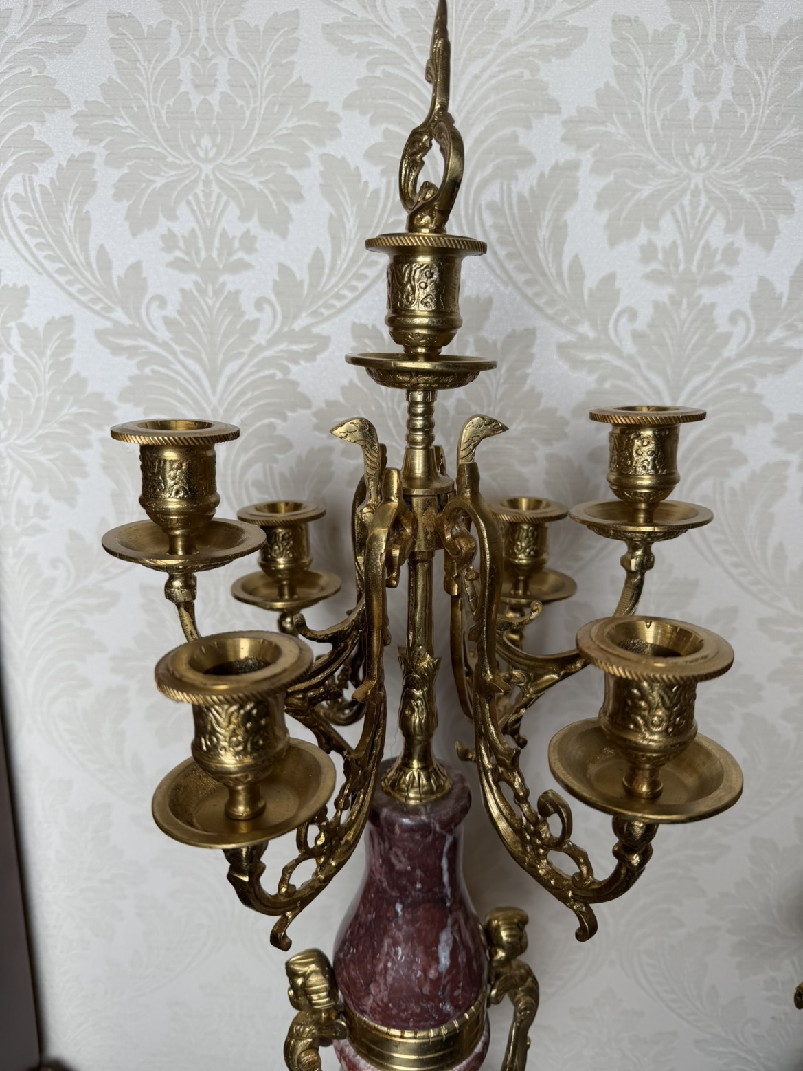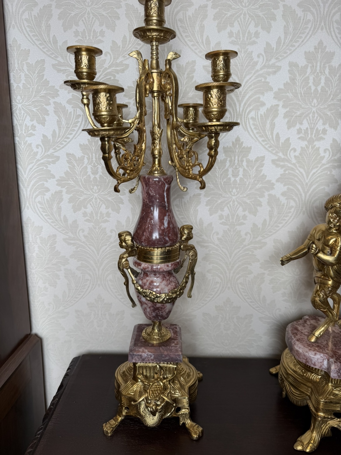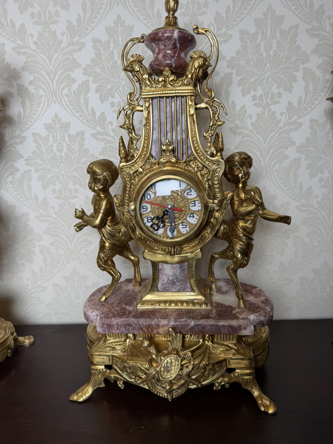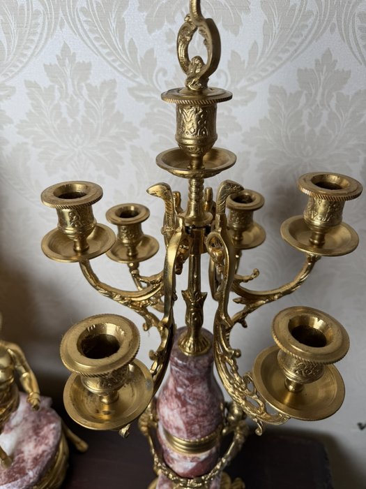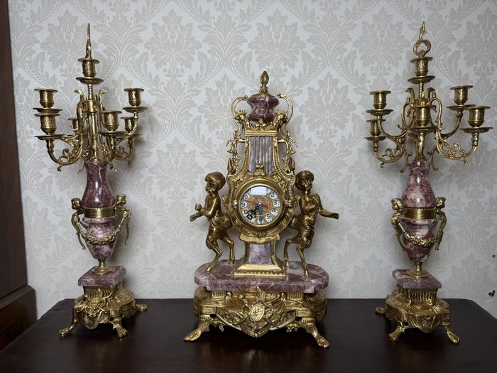 Reprezentativní souprava, tvořená krbovými hodinami a párem svícnů z bohatě zdobené mosazi a leštěného mramoru. Hodiny zdobí putti, ornamentální detaily a kontrastní kamenné prvky, které podtrhují luxusní charakter celku. Precizní řemeslné zpracování a harmonické proporce činí z této sestavy výrazný solitér pro klasické interiéry, salony či pracovny.