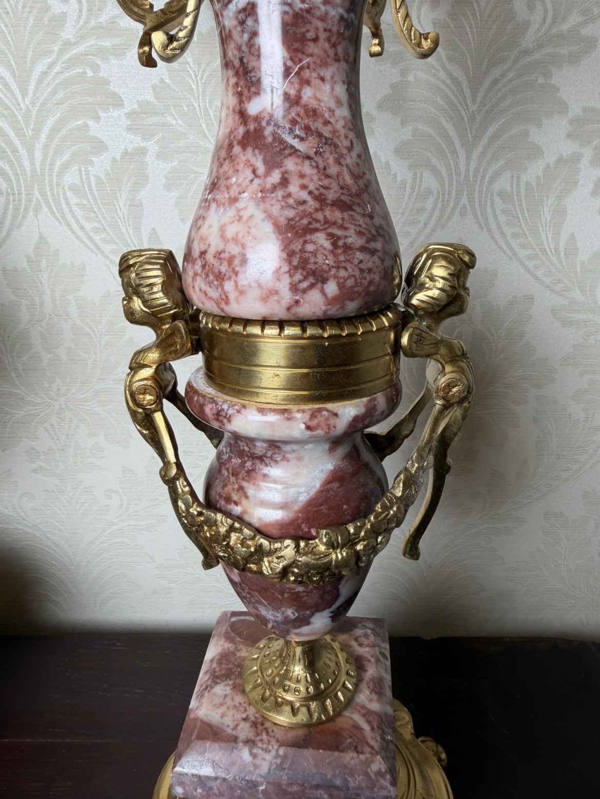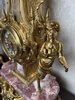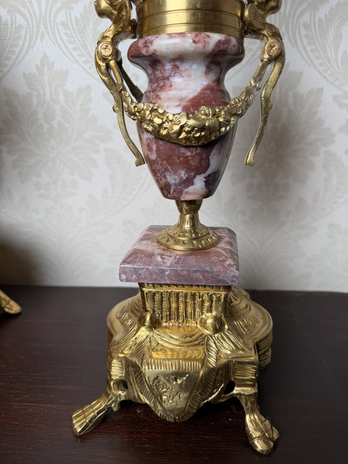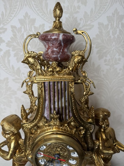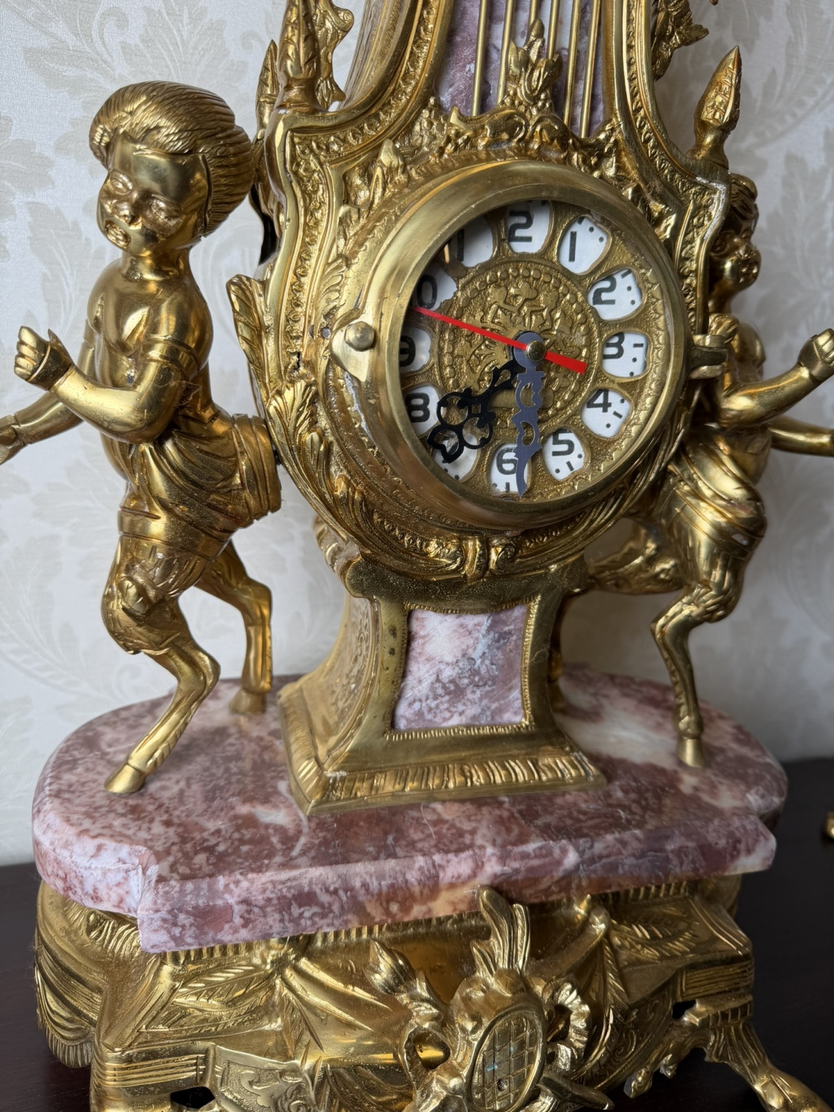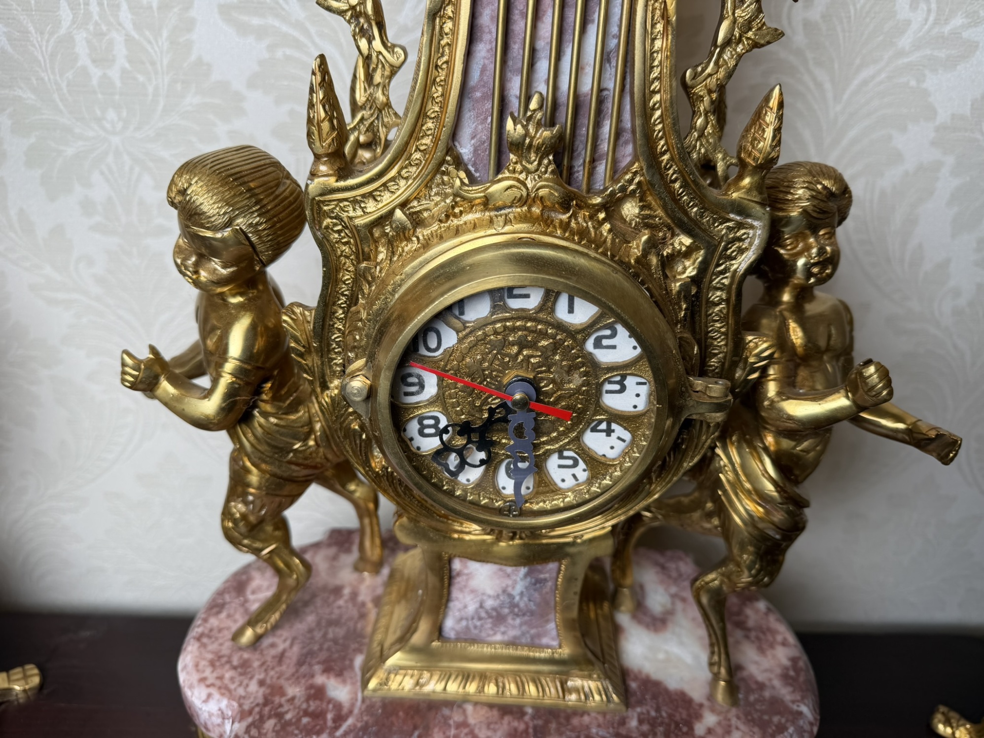 Reprezentativní souprava, tvořená krbovými hodinami a párem svícnů z bohatě zdobené mosazi a leštěného mramoru. Hodiny zdobí putti, ornamentální detaily a kontrastní kamenné prvky, které podtrhují luxusní charakter celku. Precizní řemeslné zpracování a harmonické proporce činí z této sestavy výrazný solitér pro klasické interiéry, salony či pracovny.