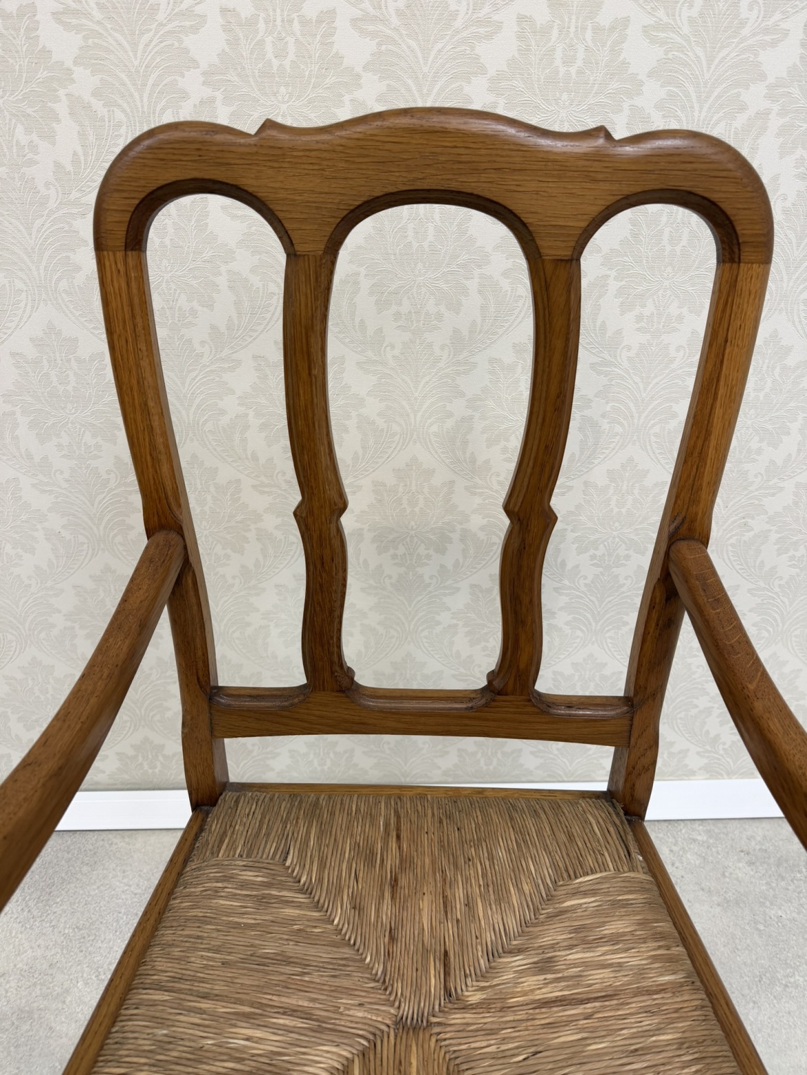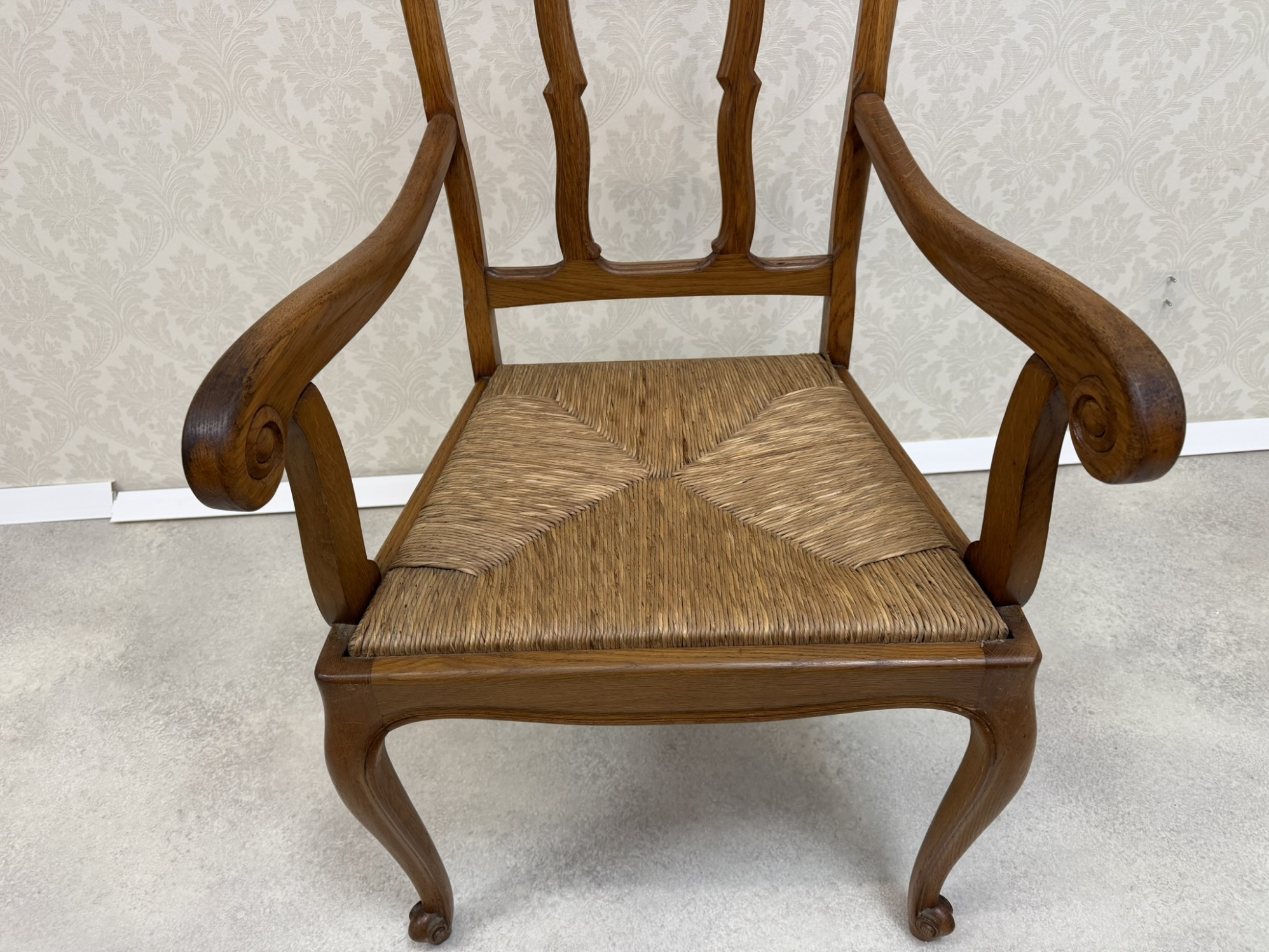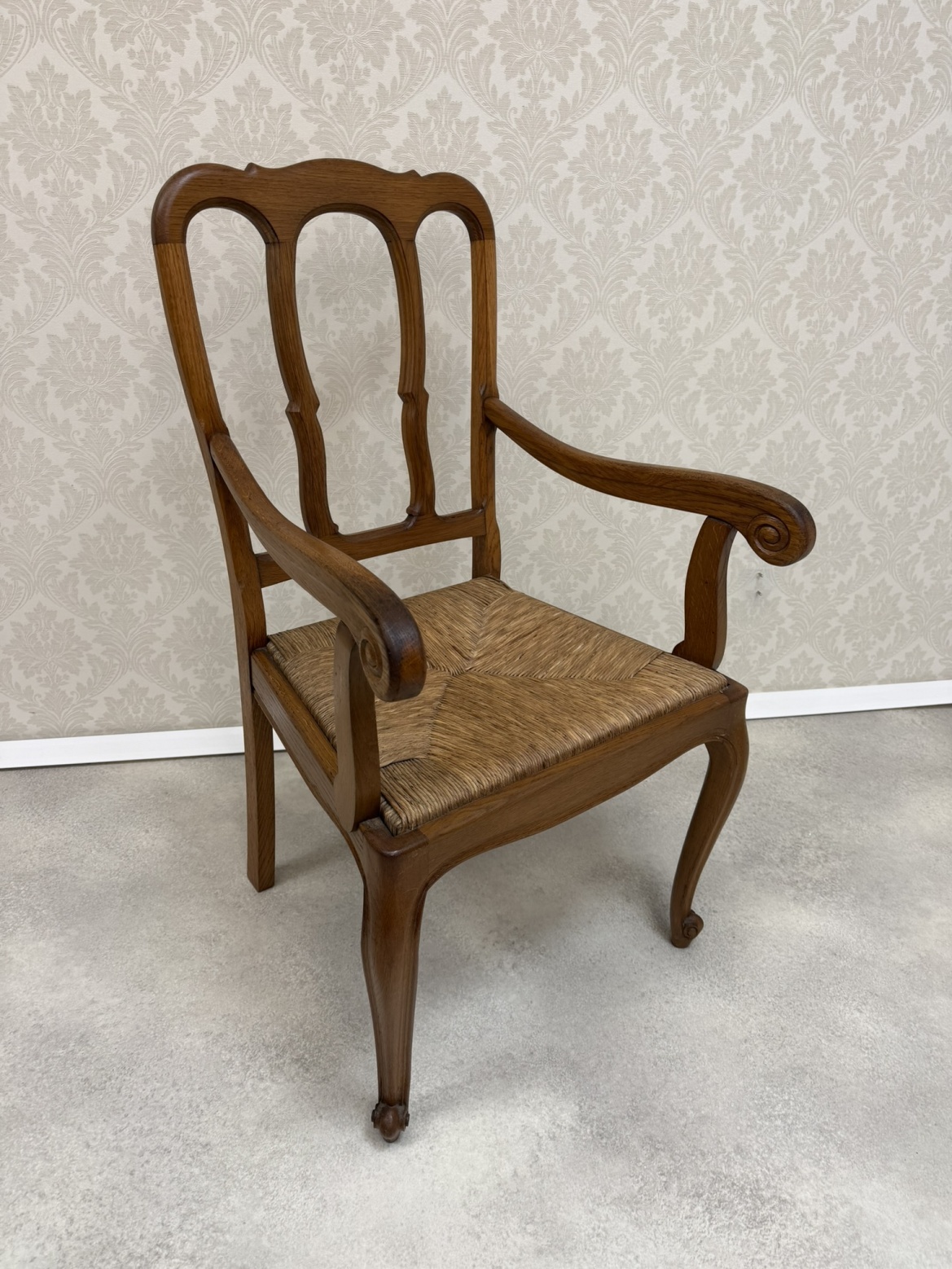 Křesílko s tvarovanými nohami, opěrkou, členěnou do tří polí a vyplétaným sedákem z přírodního materiálu. Područky zakončené dekorem do spirály.