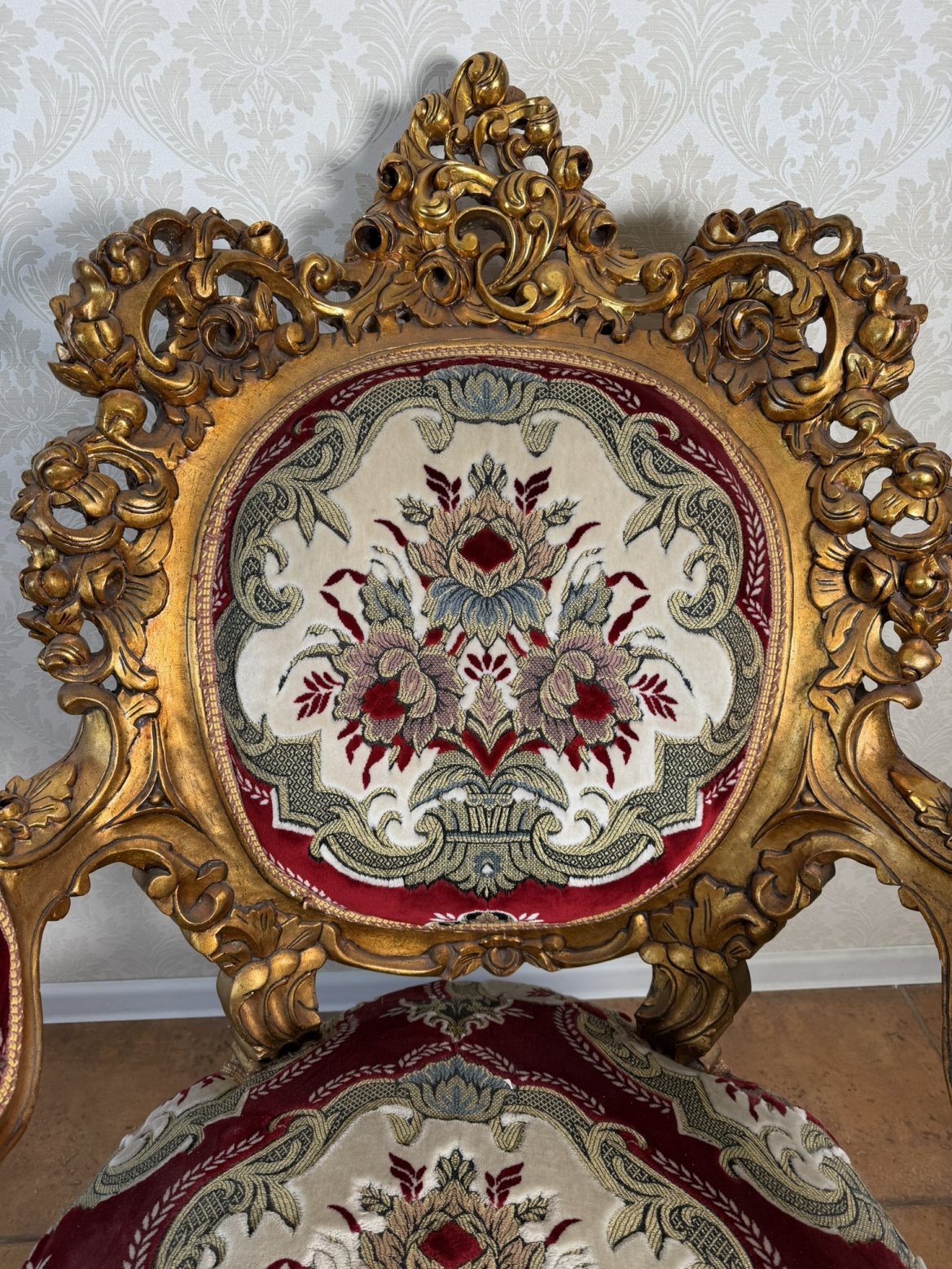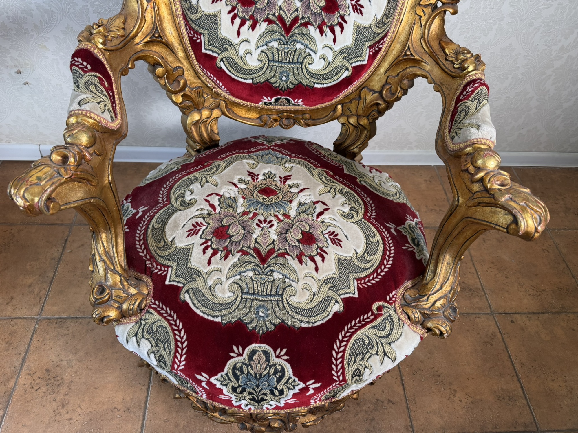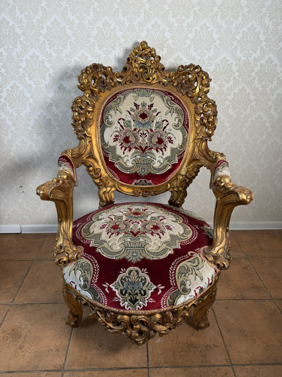 Sedák i opěrák křesla jsou čalouněny textilií s květinovým motivem což křeslu dodává slavnostní a reprezentativní vzhled. Křeslo vynikne jako elegantní solitér v klasickém interiéru, salonu nebo reprezentační místnosti. Díky masivní konstrukci je nejen dekorativní, ale i plně funkční.9 450 Kč