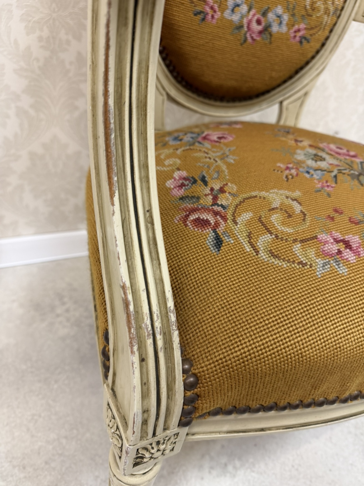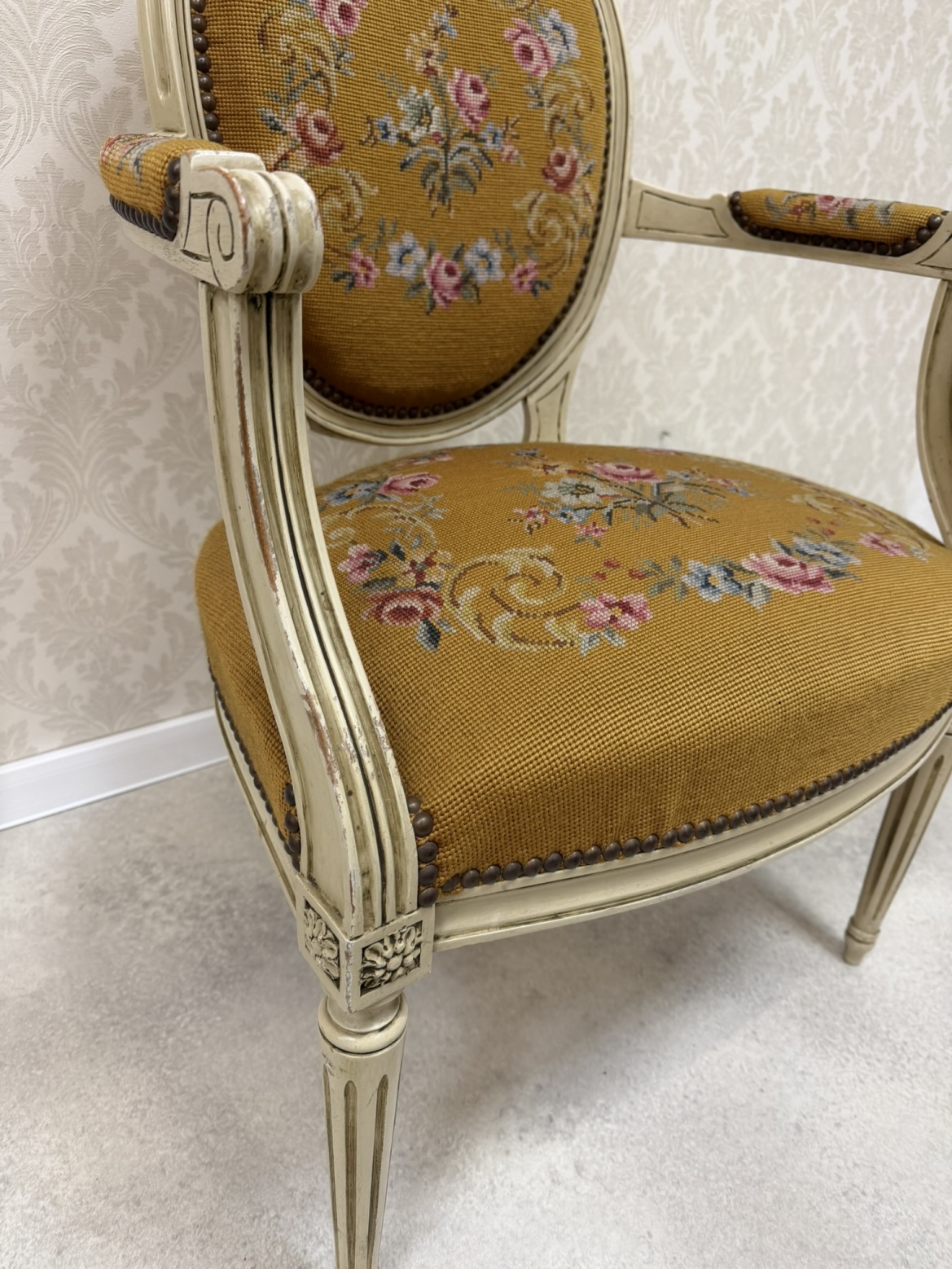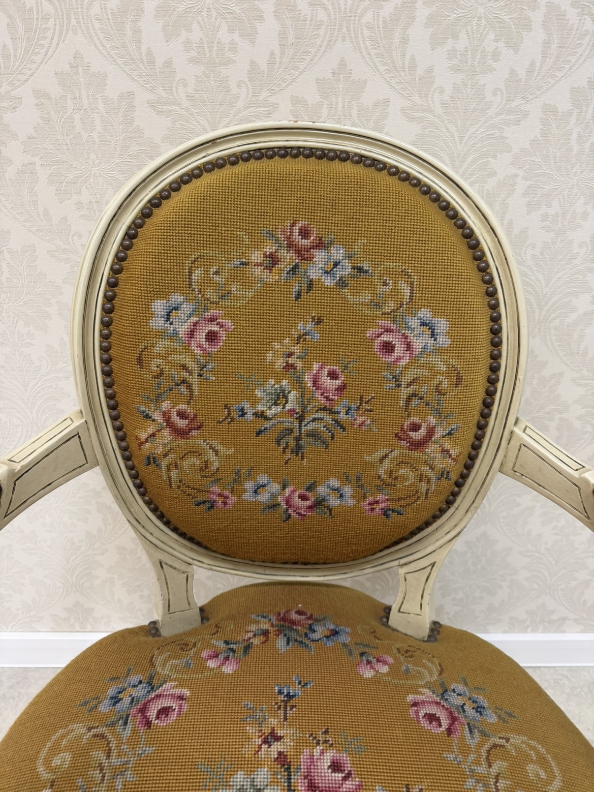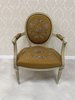 Křeslo s bohatým květinovým čalouněním. Rám je lakovaný v krémově bílé barvě s mírným patinováním, které zvýrazňuje vyřezávané detaily. Oválné opěradlo a sedák jsou čalouněné gobelínovou látkou s motivem růžových a modrých květin.3 970 Kč