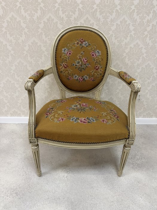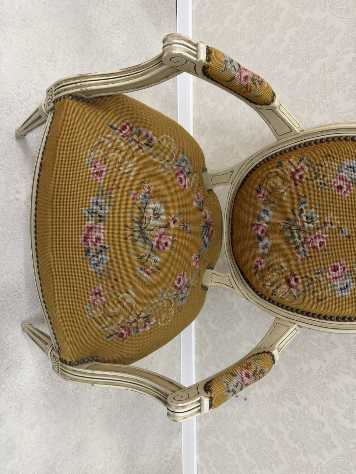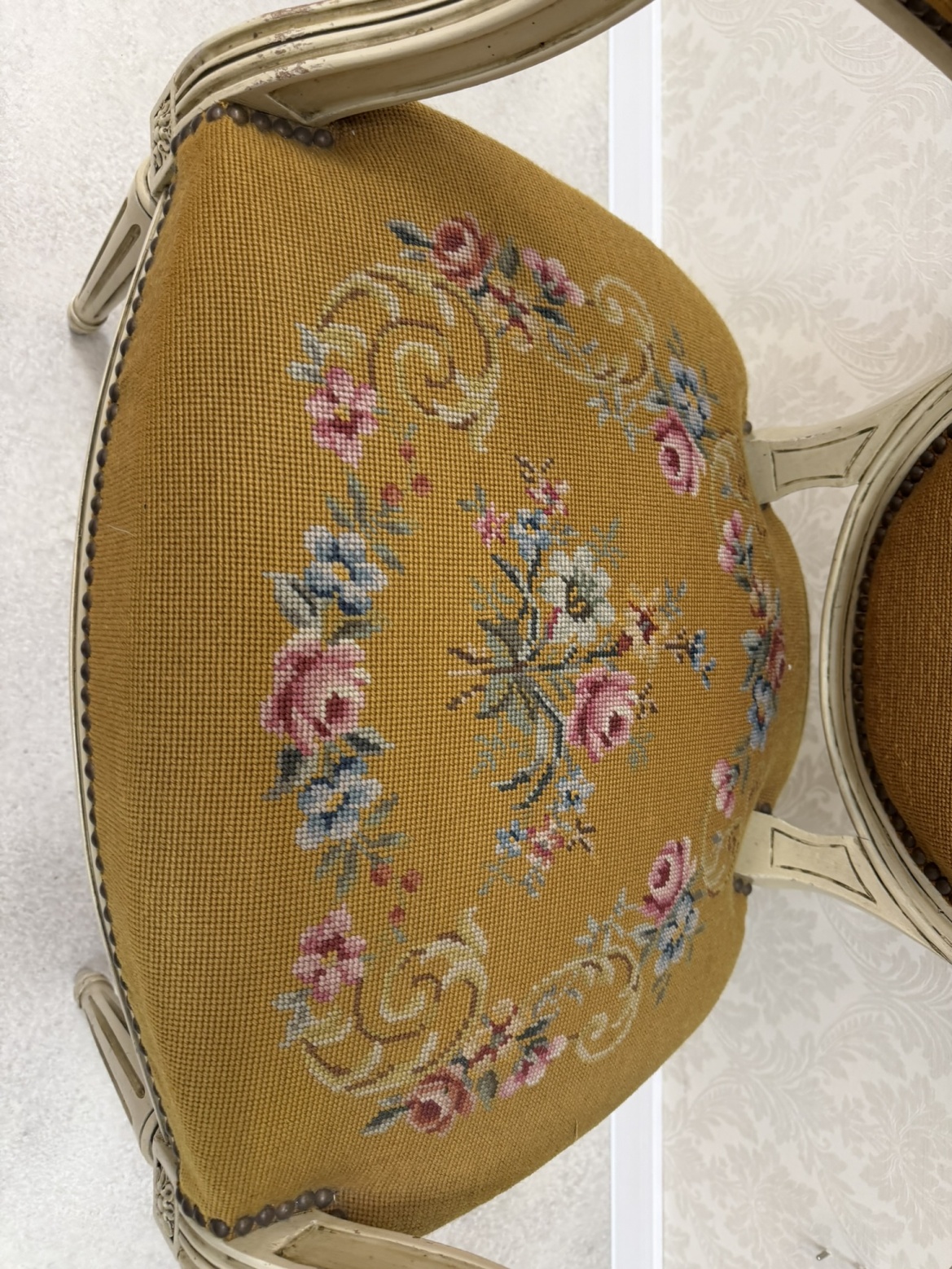 Křeslo s bohatým květinovým čalouněním. Rám je lakovaný v krémově bílé barvě s mírným patinováním, které zvýrazňuje vyřezávané detaily. Oválné opěradlo a sedák jsou čalouněné gobelínovou látkou s motivem růžových a modrých květin.3 970 Kč