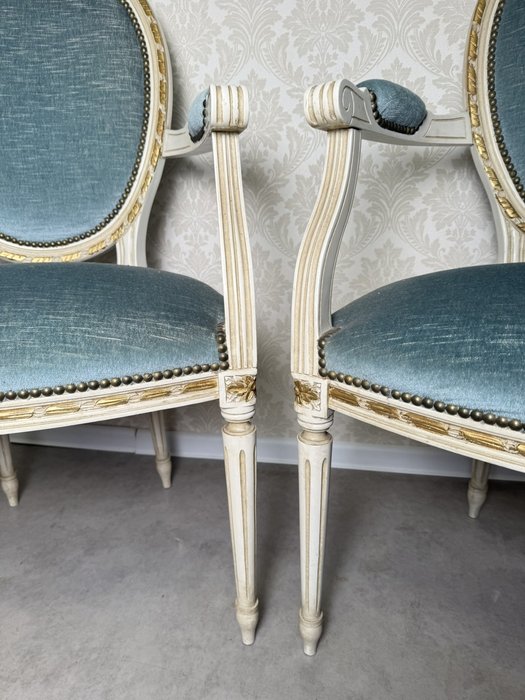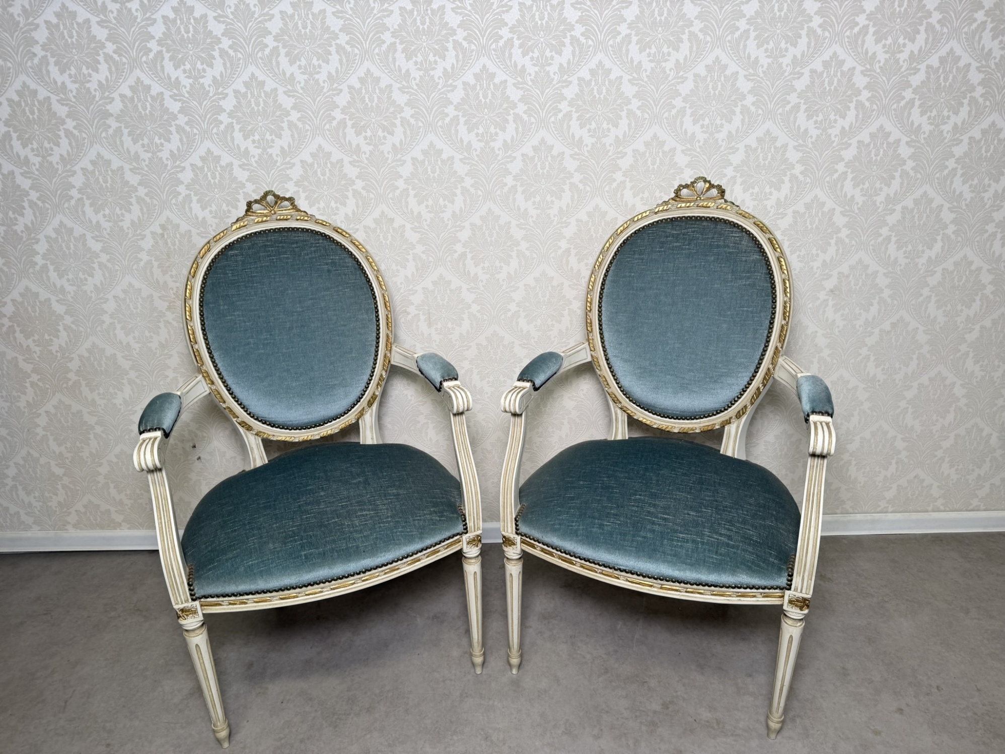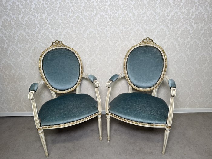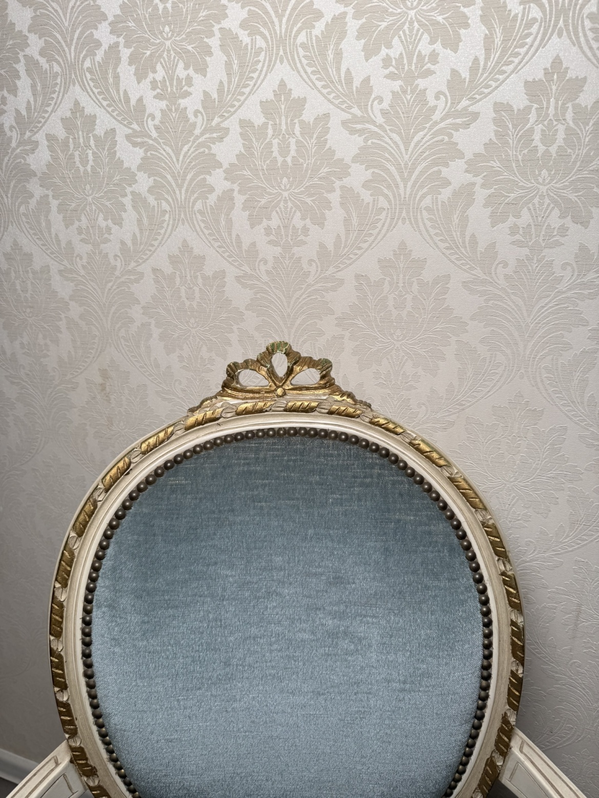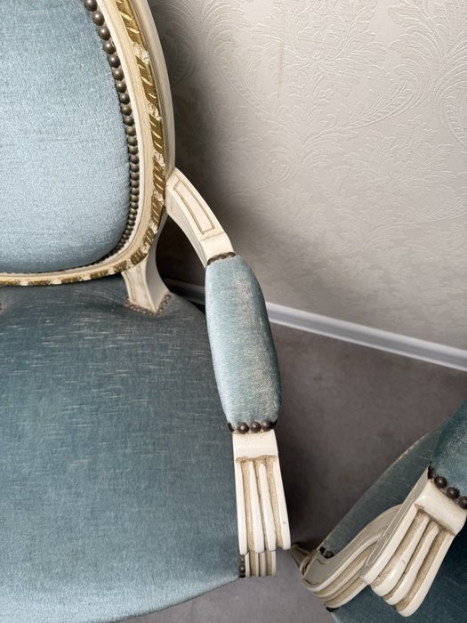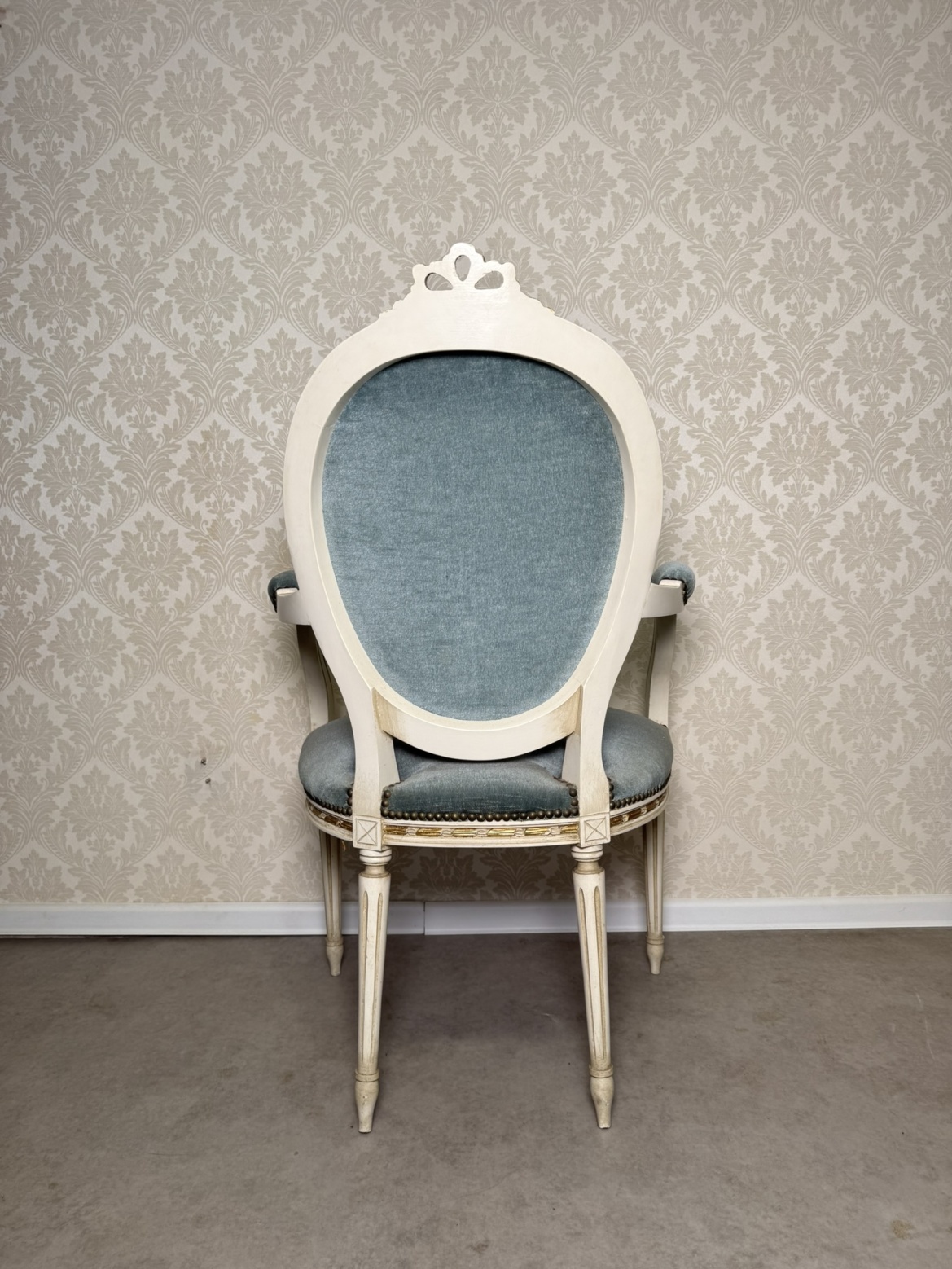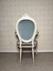 Elegantní křeslo s výrazným oválným opěradlem, zdobeným jemným dekorem a jemně profilovanými nohami. Čalounění kontrastuje s bílou patinovanou konstrukcí.Výška sedu je 45 cm.4 350 Kč