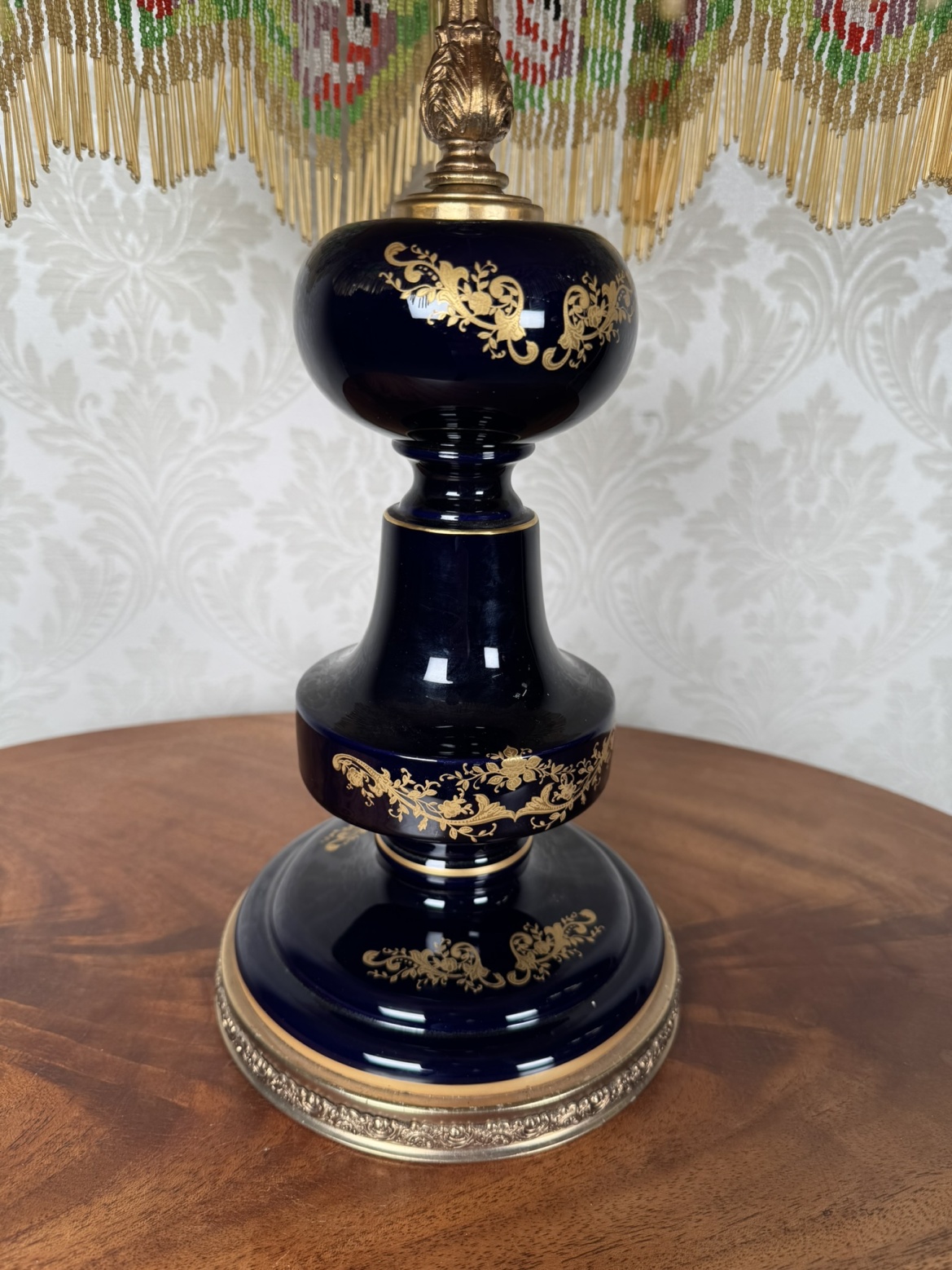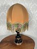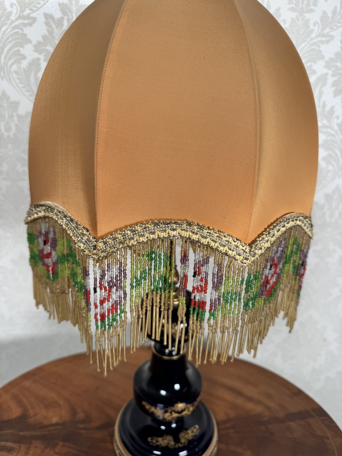 Dekorativní stolní lampa s textilním stínidlem v měděném odstínu, zdobeným korálkovou bordurou s květinovým vzorem. Tělo lampy je z tmavého skla s lesklým povrchem v kobaltovém tónu.4 380 Kč