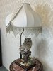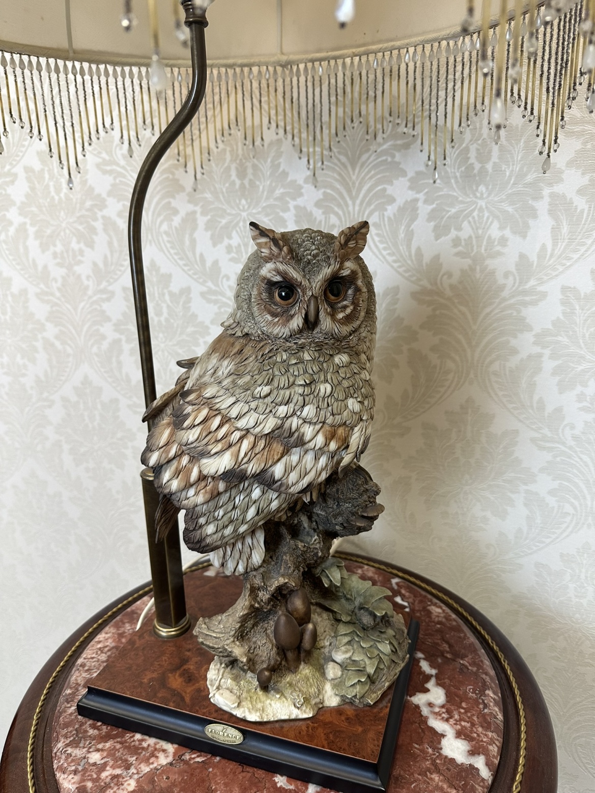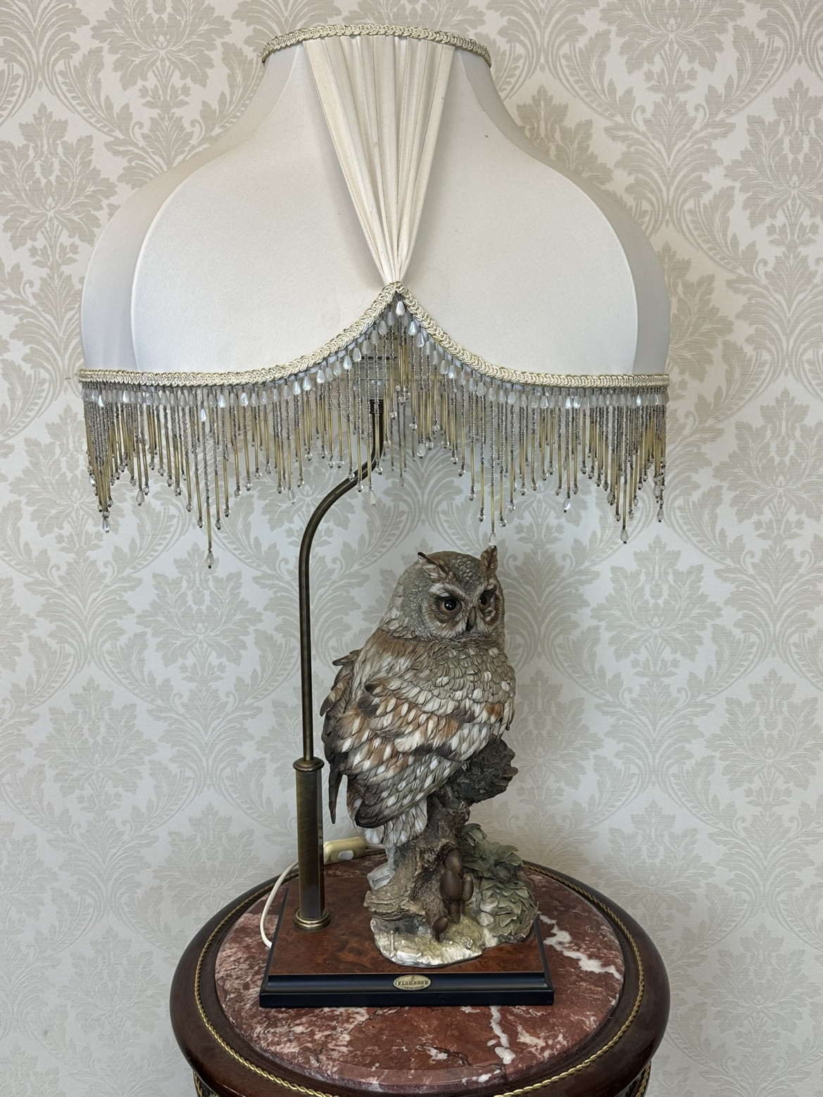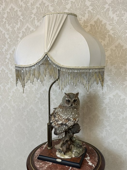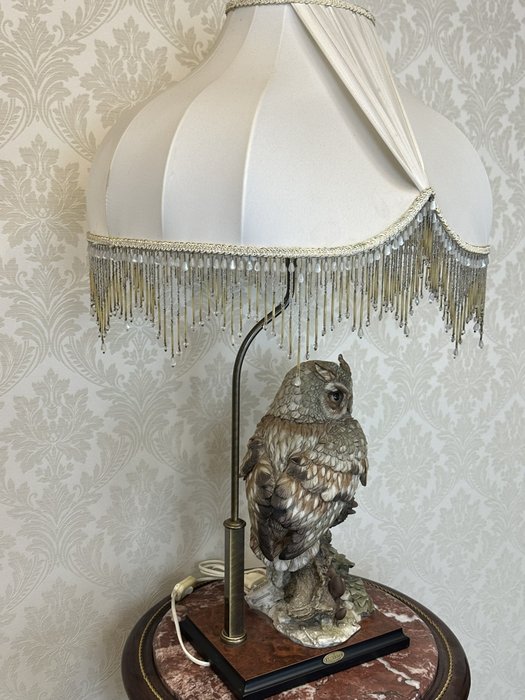 Stolní lampa s bílým textilním stínidlem zdobeným třásněmi, usazená na základně s realistickou figurou sovy od sochaře Giuseppe Armaniho. Porcelánová plastika je detailně propracovaná a nese značku Florence, limitovaná edice č. 2235/5000.17 990 Kč