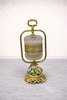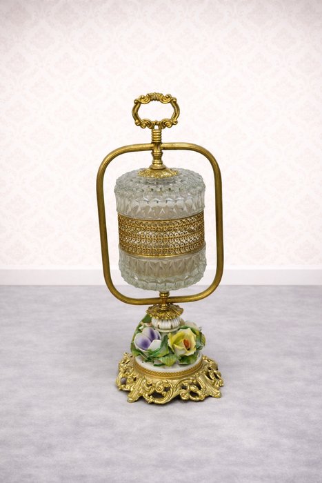 Stínidlo je zasazeno do ozdobného kovového rámu. Podstavec lampy je zdoben jemnými květinovými motivy a zlatými detaily.