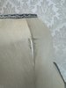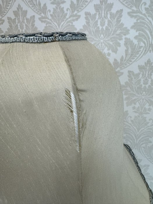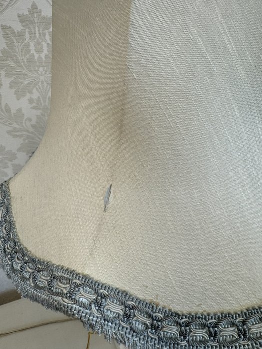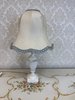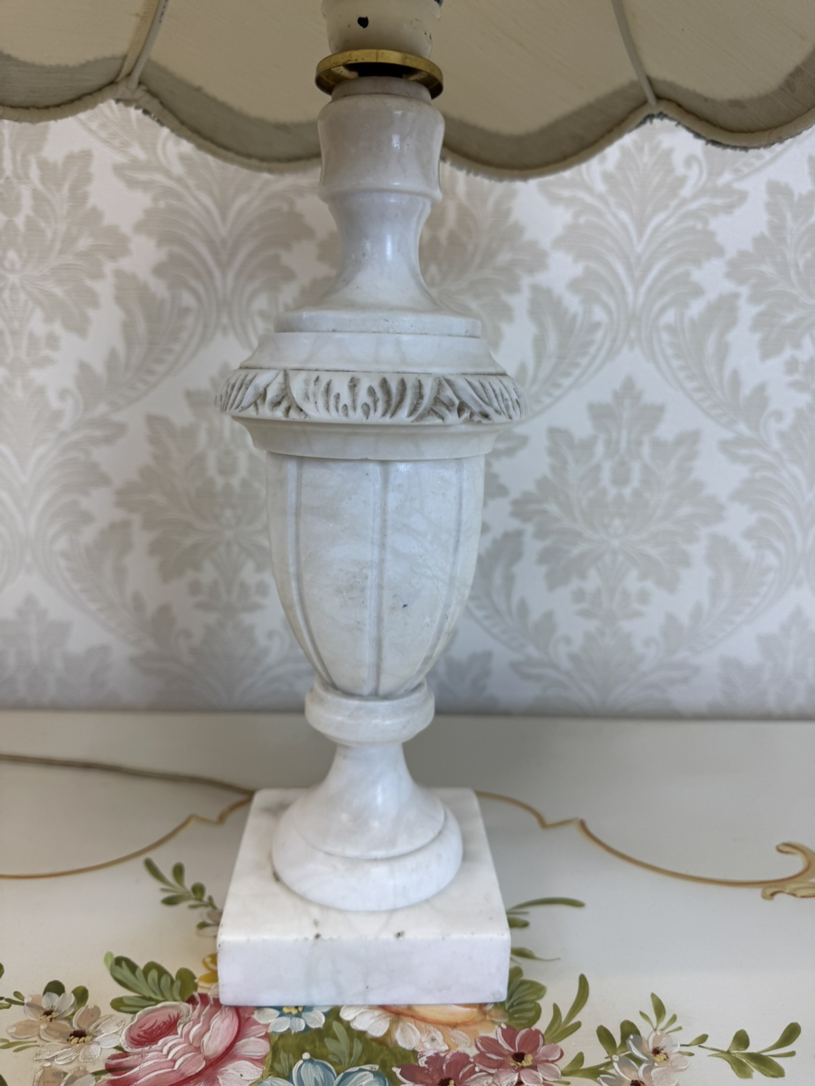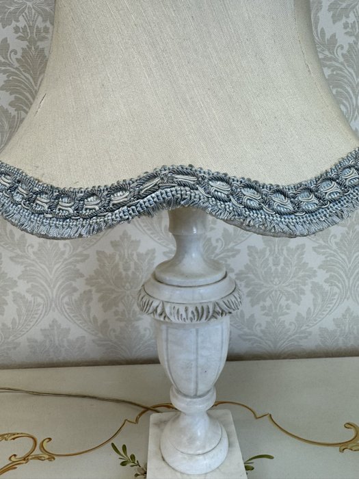 Stolní lampa s masivním podstavcem z bílého leštěného mramoru a tvarovaným textilním stínidlem lemovaným modrošedou bordurou. Stínidlo vykazuje místy poškození látky. Celek působí decentně a jemně.1 480 Kč