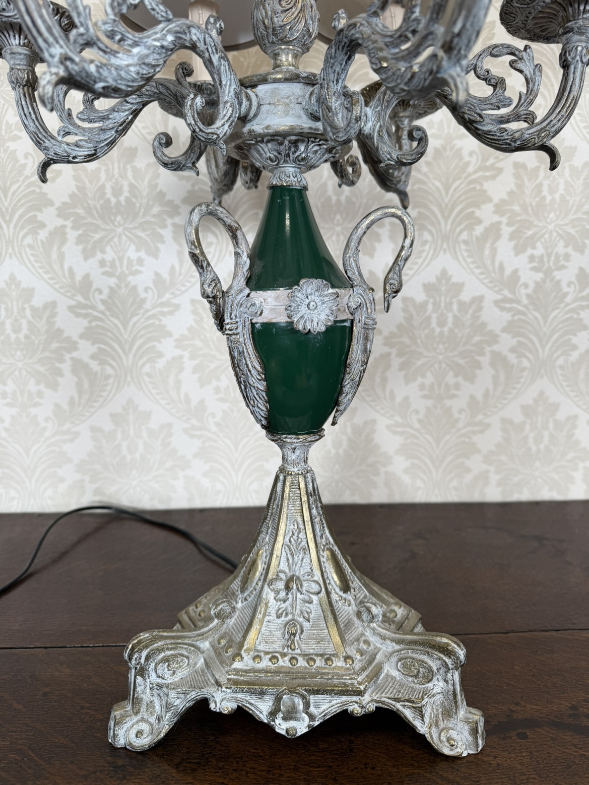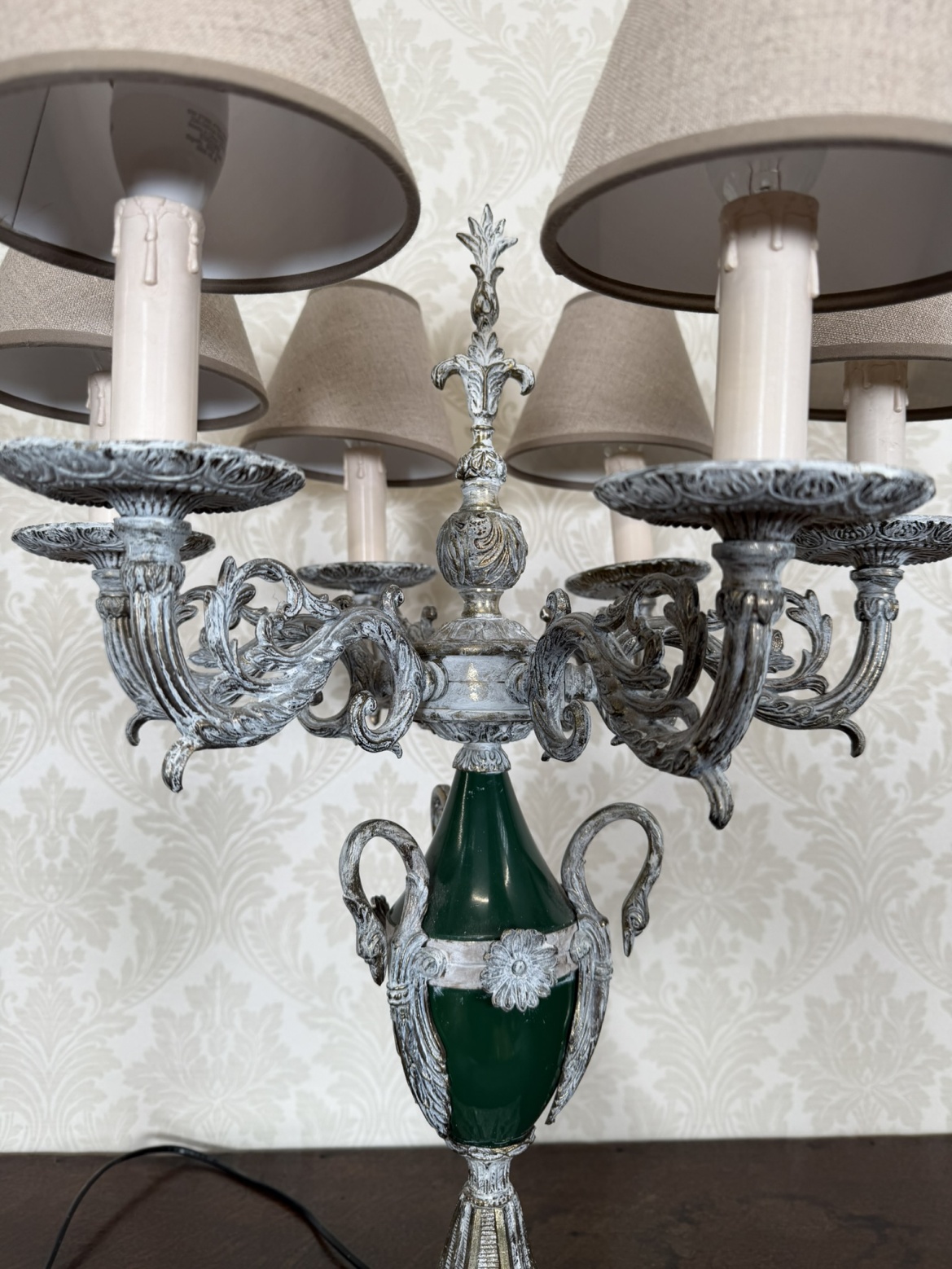 Stolní lampa s rameny ve tvaru klasicistního svícnu, s bohatě tvarovaným kovovým tělem, stříbřitě patinovaným povrchem a zeleným skleněným středem. Textilní stínidla doplňují výrazný dekor a podtrhují slavnostní charakter lampy.