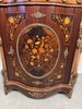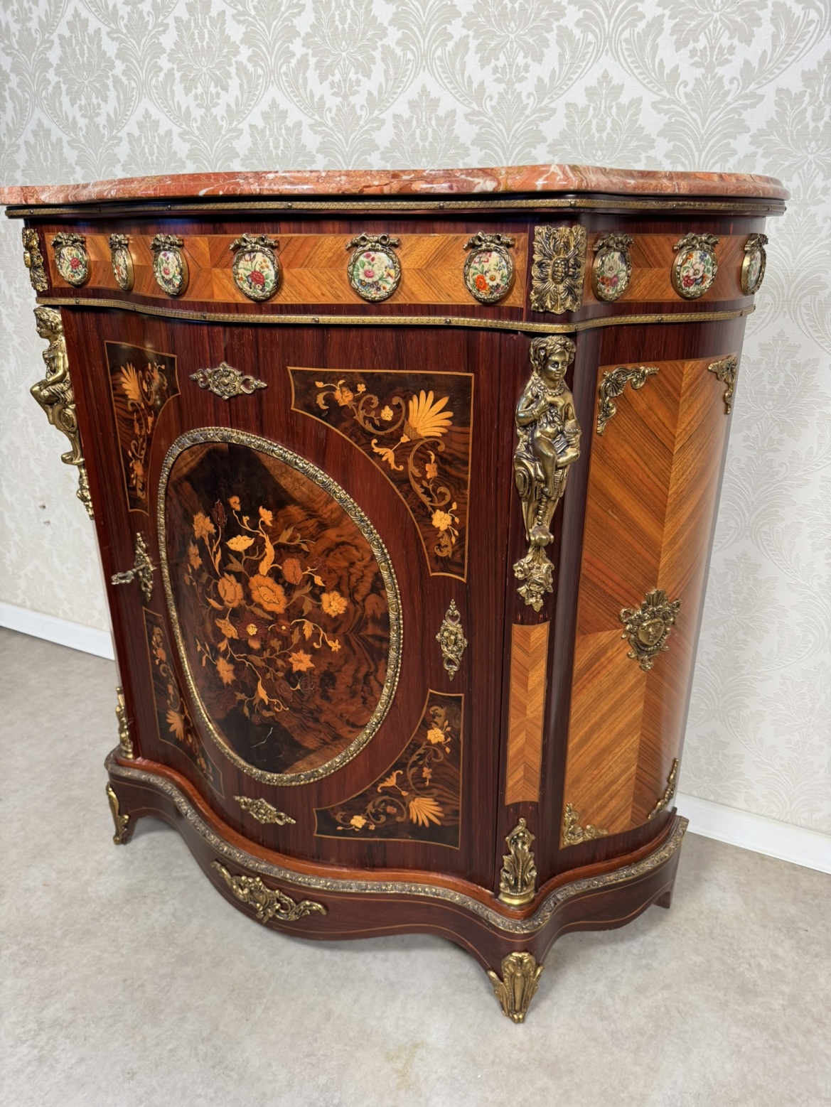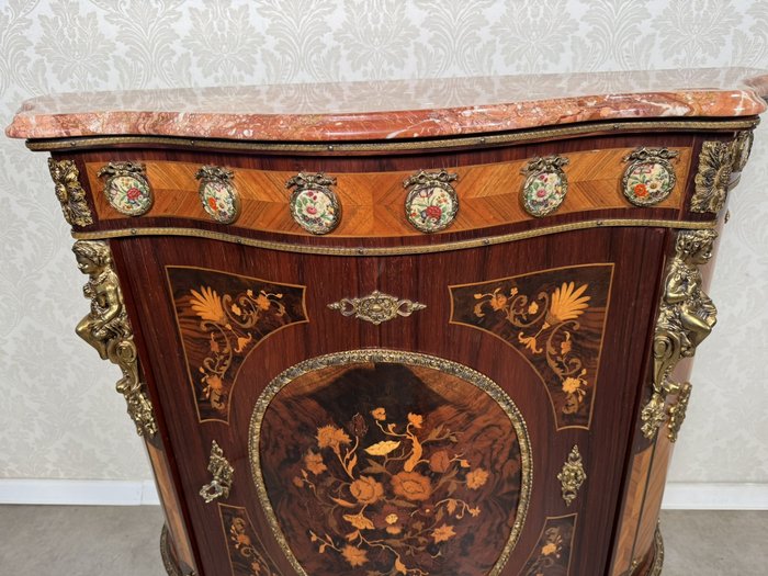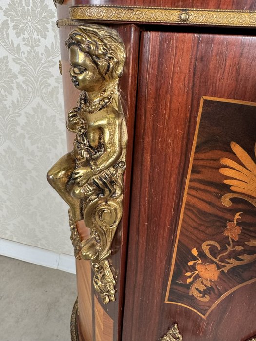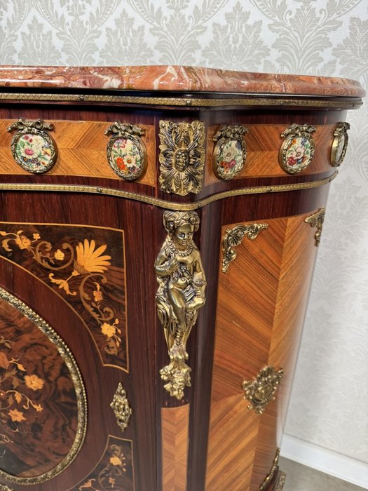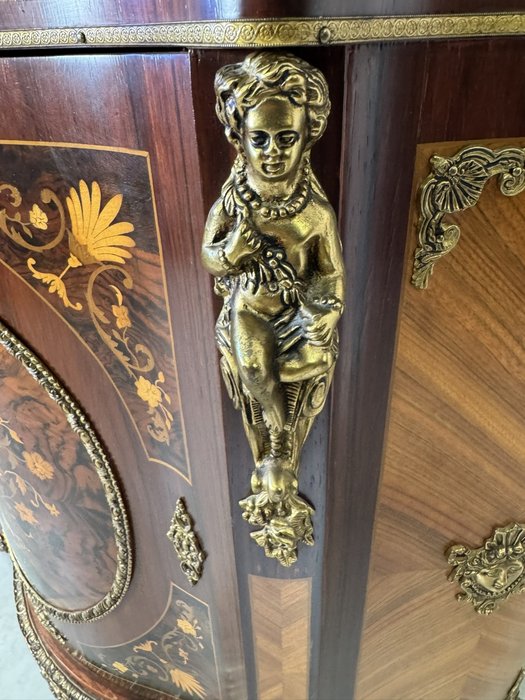 Výjimečně zdobená komoda s prohnutou čelní linií, mramorovou deskou a bohatou intarzií s květinovými motivy. Povrch je doplněný bronzovými aplikacemi a plastikami postav cherubínů. Horní část zdobí série porcelánových medailonů s ručně malovanými květinami v dekorativních rámech. Centrální část čela dominuje oválný florální motiv obklopený bohatou bronzovou bordurou.44 850 Kč