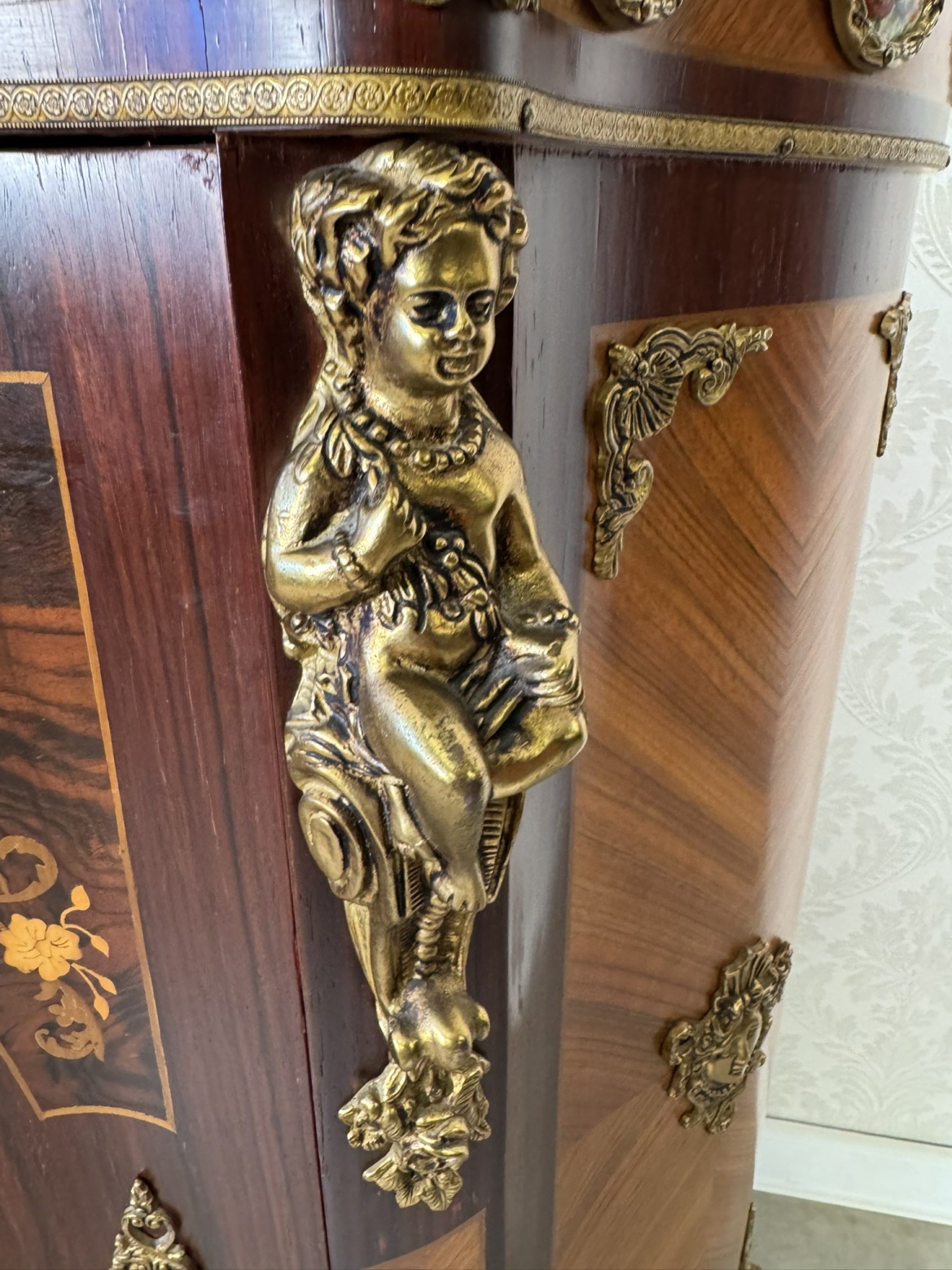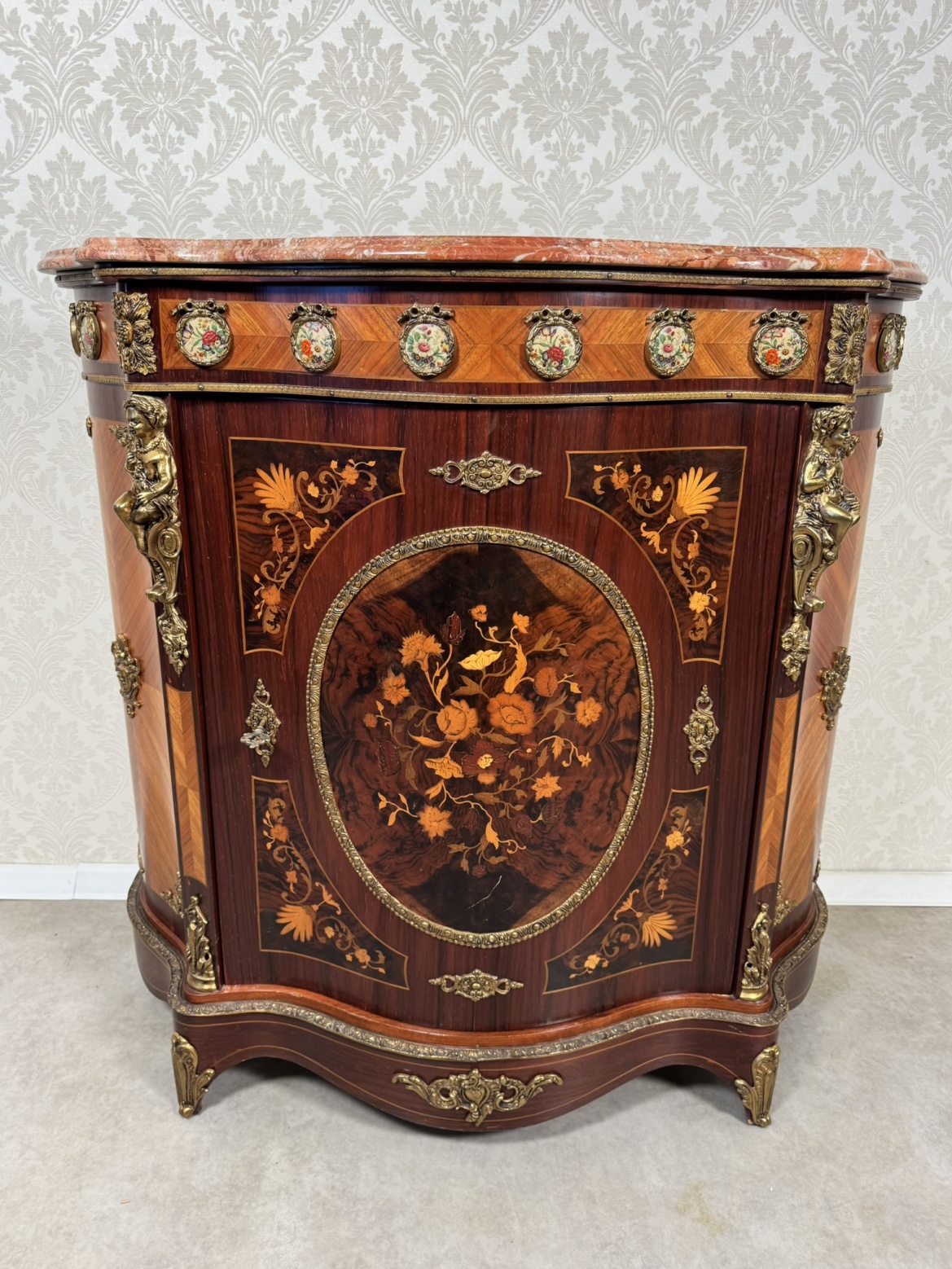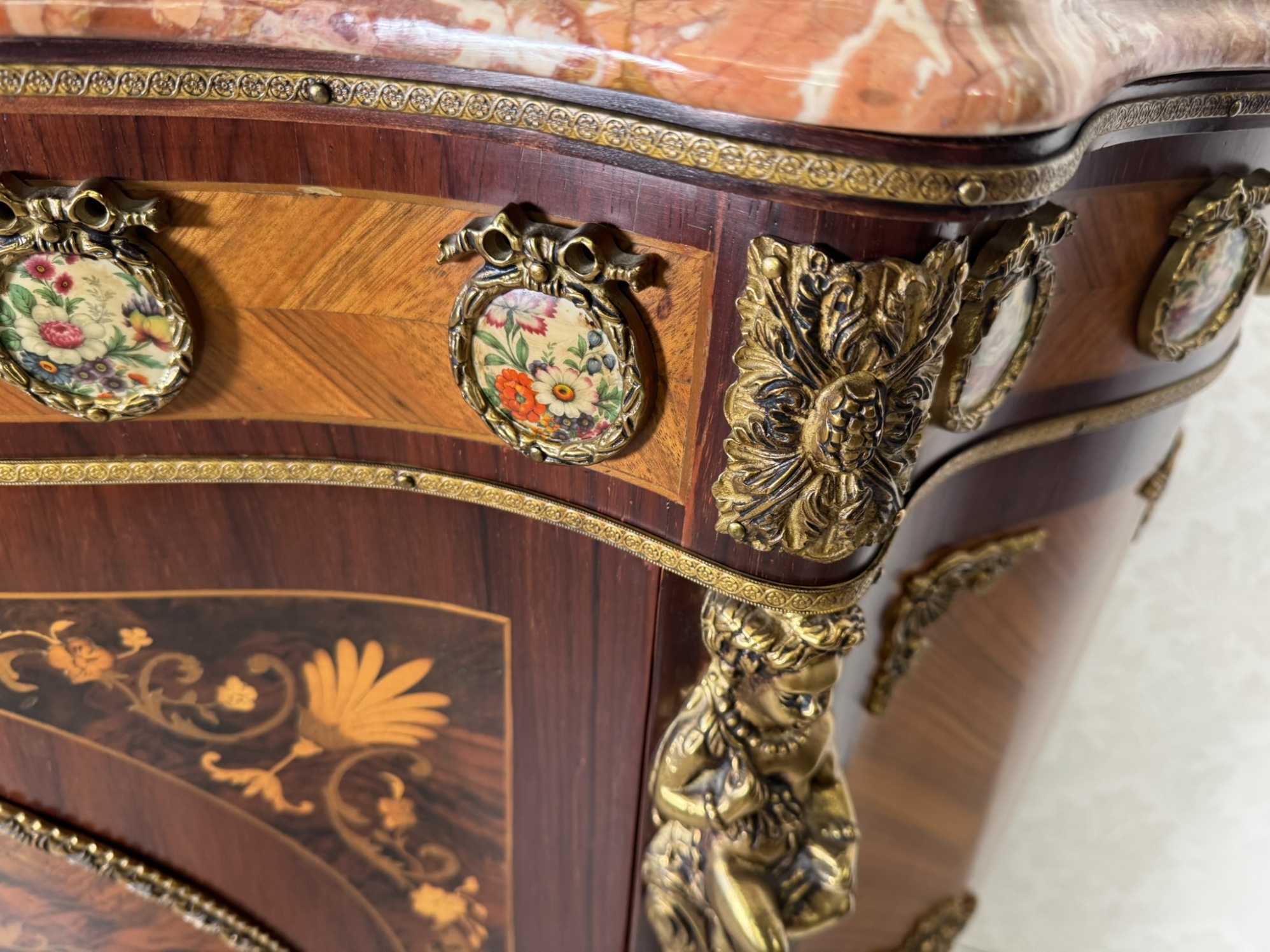 Výjimečně zdobená komoda s prohnutou čelní linií, mramorovou deskou a bohatou intarzií s květinovými motivy. Povrch je doplněný bronzovými aplikacemi a plastikami postav cherubínů. Horní část zdobí série porcelánových medailonů s ručně malovanými květinami v dekorativních rámech. Centrální část čela dominuje oválný florální motiv obklopený bohatou bronzovou bordurou.44 850 Kč