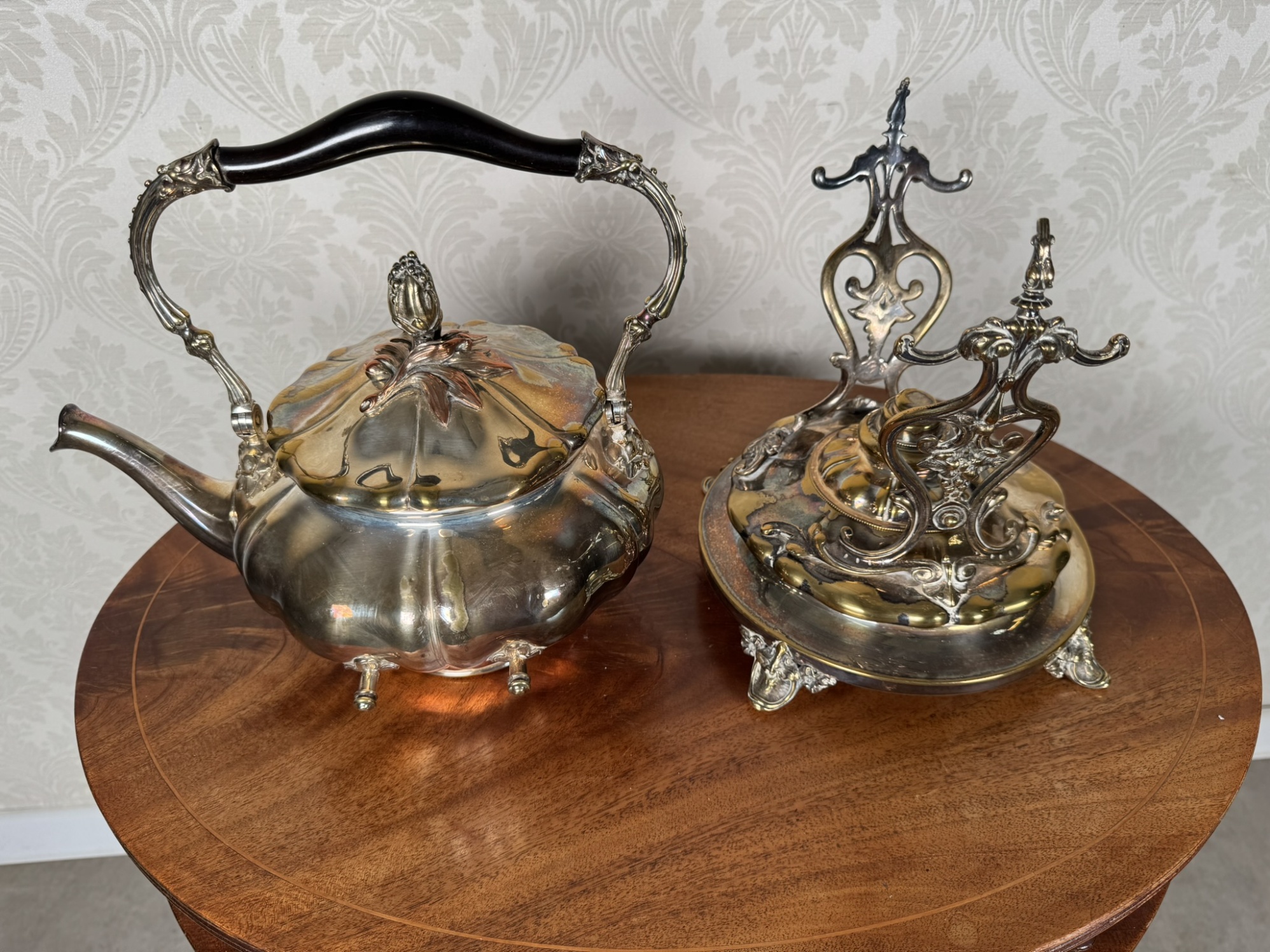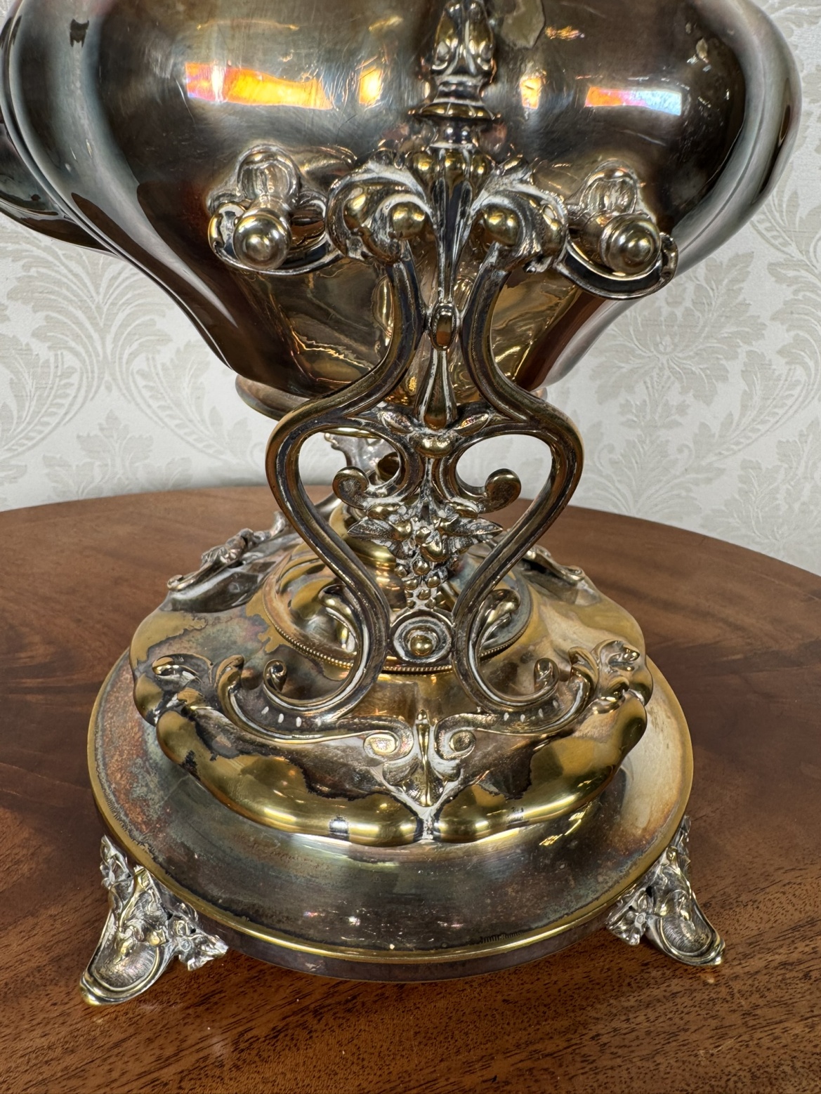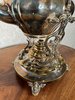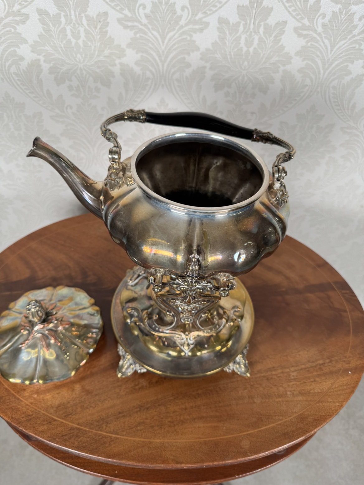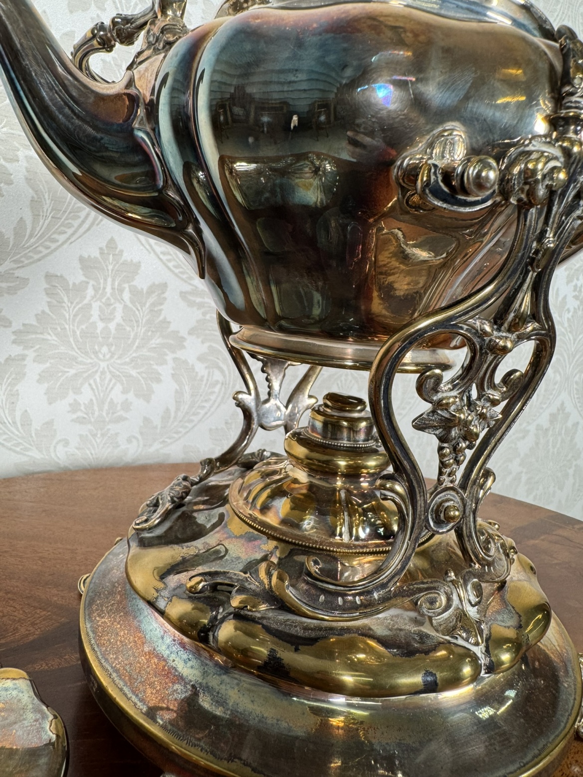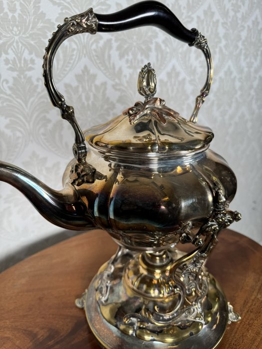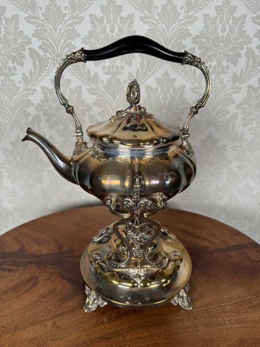Reprezentativní čajová konvice z leštěného kovu s plastickým dekorem a dřevěným madlem, doplněná samostatným stojanem s ohřívačem. Detailní výzdoba včetně reliéfů a rokokových nožek podtrhuje slavnostní charakter soupravy. Vhodné k servírování horkých nápojů.4 580 Kč
