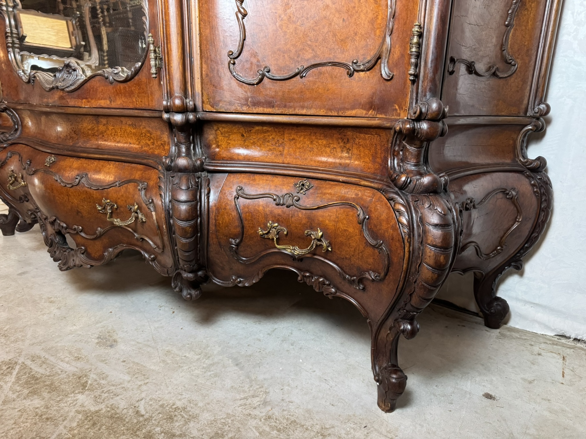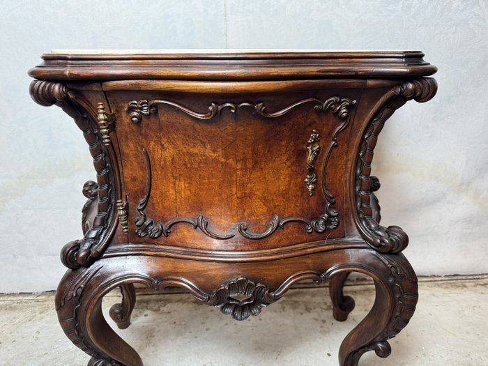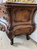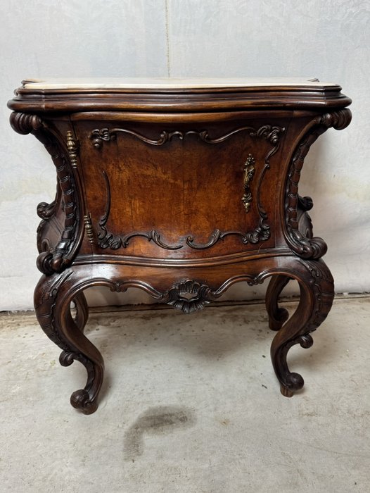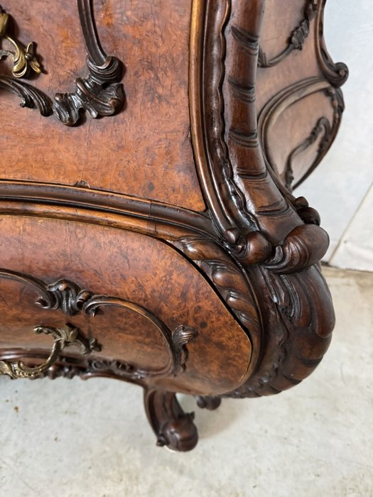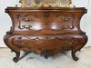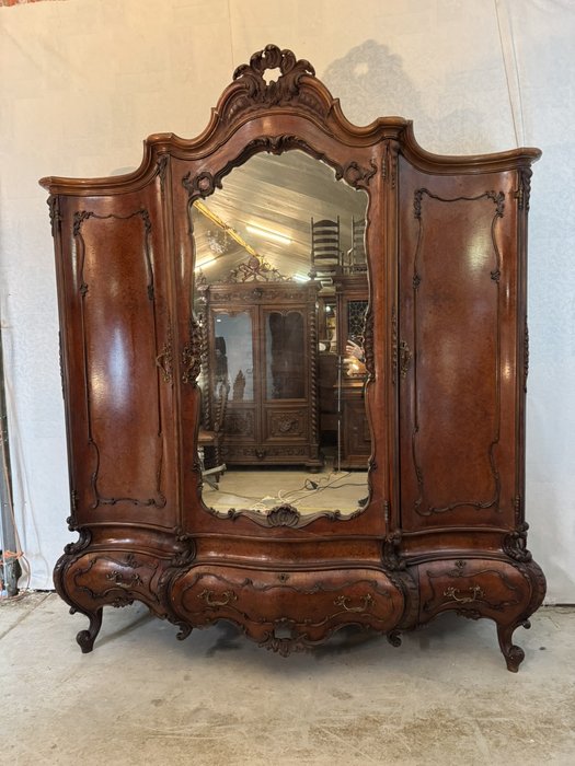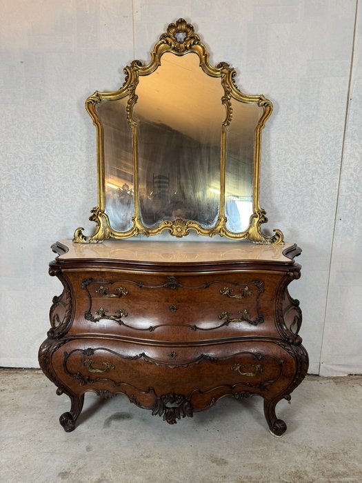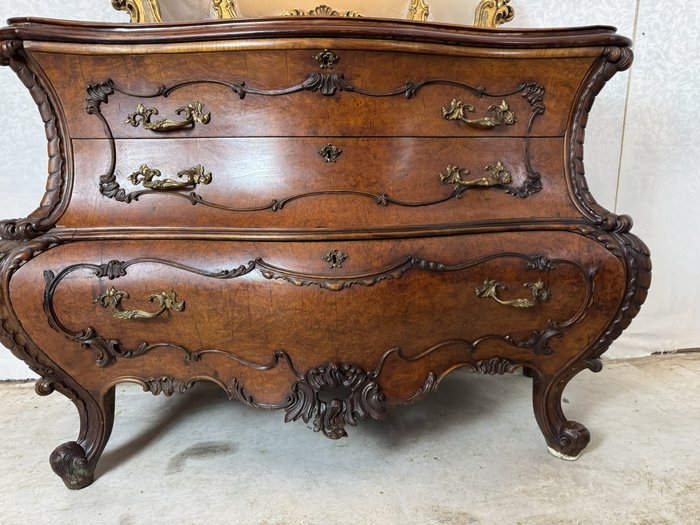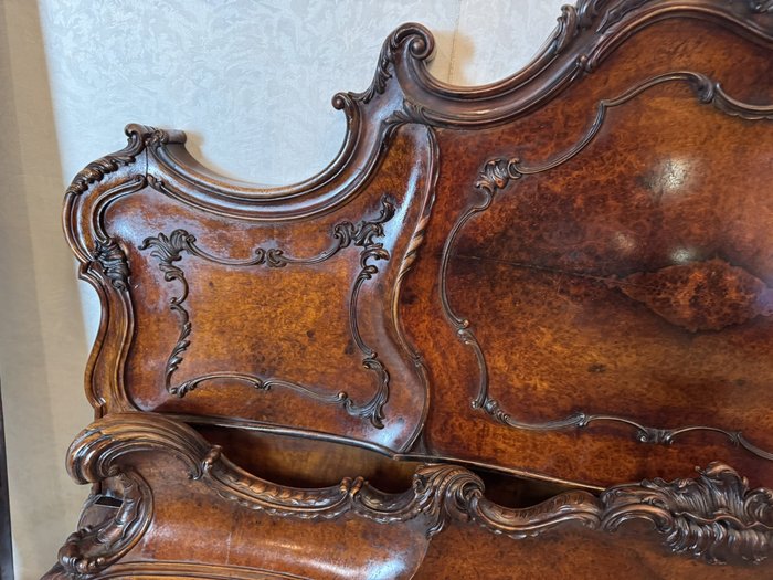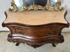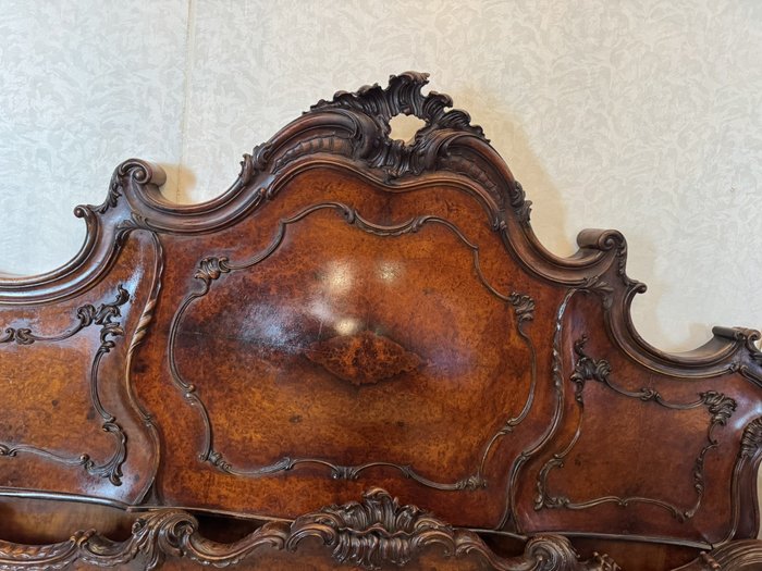 Ložnicová sestava zahrnující velkou šatní skříň se zrcadlem, komodu se zrcadlem, pár nočních stolků a postel. Nábytek vyniká bohatě tvarovanými liniemi, křivkovými tvary a zdobnými řezbami, které mu dodávají vznešený a luxusní charakter. Dekorativní kování a detaily podtrhují pečlivé řemeslné provedení i estetickou hodnotu celku. Tyto kusy mají svůj původ v Itálii.218 000 Kč