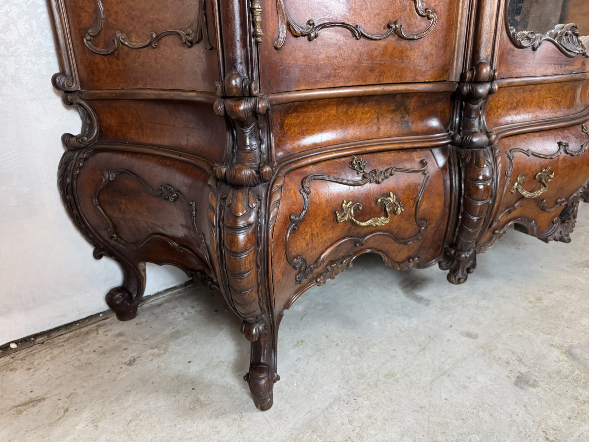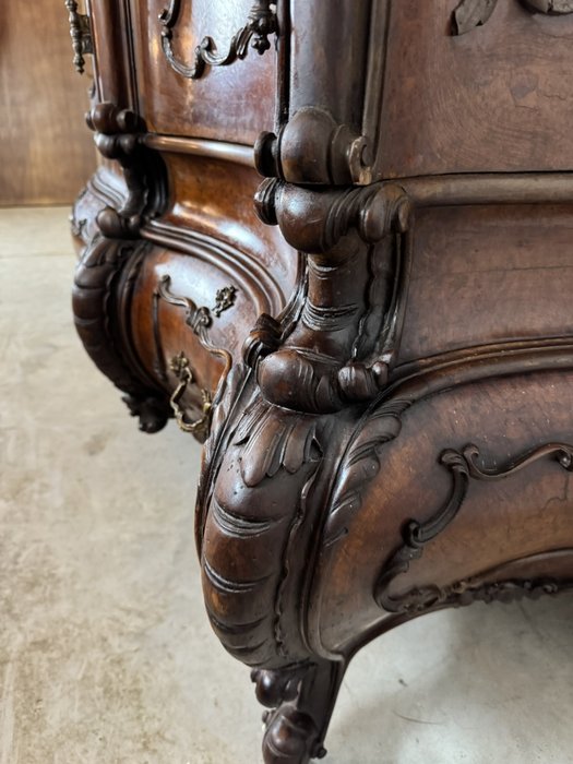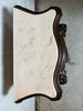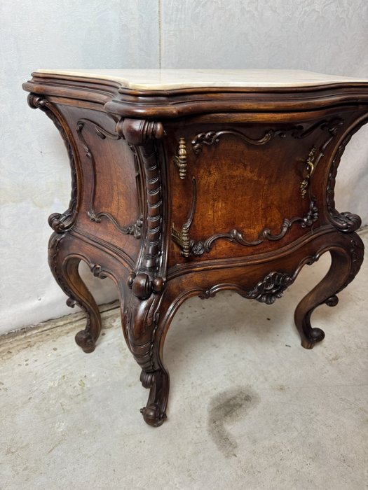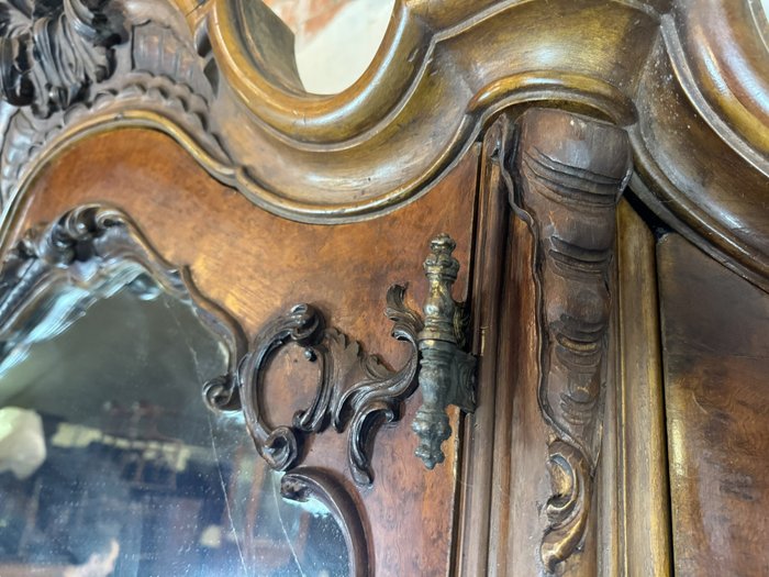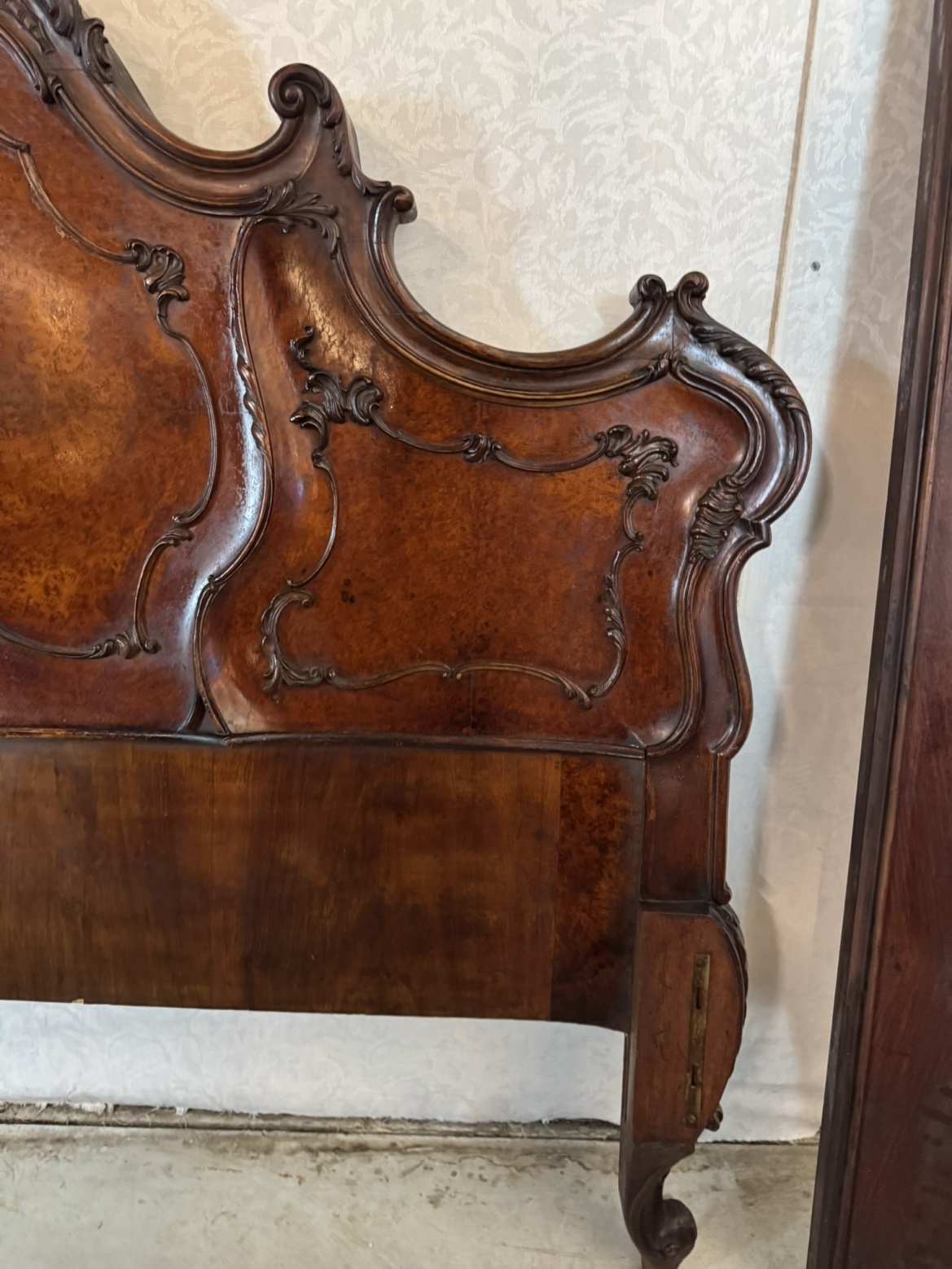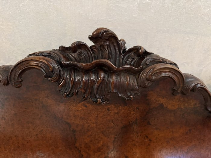 Ložnicová sestava zahrnující velkou šatní skříň se zrcadlem, komodu se zrcadlem, pár nočních stolků a postel. Nábytek vyniká bohatě tvarovanými liniemi, křivkovými tvary a zdobnými řezbami, které mu dodávají vznešený a luxusní charakter. Dekorativní kování a detaily podtrhují pečlivé řemeslné provedení i estetickou hodnotu celku. Tyto kusy mají svůj původ v Itálii.218 000 Kč