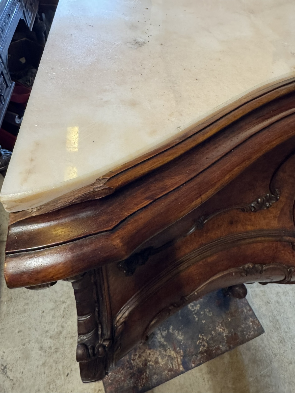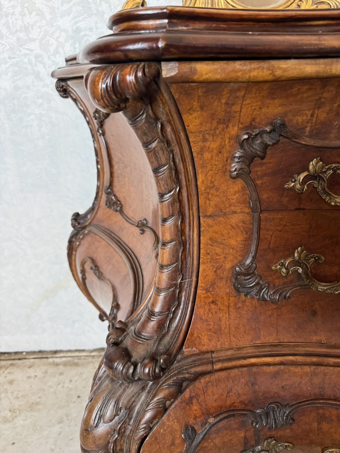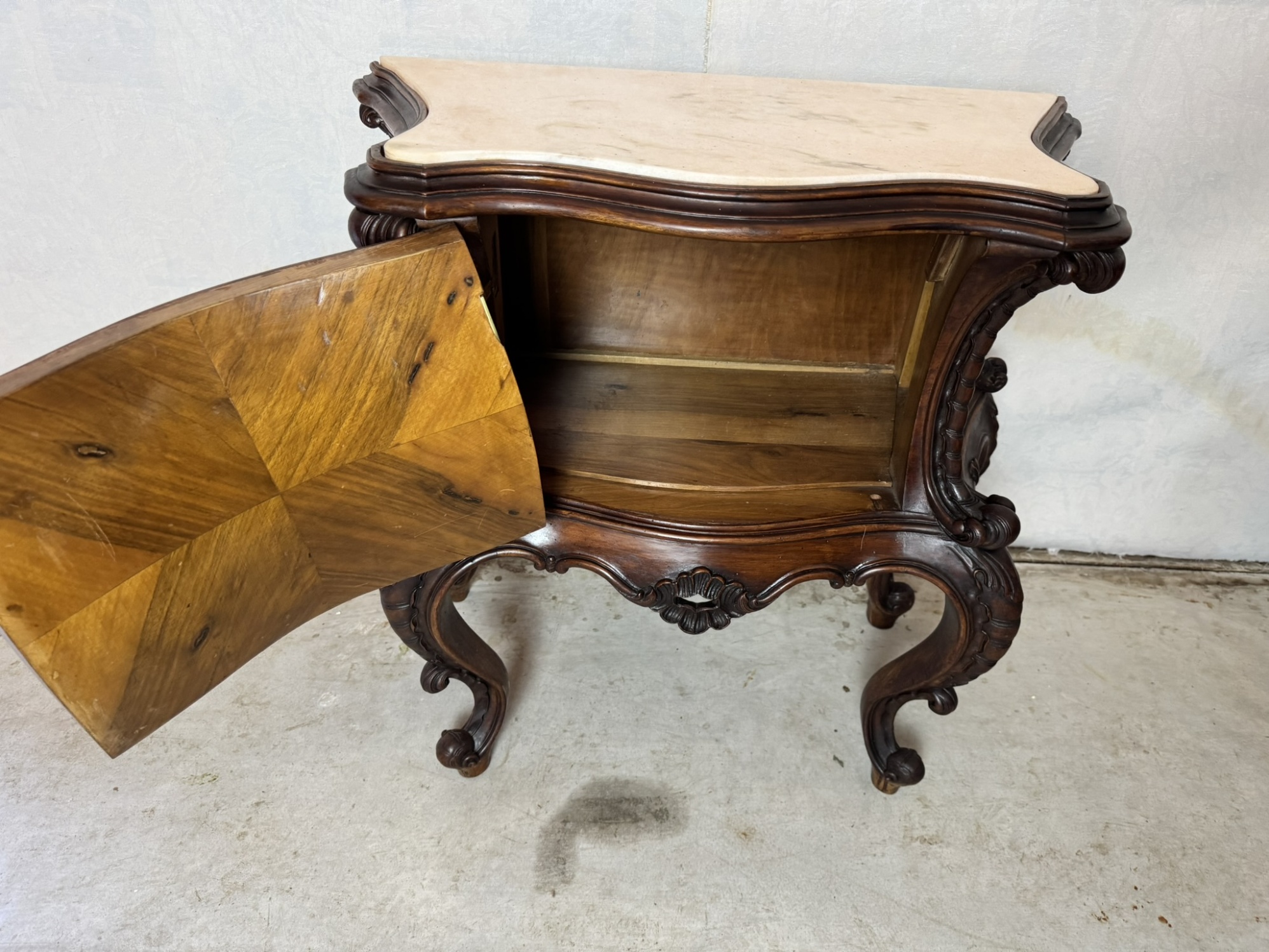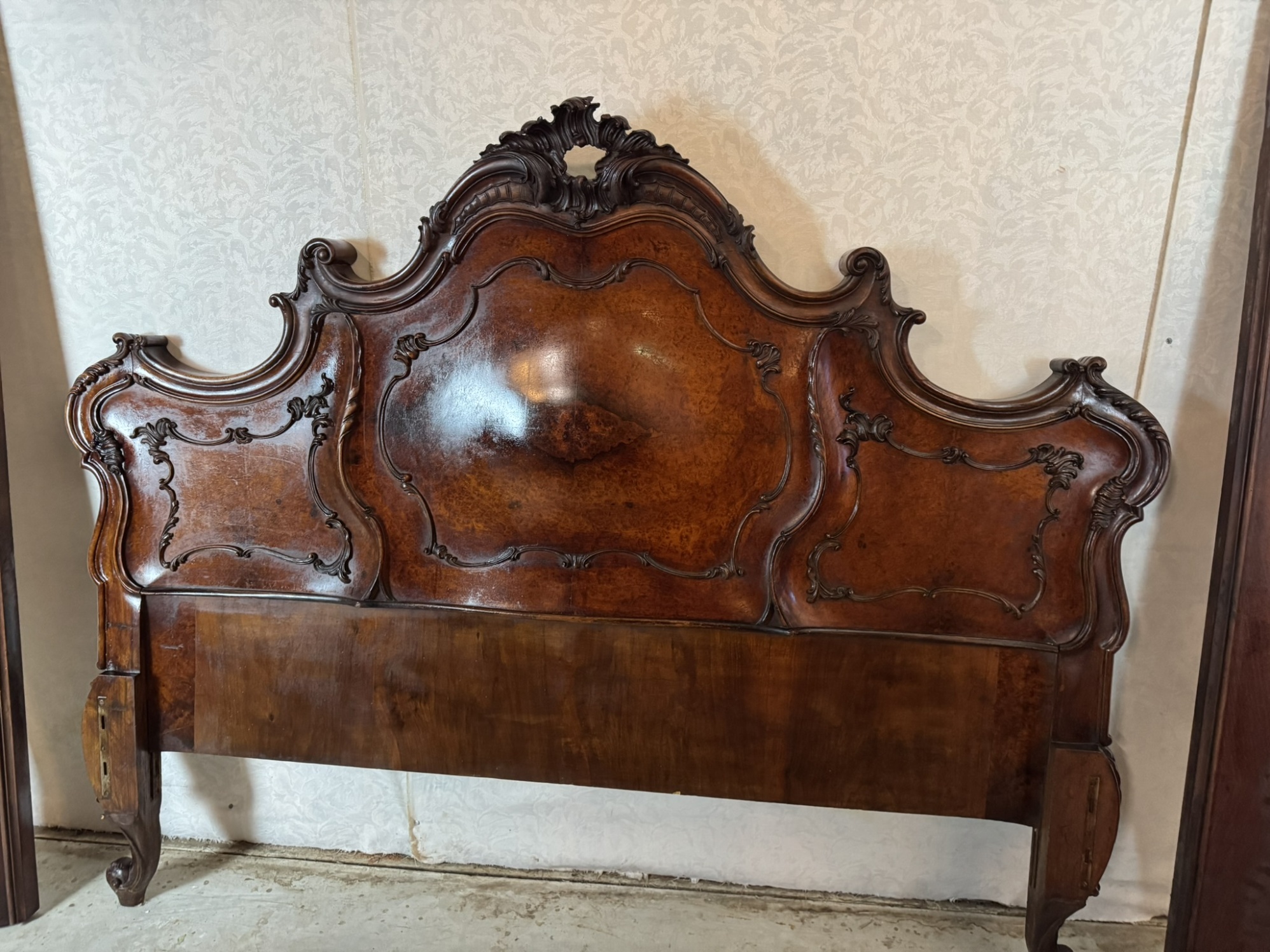 Ložnicová sestava zahrnující velkou šatní skříň se zrcadlem, komodu se zrcadlem, pár nočních stolků a postel. Nábytek vyniká bohatě tvarovanými liniemi, křivkovými tvary a zdobnými řezbami, které mu dodávají vznešený a luxusní charakter. Dekorativní kování a detaily podtrhují pečlivé řemeslné provedení i estetickou hodnotu celku. Tyto kusy mají svůj původ v Itálii.218 000 Kč