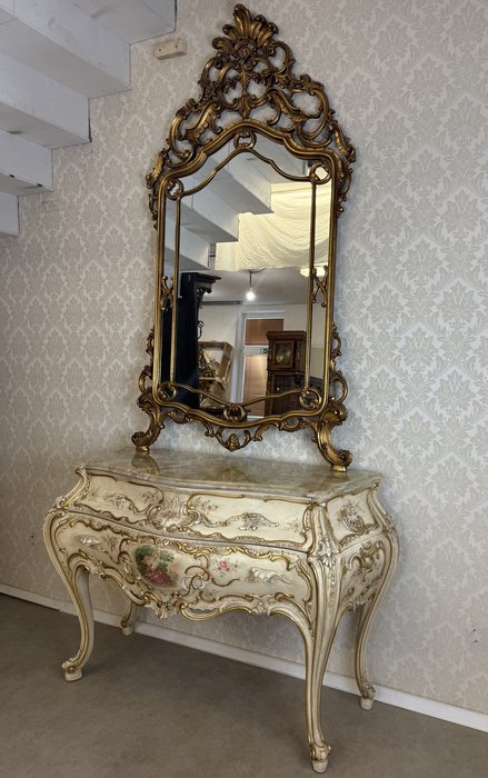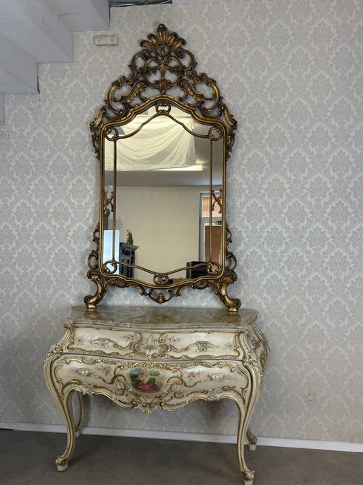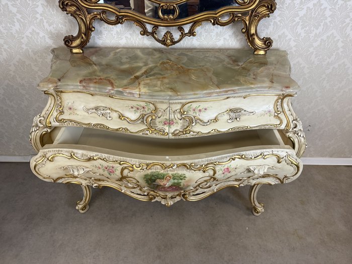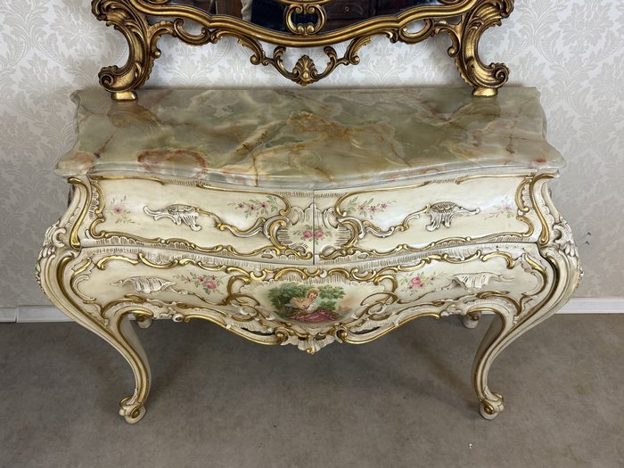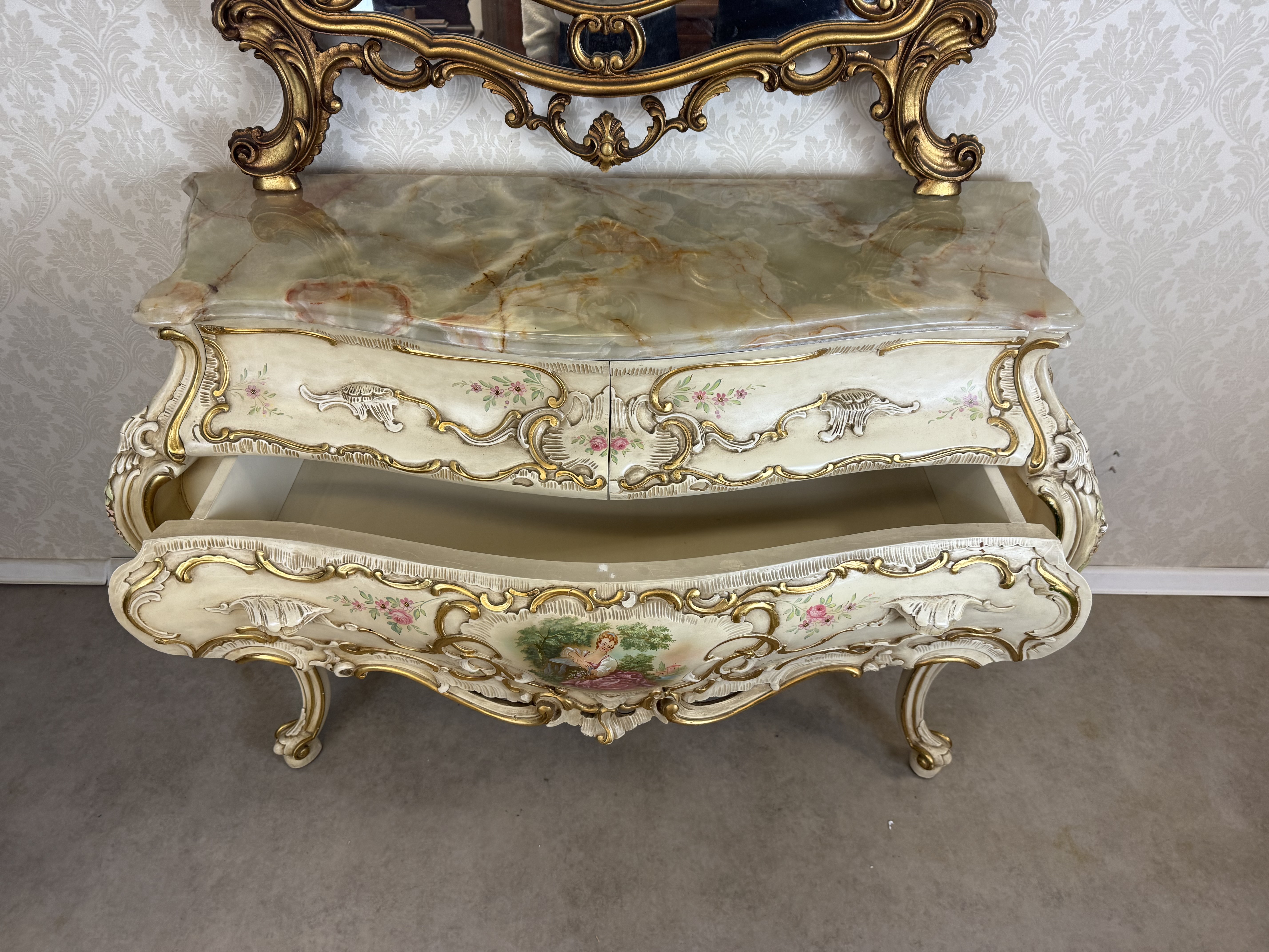 Honosná toaletka se zásuvkami s bohatě tvarovanými liniemi, doplněna í mramorovou deskou v jemně zelenkavém tónu. Čelní i boční strany zdobí ručně malované květinové motivy, doplněné plastickými ornamenty. Vrchní zrcadlová část v odpovídajícím dekoru je vsazena do bohatě vyřezávaného rámu s krásnou povrchovou úpravou.51 430 Kč