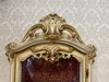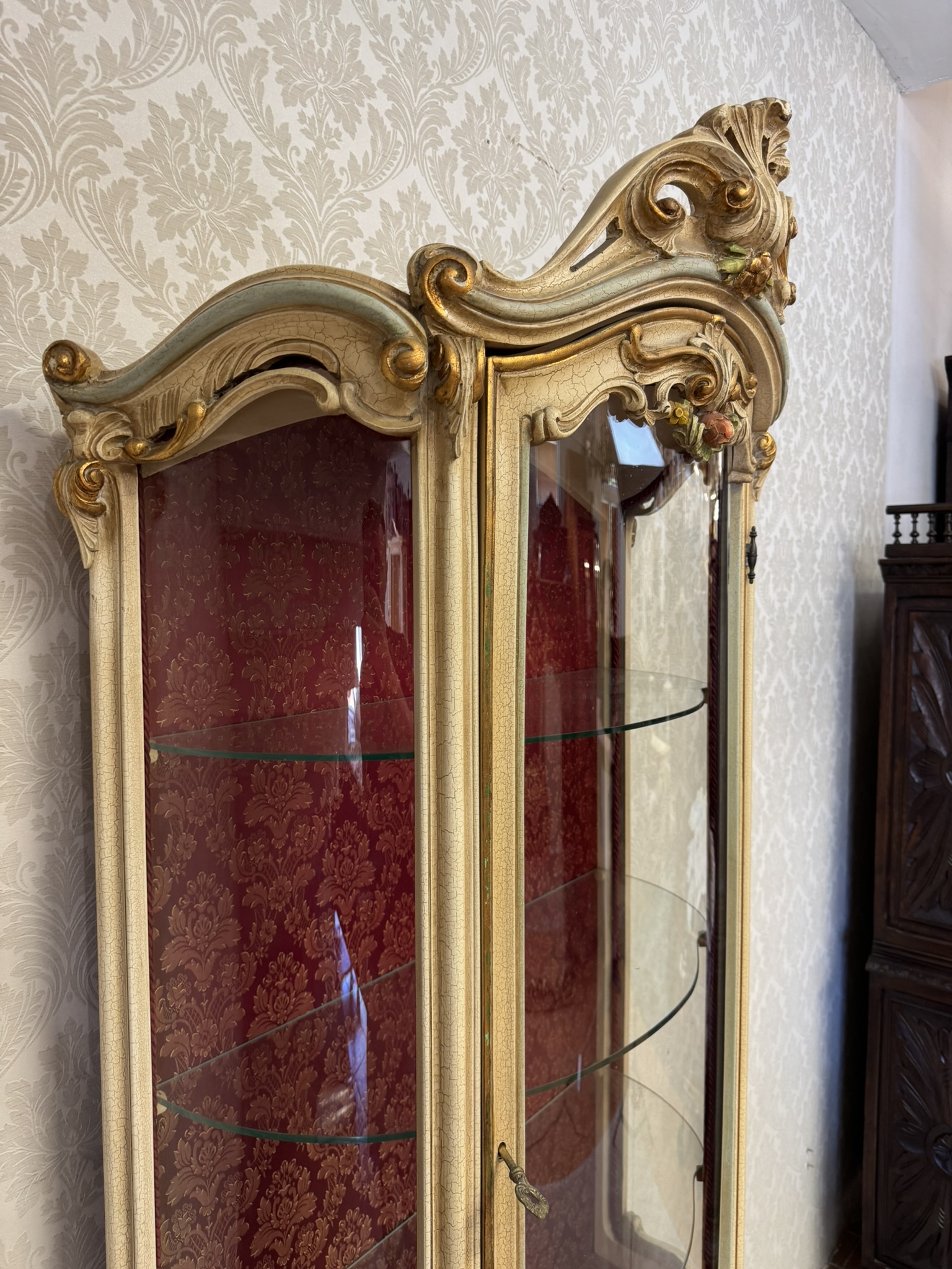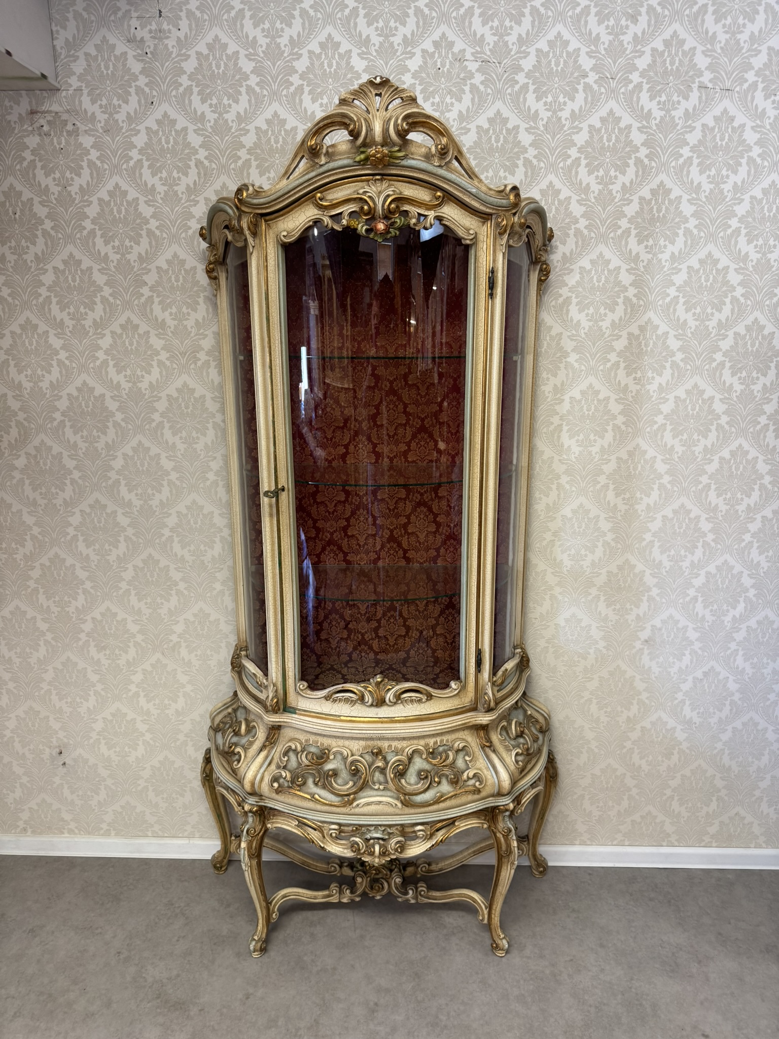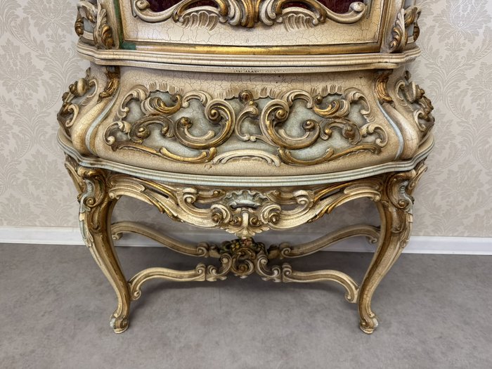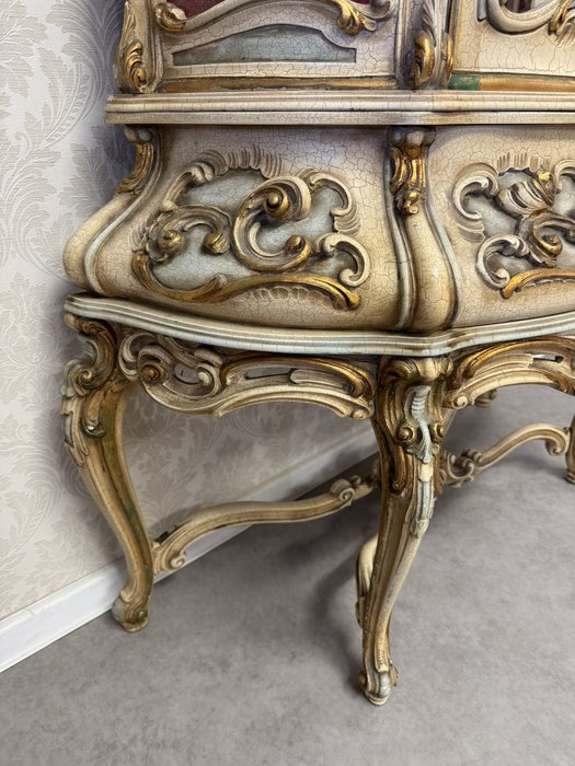 Třístranně prosklená vitrína s ručně malovanými detaily, křivkovým rámem a bohatě zdobenou spodní částí. Čelní i boční plochy zdobí tvarované dekory a stylizované květinové motivy. Vnitřek je potažen látkou s klasickým vzorem. Vyrobeno v Itálii.35 460 Kč