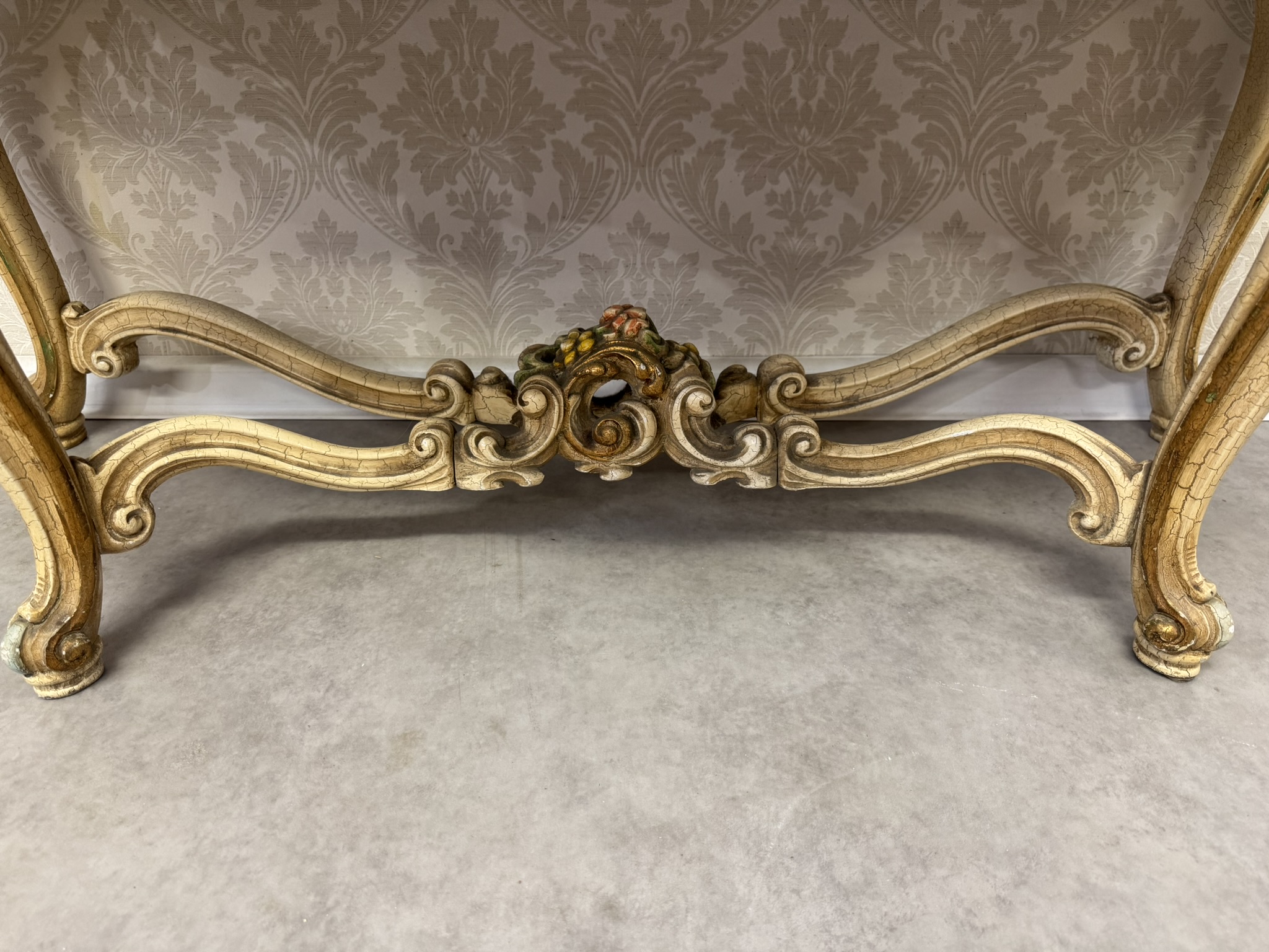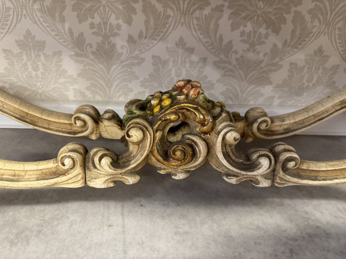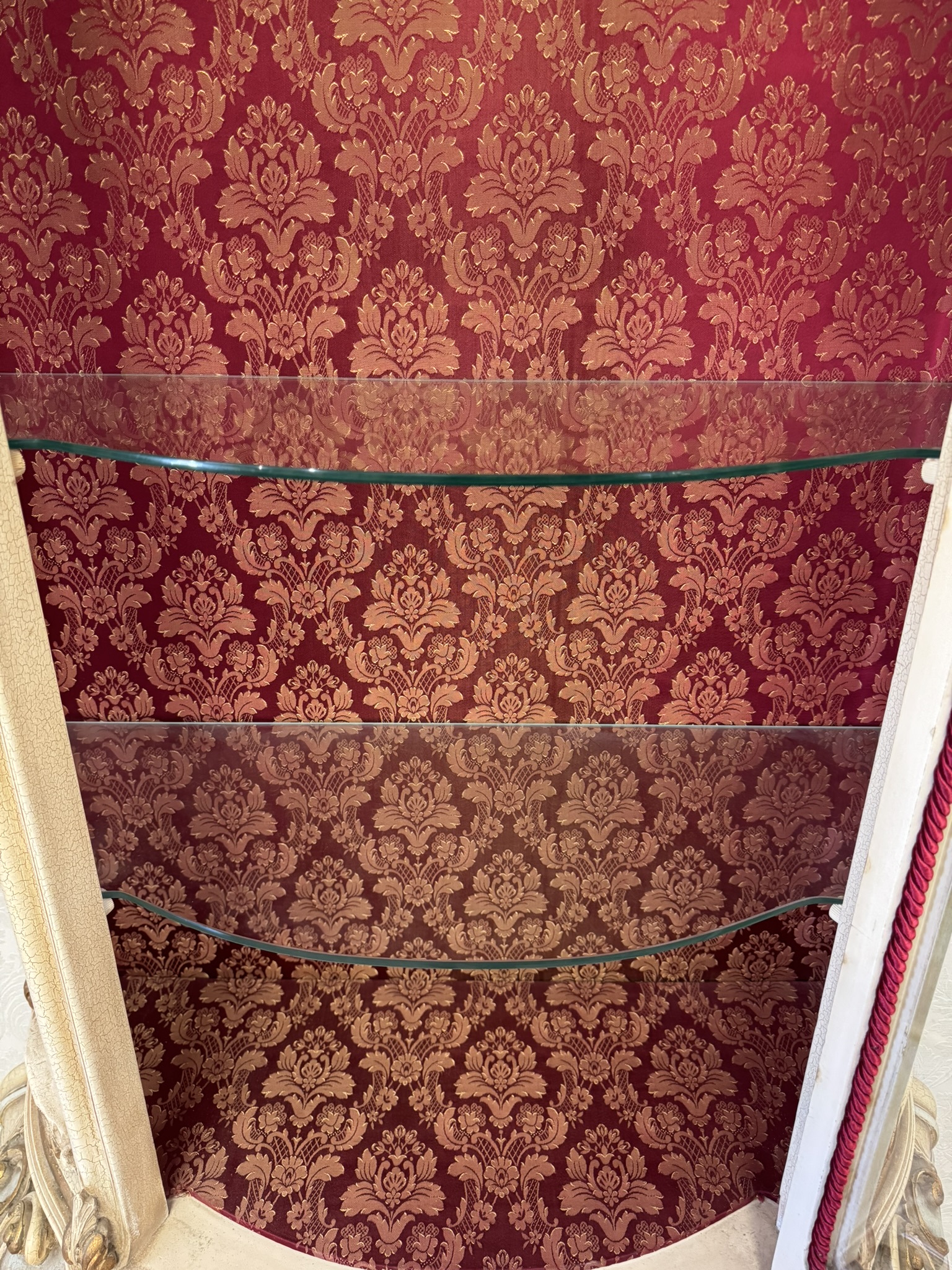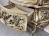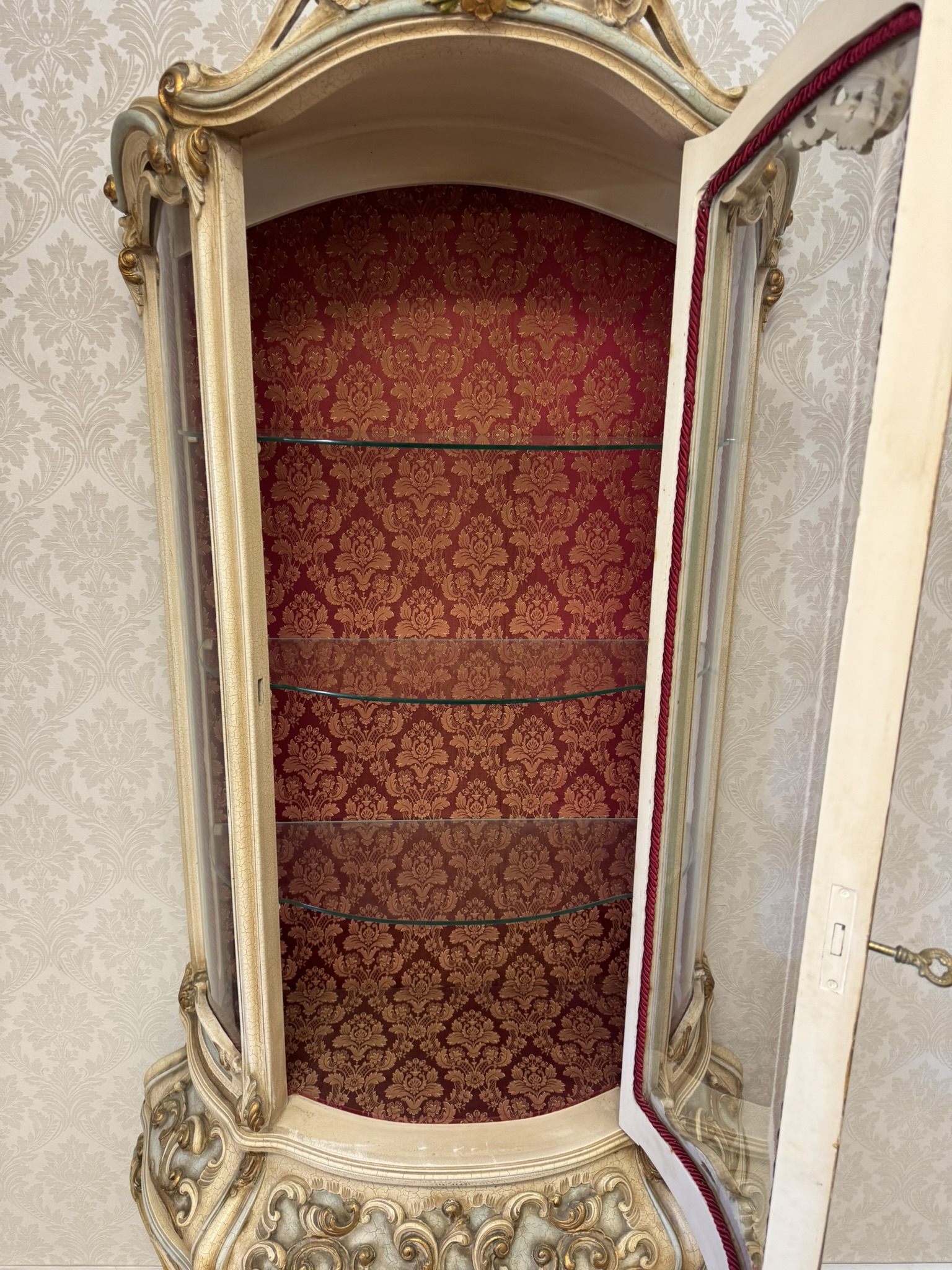 Třístranně prosklená vitrína s ručně malovanými detaily, křivkovým rámem a bohatě zdobenou spodní částí. Čelní i boční plochy zdobí tvarované dekory a stylizované květinové motivy. Vnitřek je potažen látkou s klasickým vzorem. Vyrobeno v Itálii.35 460 Kč
