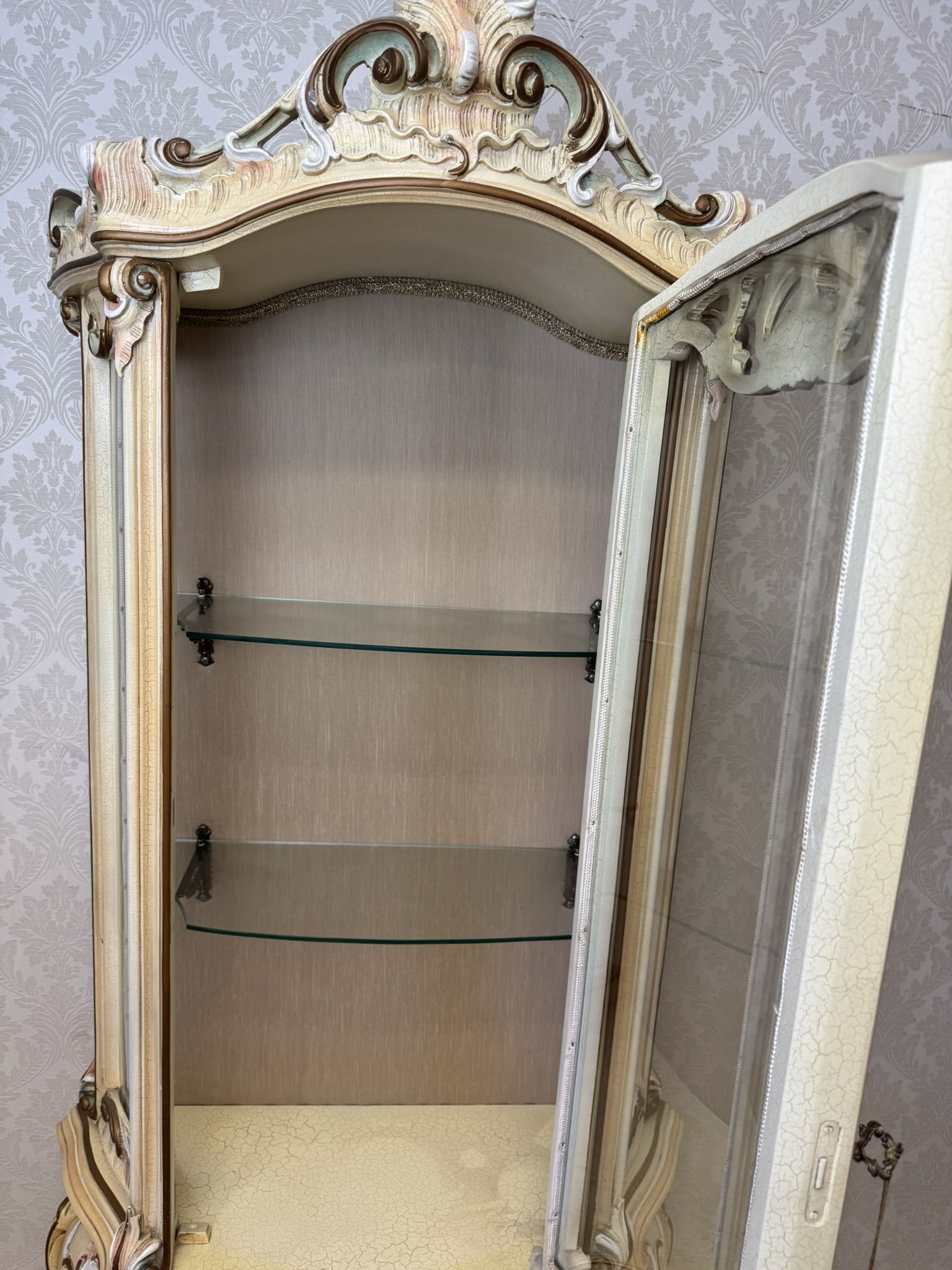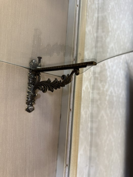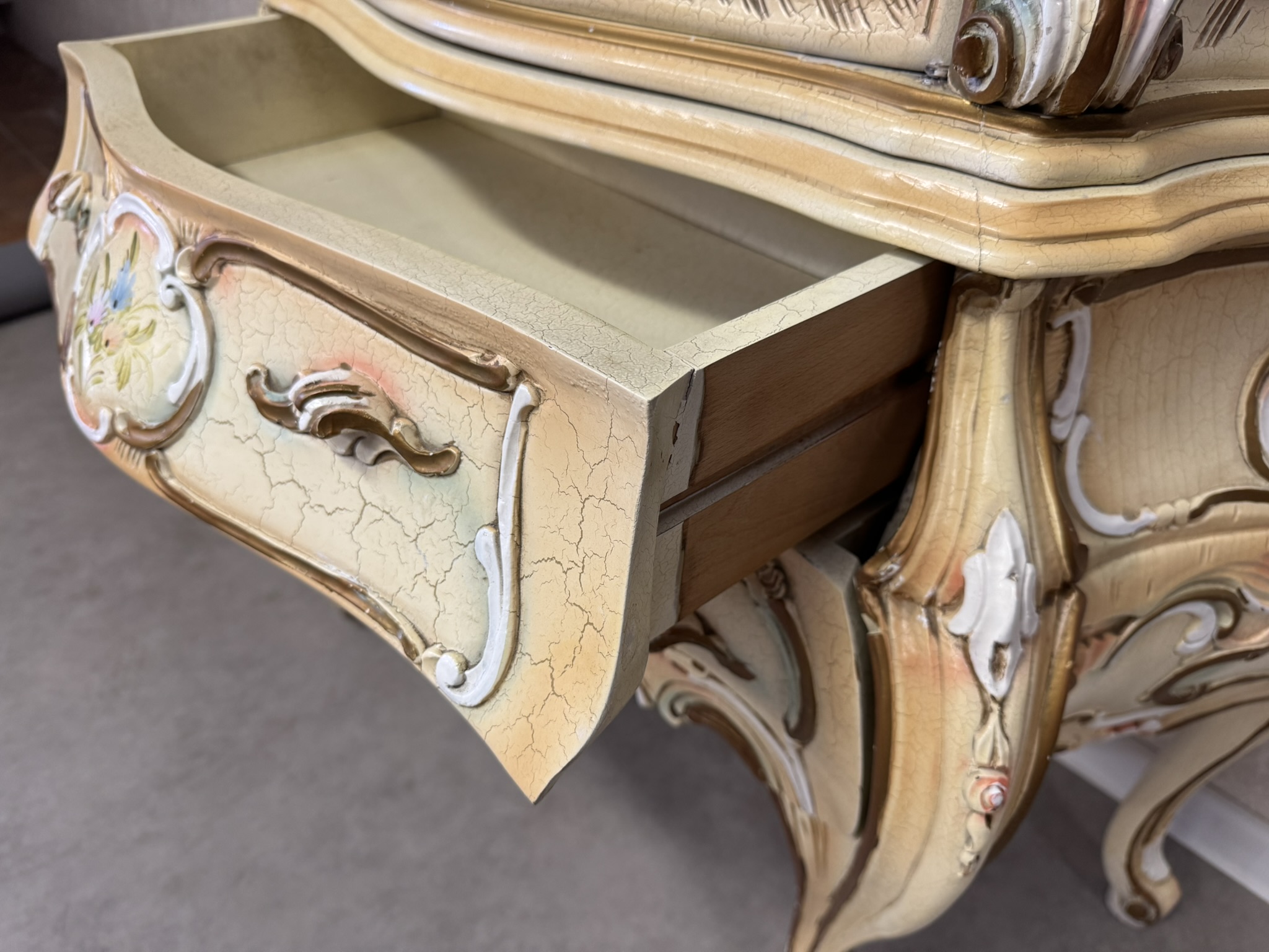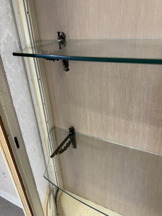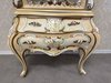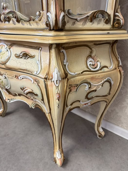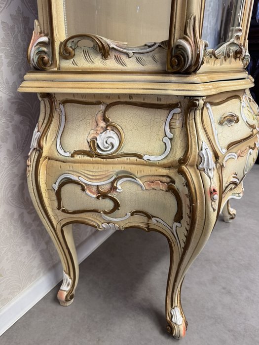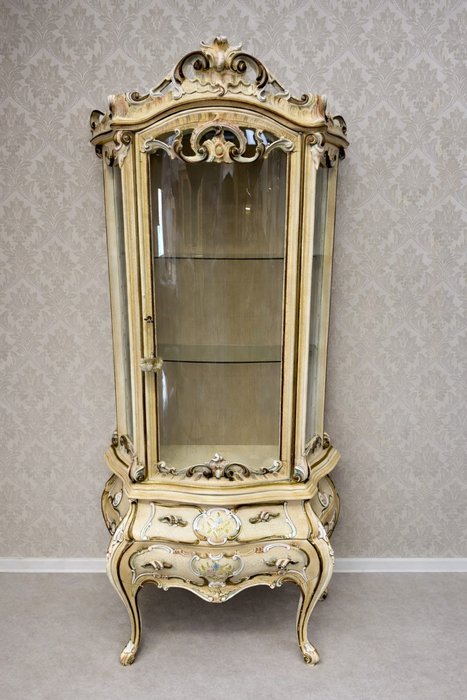 Dřevěná vitrína s tvarovaným prosklením, ručně malovanými květinami a bohatě profilovaným rámem. Spodní část nese křivkové linie a dekorativní prvky. Vyrobena v Itálii.29 860 Kč