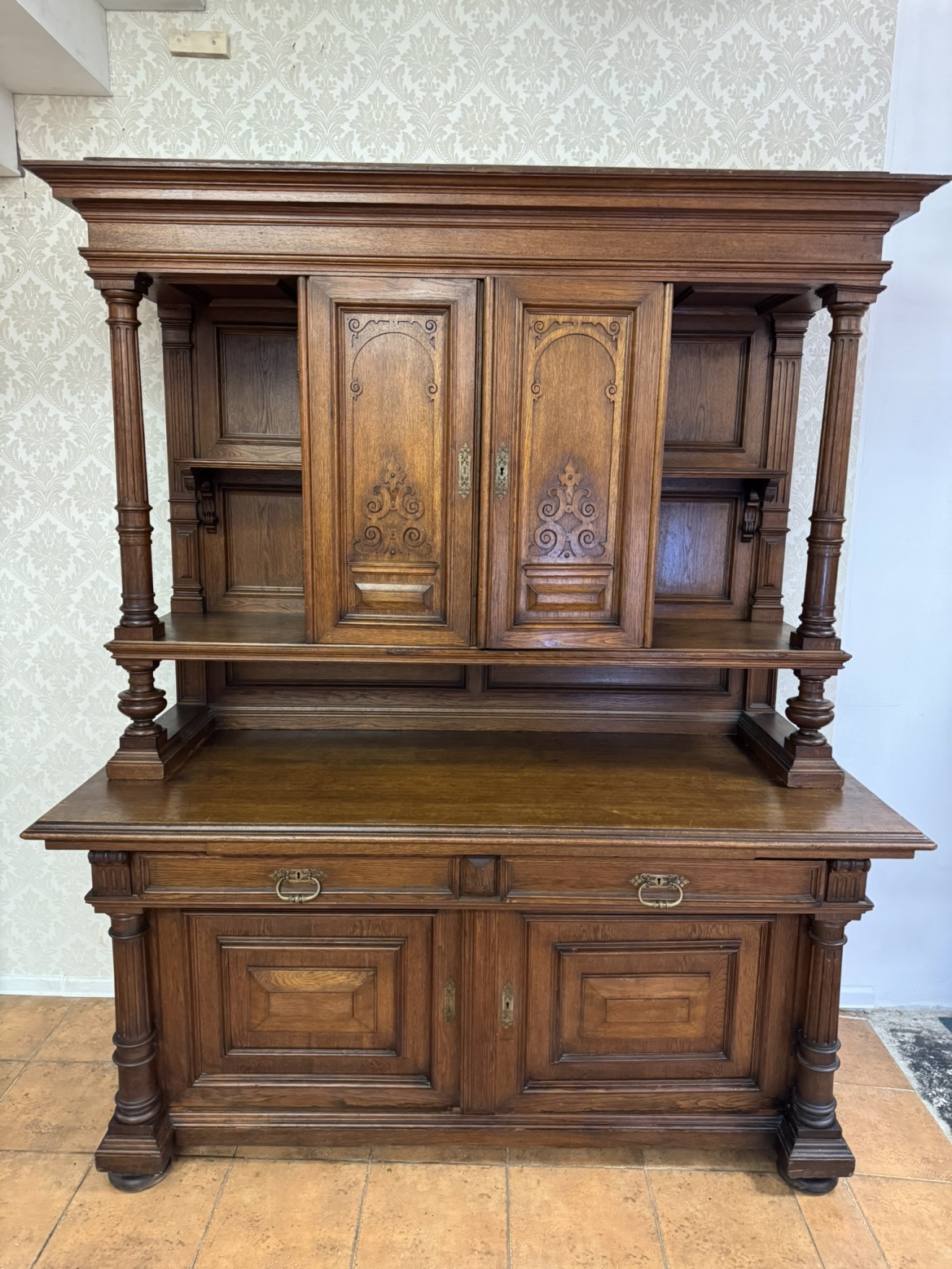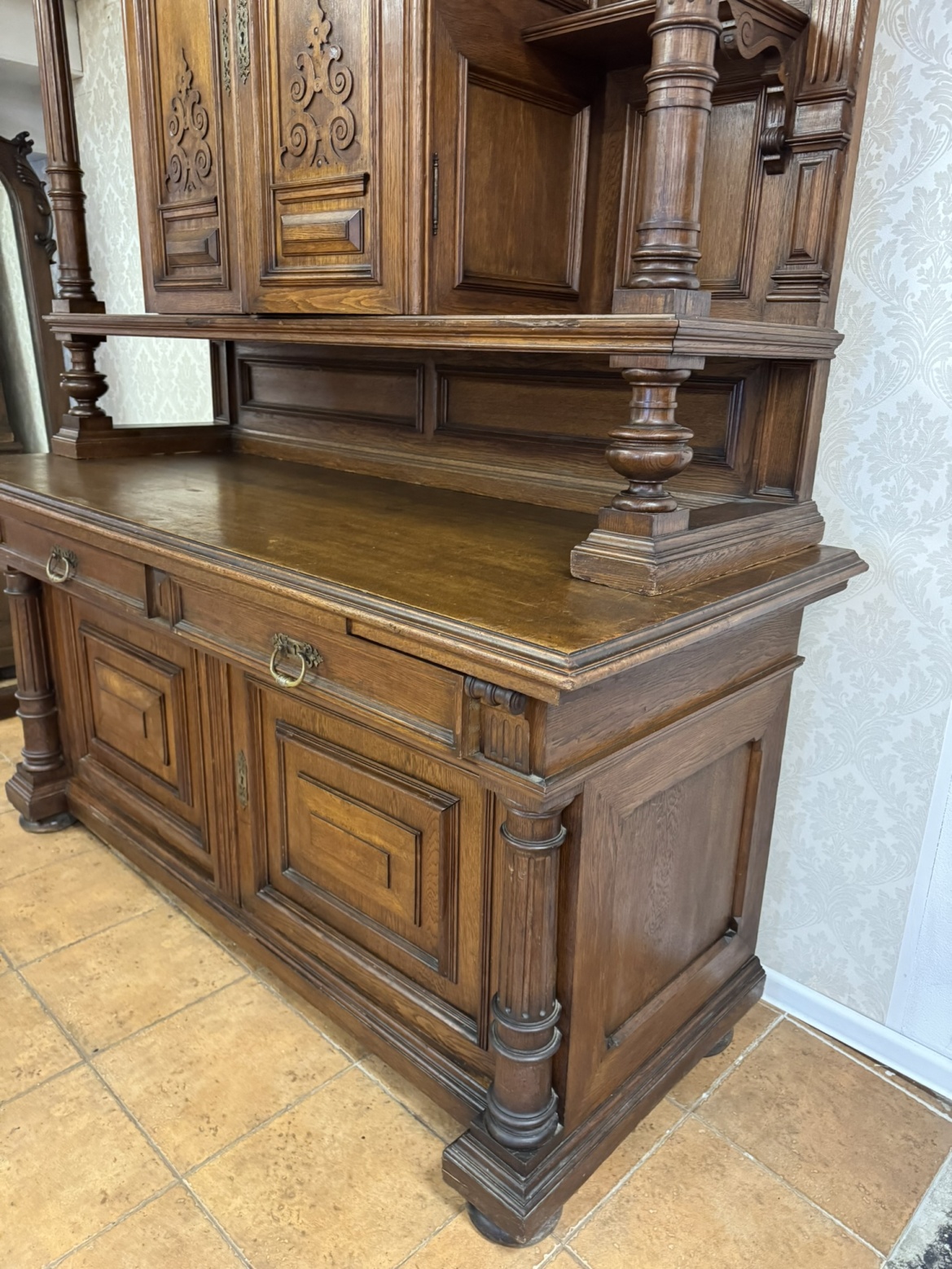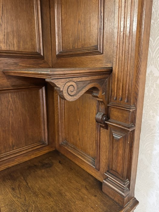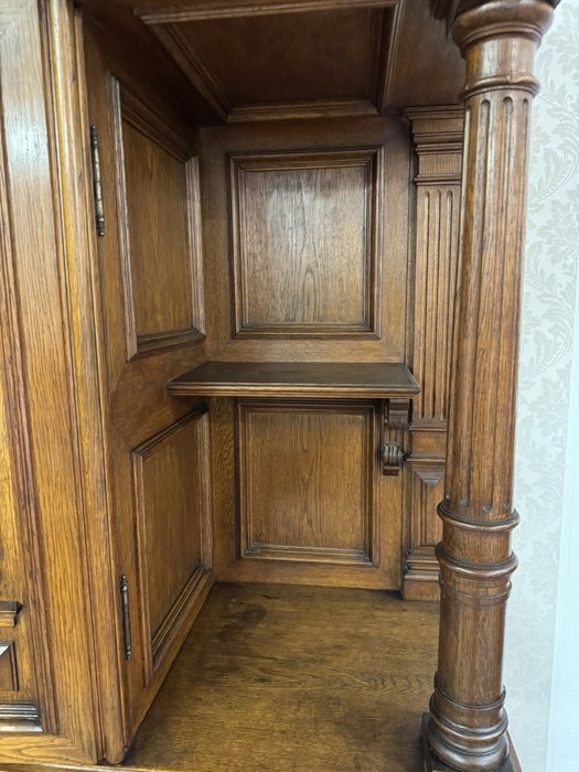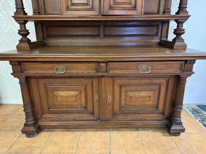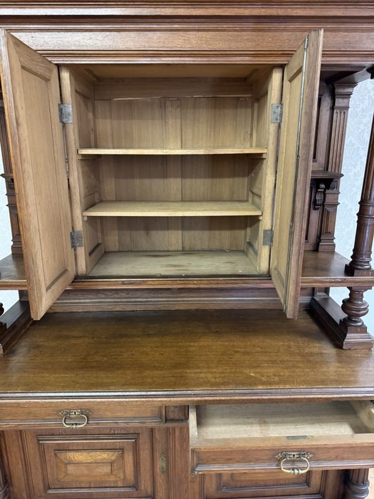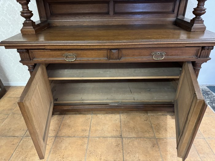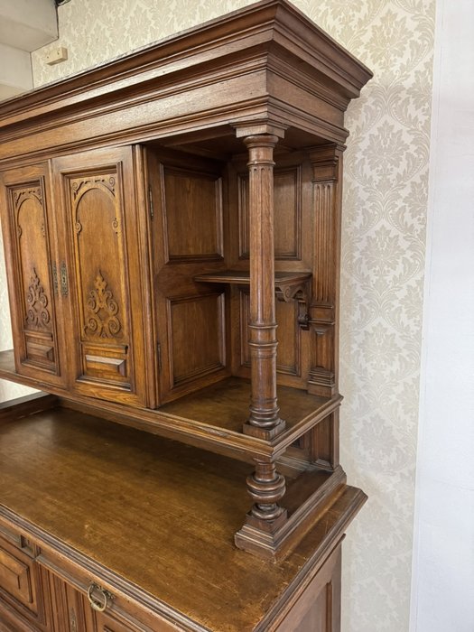 Příborník je zdobený tvarovanými výplněmi a vyřezávanými detaily. Horní nástavba je podepřena dvojicí ozdobných sloupků se svislým žlábkováním . Spodní část se širokou pracovní deskou nabízí úložný prostor ve dvou zásuvkách a skříňkách.17 350 Kč