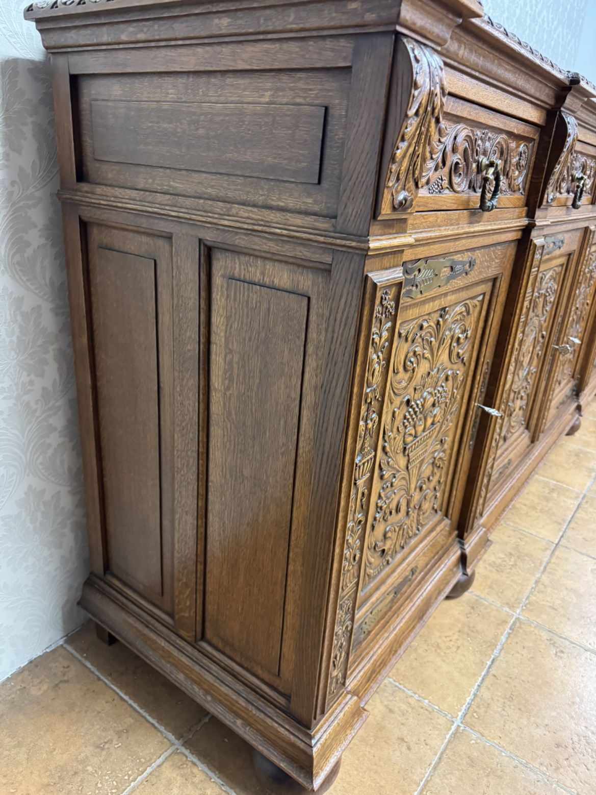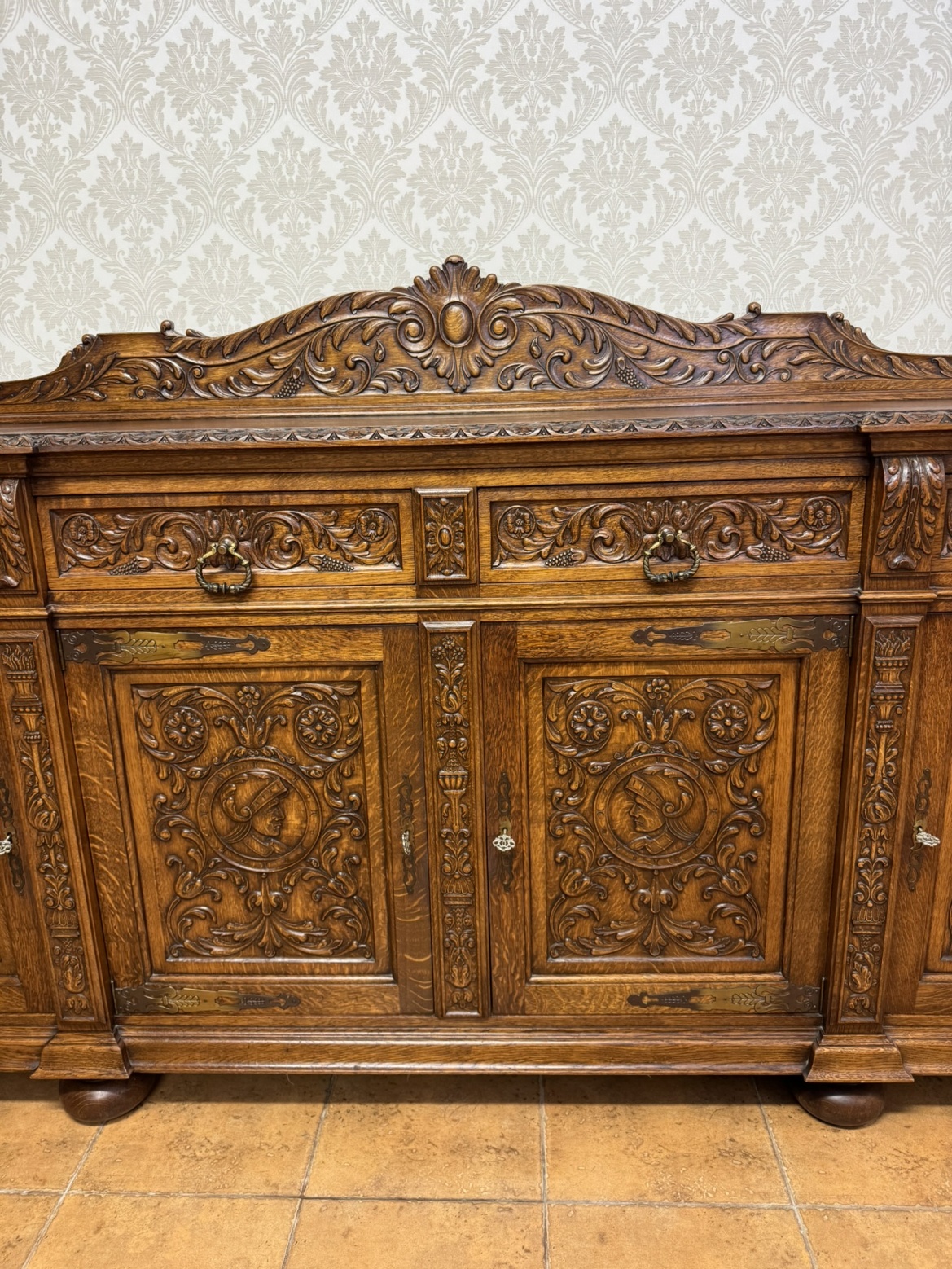 Precizně vyřezávaný dvoudílný příborník z tmavého dřeva s horní prosklenou částí a spodními plnými dvířky s loveckými motivy. Výrazná florální řezba a naturalistické detaily, včetně vyobrazení zvířat a lidské tváře se symbolickým výrazem, odkazují na styl renesance.Zrcadlový kabinet s bohatou řezbou