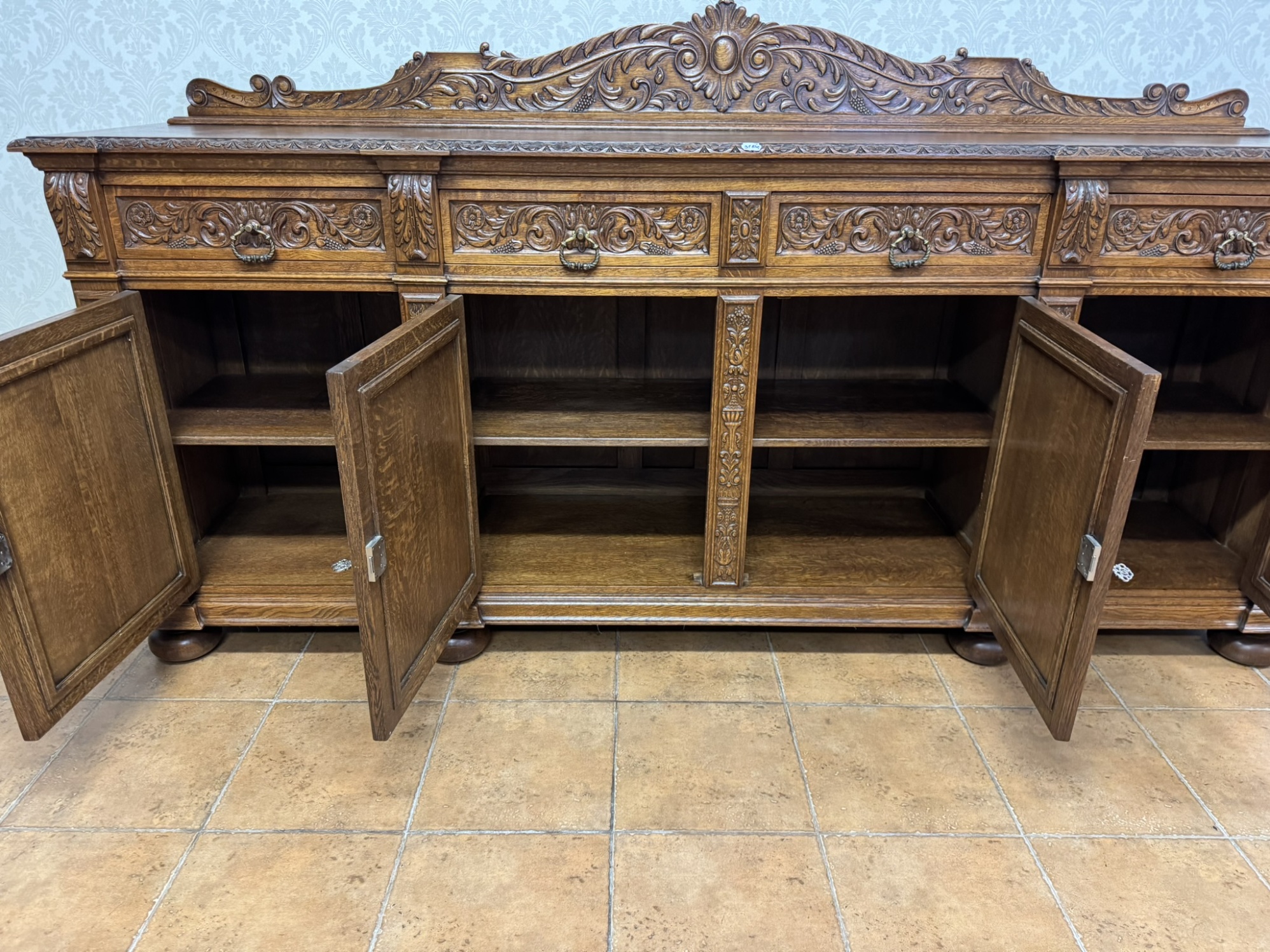 Knihovna z konce 19. století v renesanční revivalové estetice, určená pro reprezentativní interiéry a knihovny větších rezidencí. Bohatá řezbářská výzdoba, mramorové detaily a monumentální měřítko tvoří hlavní charakteristické prvky tohoto kusu. Konstrukce z masivního tvrdého dřeva klade důraz na pevnost a detail. Prosklené sekce sloužily k ukládání a prezentaci knih a dekorativních objektů.Psací stůl s bohatou řezbou