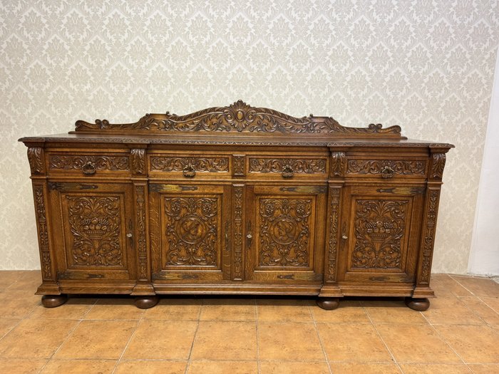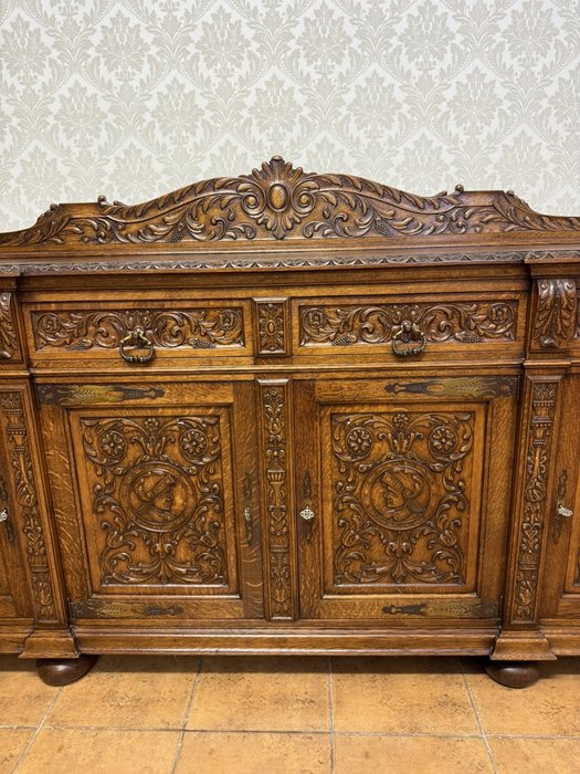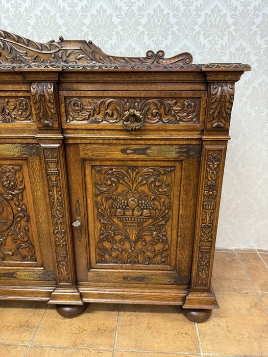 Komoda dubového dřeva s řezanými dvířky, zásuvkami a horní římsou. Výzdobu tvoří florální ornamenty, vinné hrozny a lví hlavy na úchytkách. Vnitřní prostor rozdělen do čtyř oddílů se zásuvkami v horní části. Vyrobeno v Itálii.
