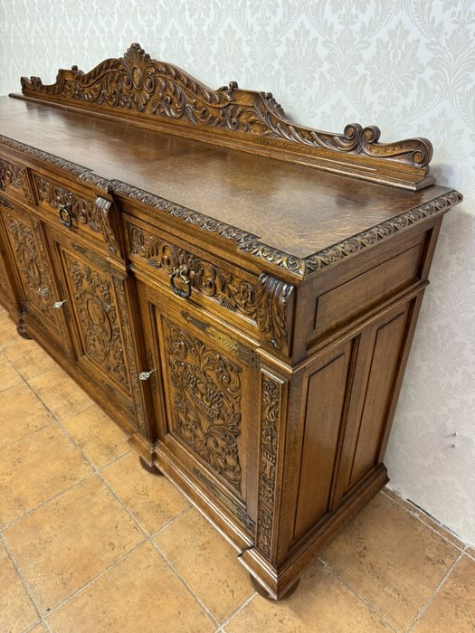 Vitrína zaujme svým detailním řezbářským zpracováním. Horní část je prosklená, ideální pro vystavení dekorací či porcelánu, zatímco spodní část nabízí dostatek úložného prostoru ve skříňkách a zásuvkách. Dekorativní reliéfy s květinovými a rostlinnými motivy doplňují elegantní kovové úchyty. Dominantní vrcholová římsa s vyřezávanými andílky podtrhuje celkový honosný vzhled.Intarzovaný příborník s bohatou řezbou