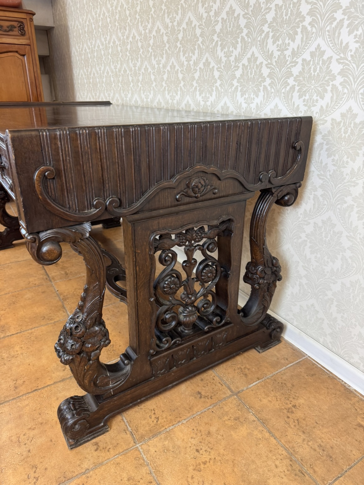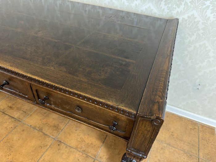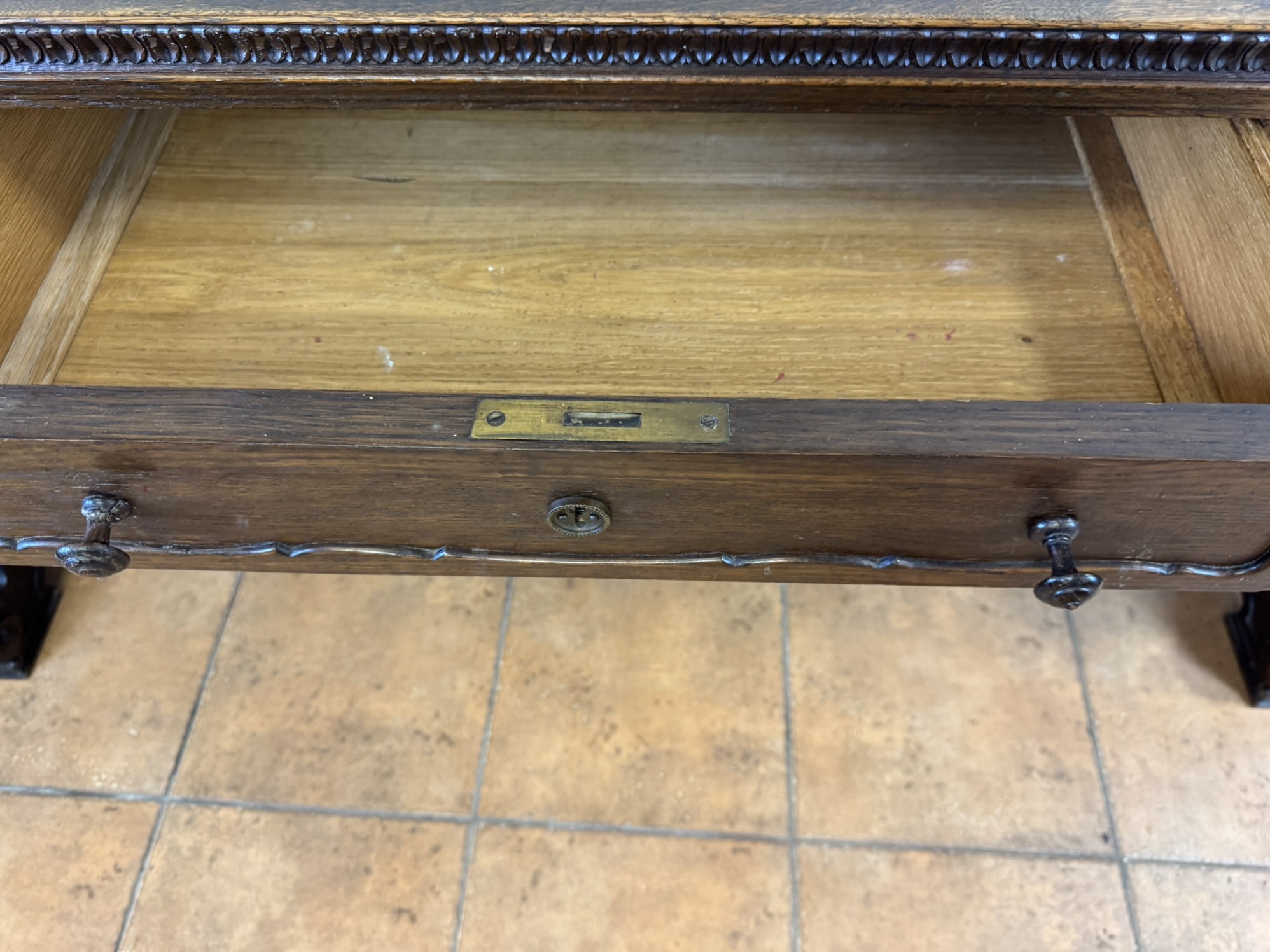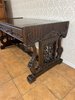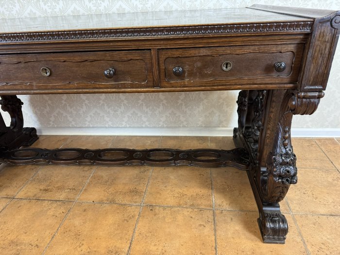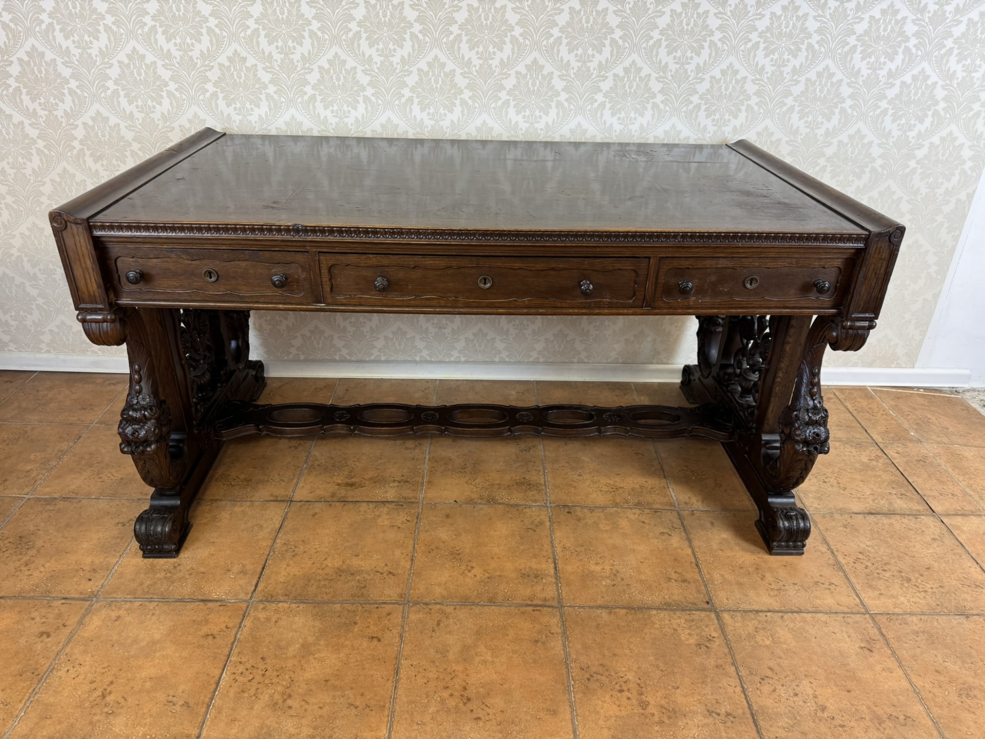 Psací stůl s robustní konstrukcí a detailně propracovanou řezbou. Má tři zásuvky v čelní části a bohatě zdobené nohy ve tvaru lví hlavy. Nohy jsou propojeny výraznou vyřezávanou spojnicí, která zajišťuje stabilitu a přidává stolu dekorativní hodnotu. Horní deska je dýhovaná tmavým dřevem a nese známky používání, což jí dodává na autenticitě.15 860 Kč