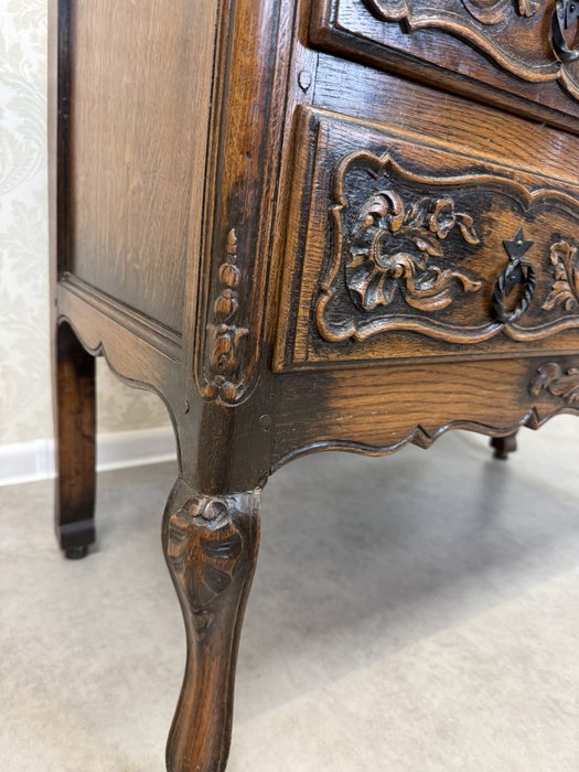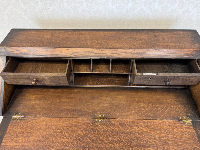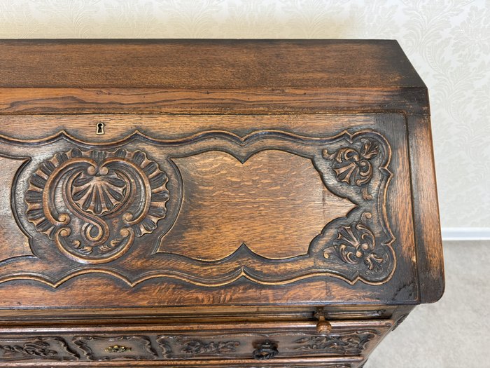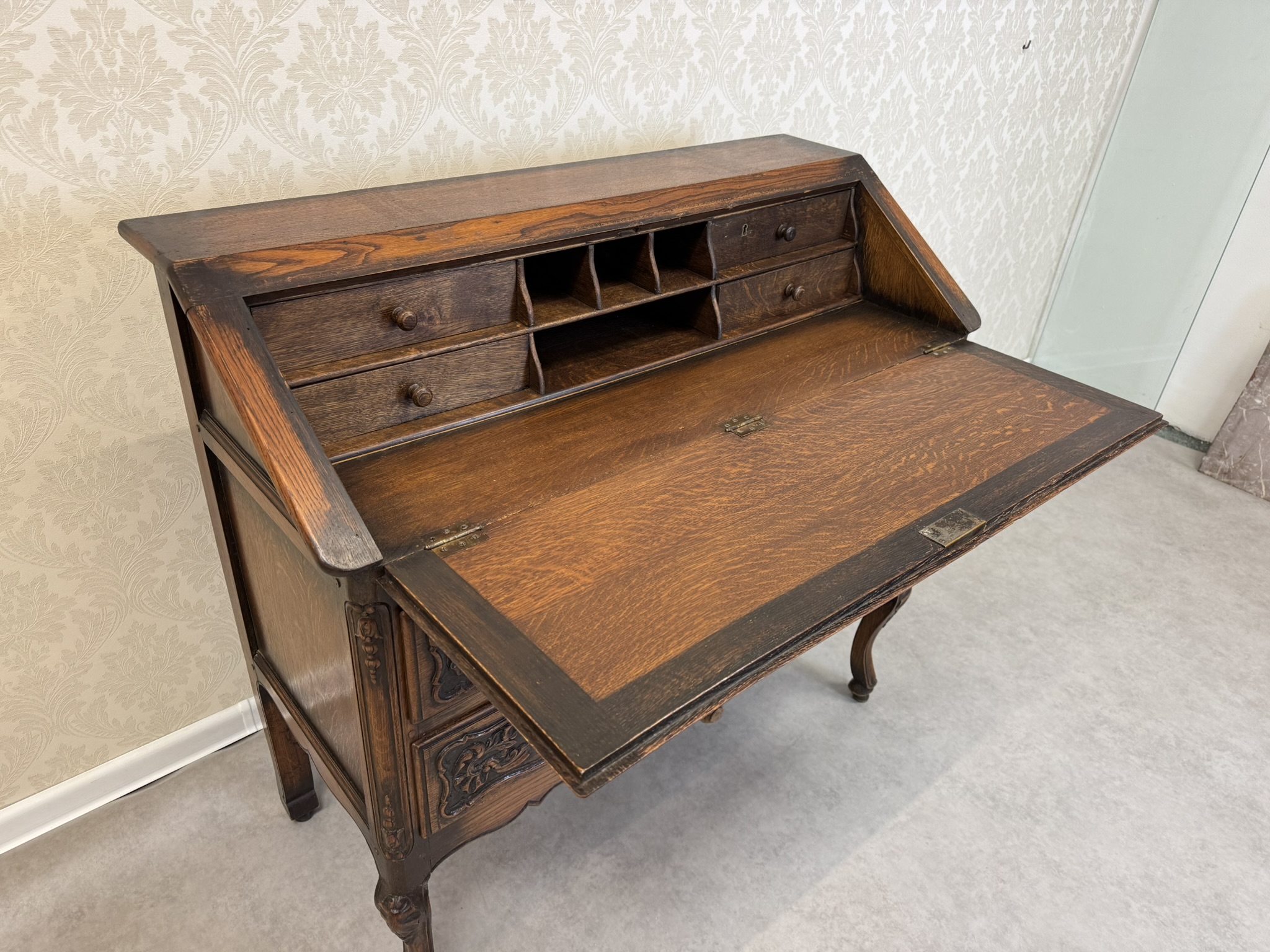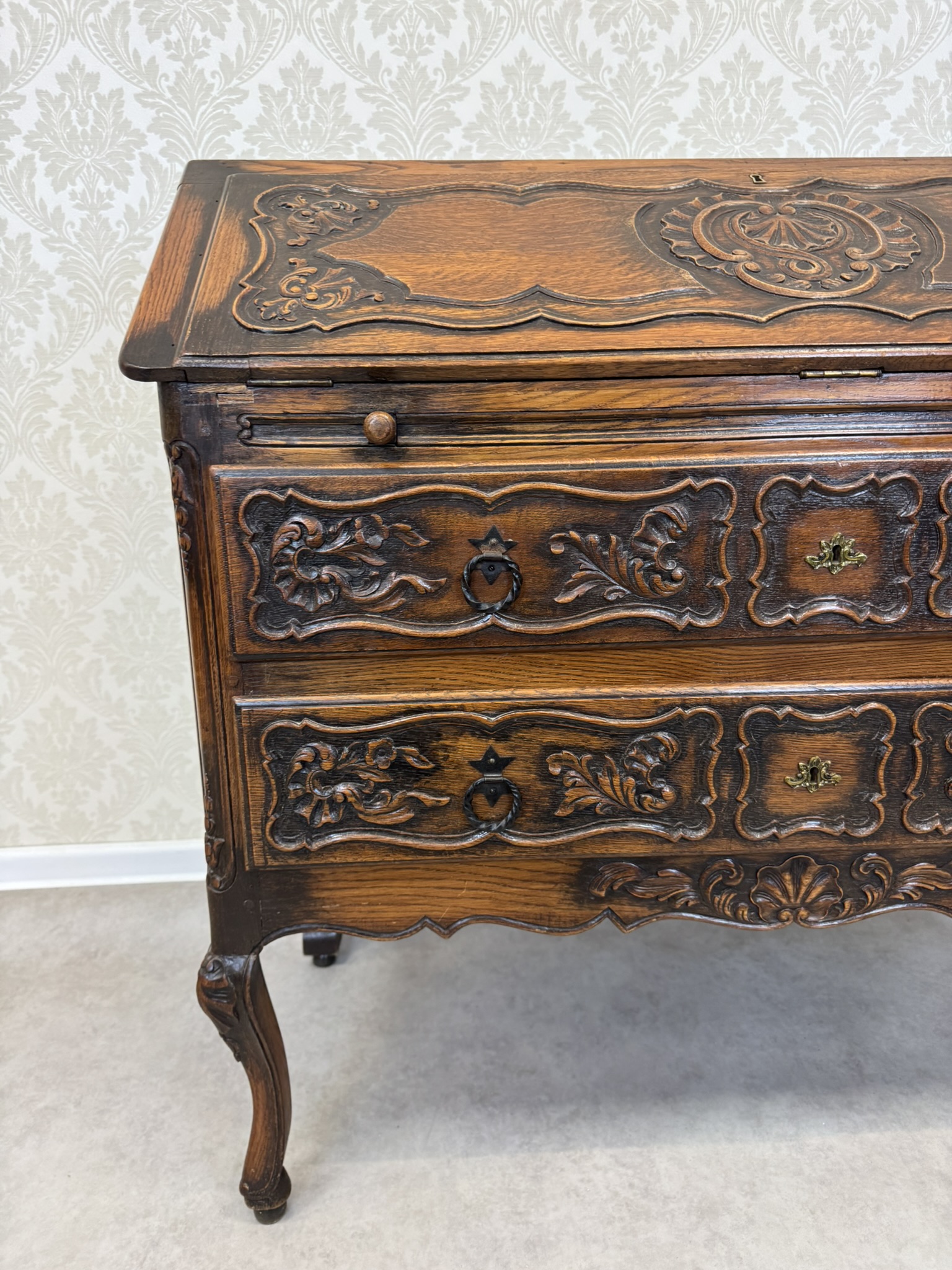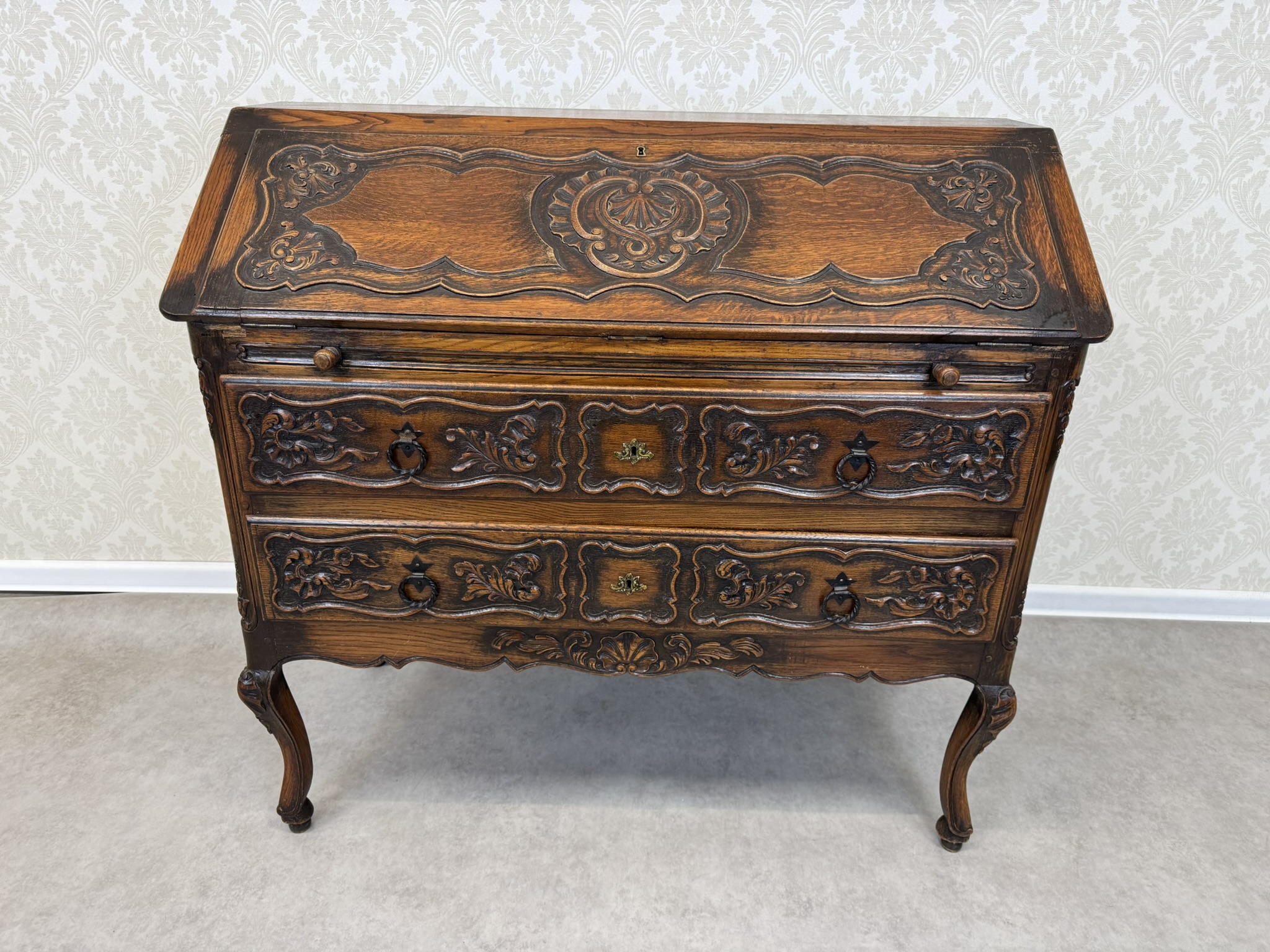 Psací stolek s výklopnou psací deskou je zdoben řezbováním a elegantními detaily na zásuvkách i horní desce. Vnitřní členění se zásuvkami a přihrádkami odkazuje na praktické řešení dobových psacích stolů.9 450 Kč