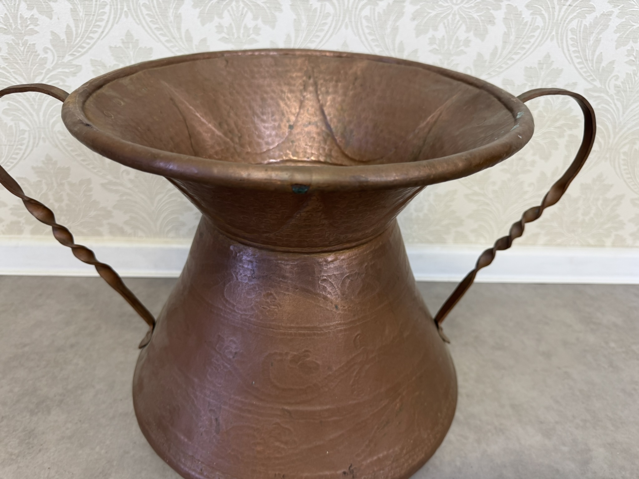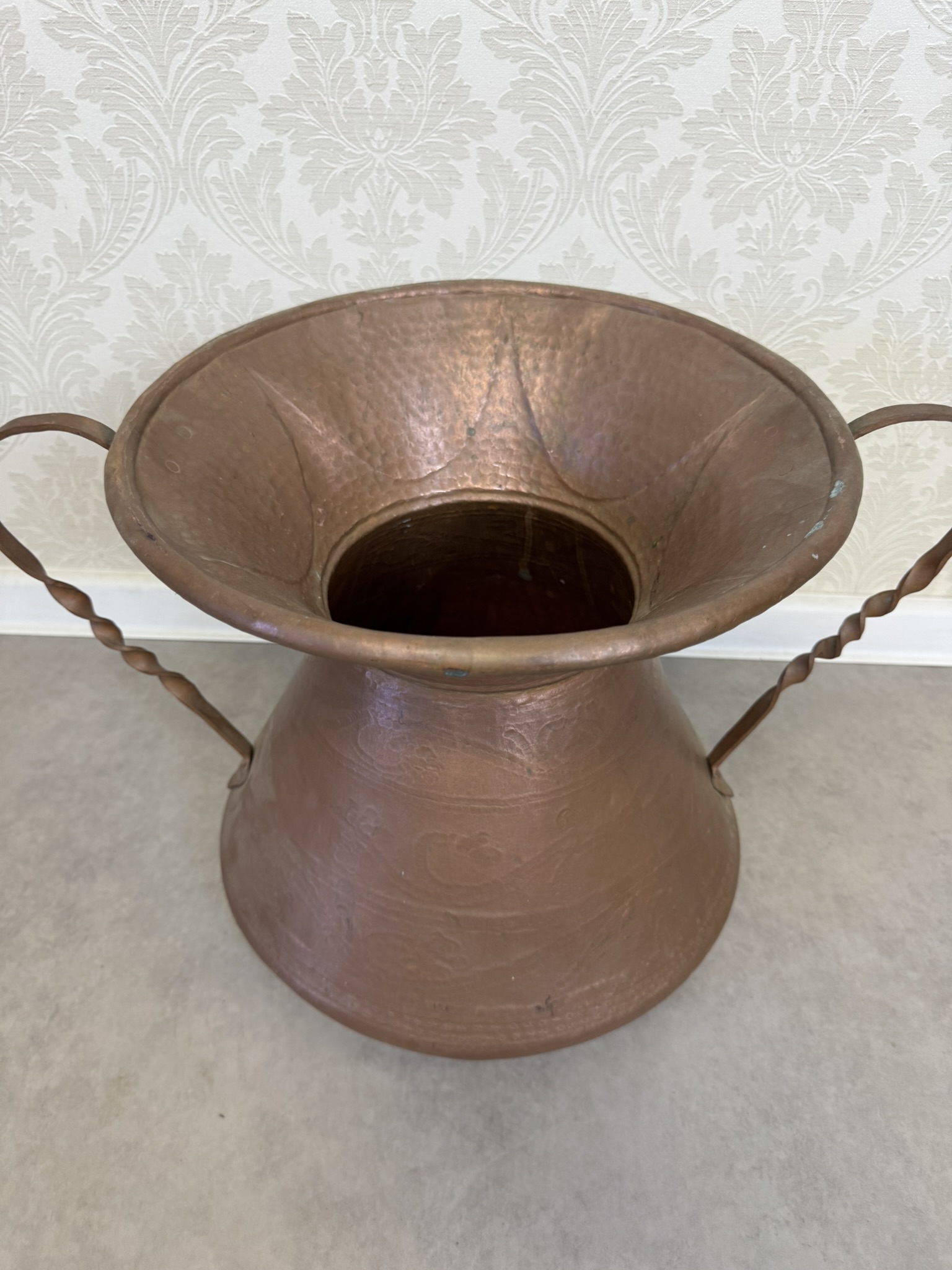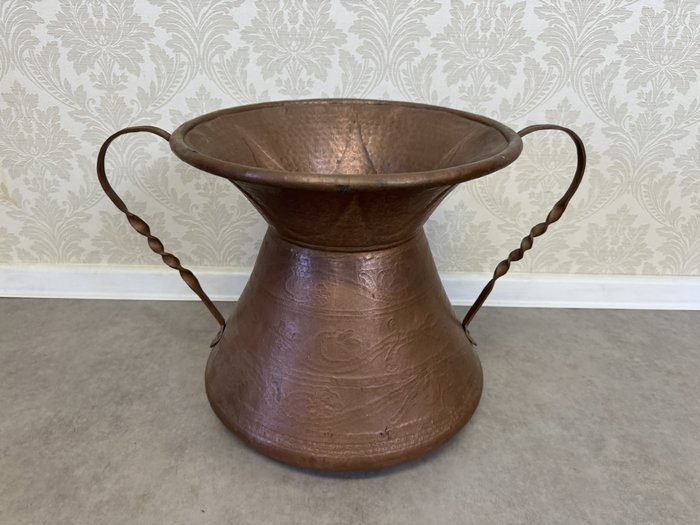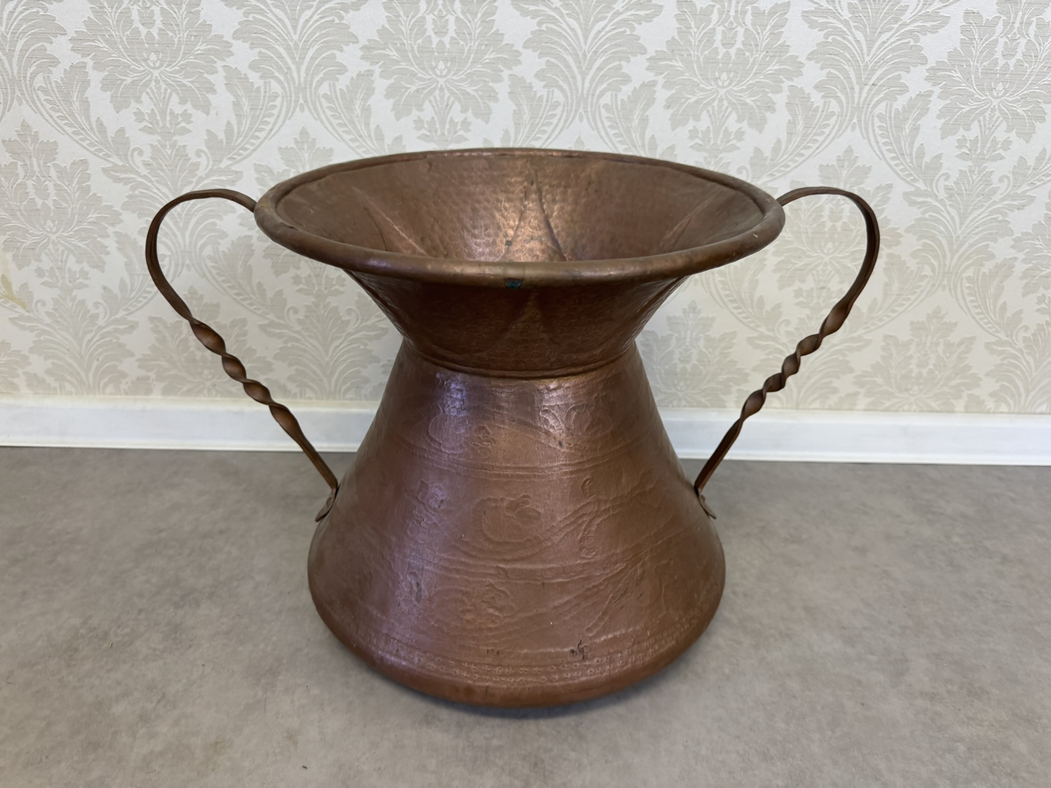 Měděná nádoba s typickým rozšířeným hrdlem a dvěma výraznými zakroucenými uchy. Povrch je ručně tepaný, s jemnou strukturou, která dodává celku rustikální charakter.2 560 Kč
