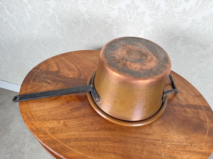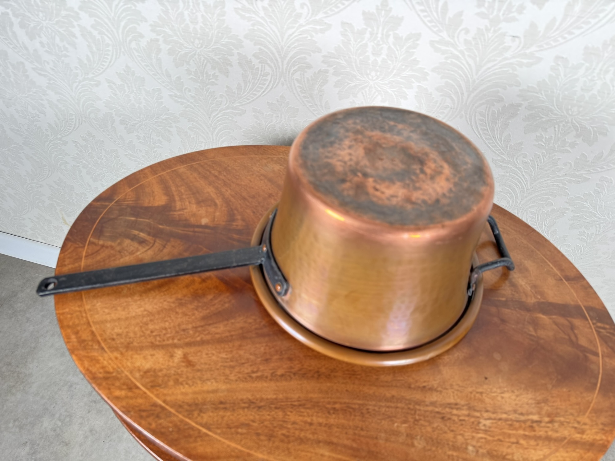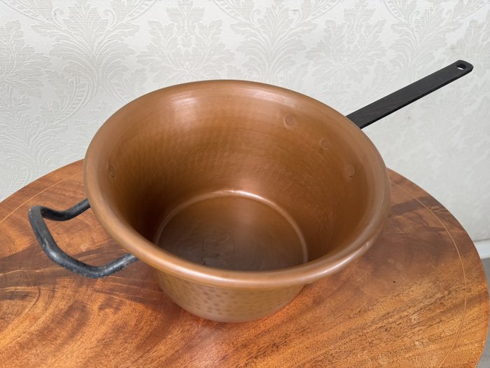 Měděný kastrol s typickým tepovaným povrchem, dlouhým železným madlem a bočním pomocným držadlem. Vhodný pro tradiční vaření nad ohněm nebo stylové kuchyňské dekorace. Spodní strana nese výraznou patinu od častého používání.1 580 Kč