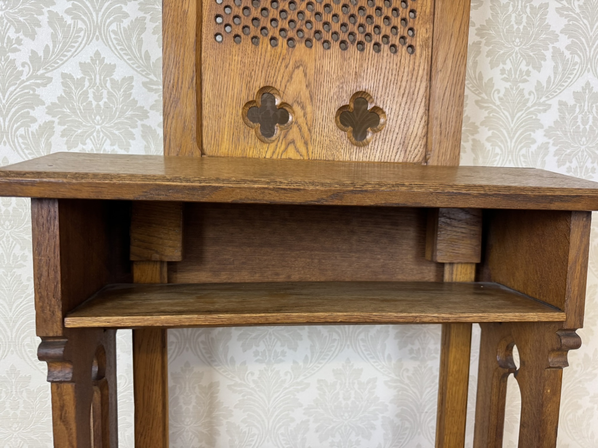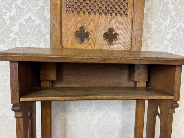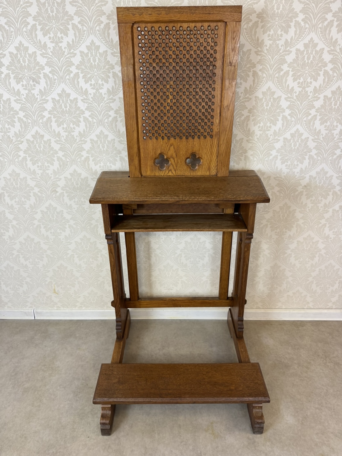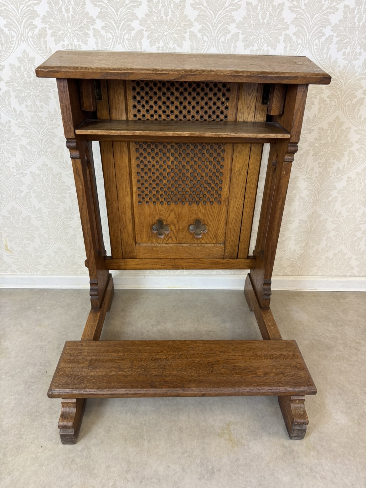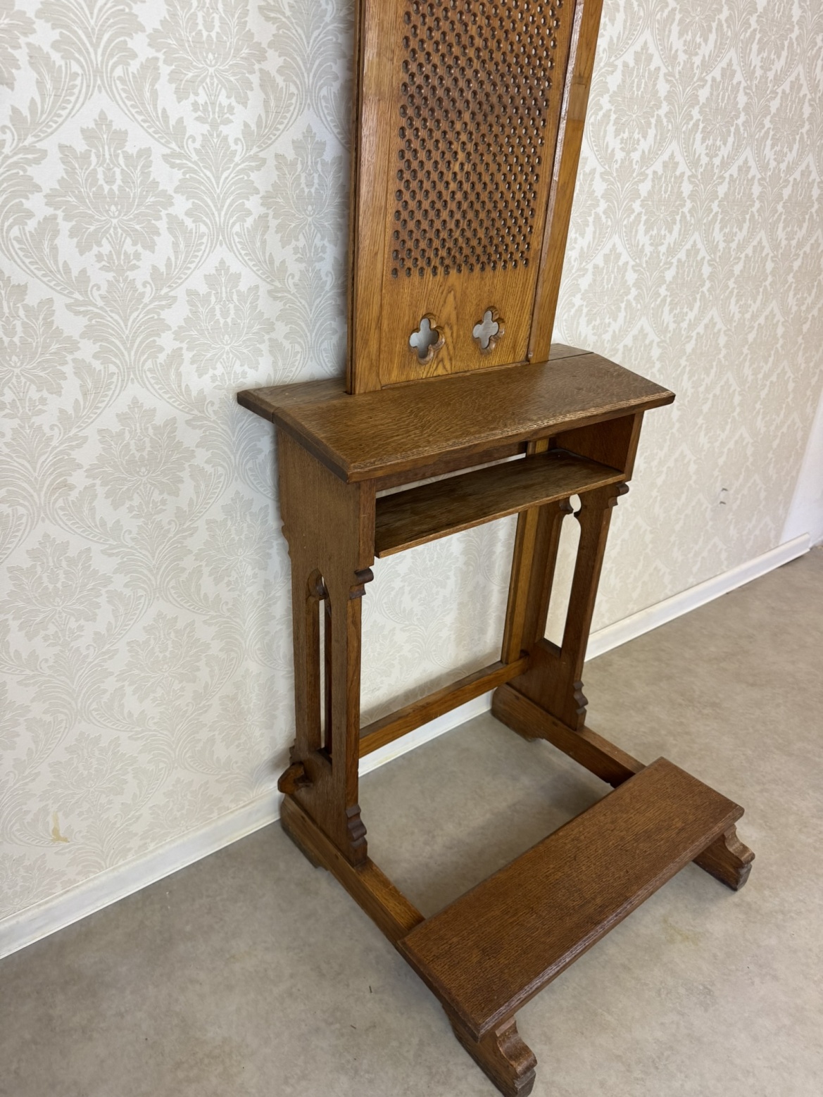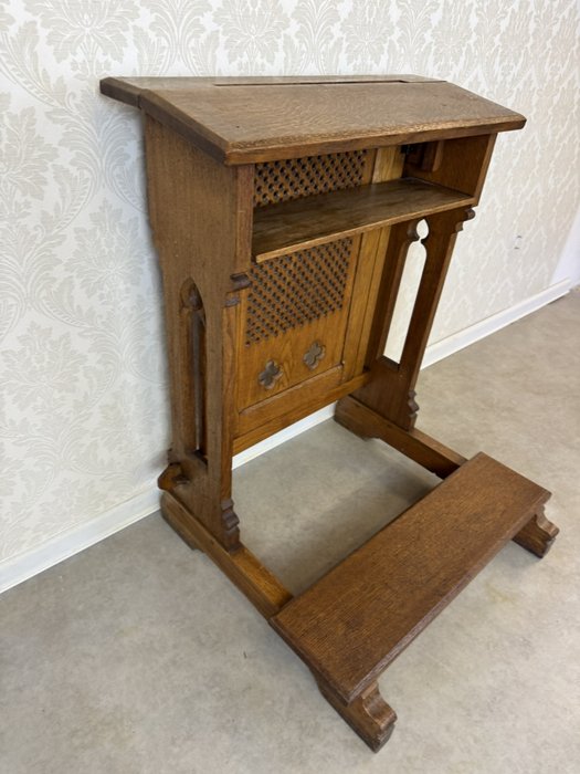 Modlitební klekátko, typické pro pozdní 19. století. Opěrná deska je osazena dřevěnou mřížkou s perforací a zakončena dvěma stylizovanými kružbovými otvory ve tvaru čtyřlístku. Konstrukce je jednoduchá, ale robustní – s praktickým podnožím a policí pod horní deskou.