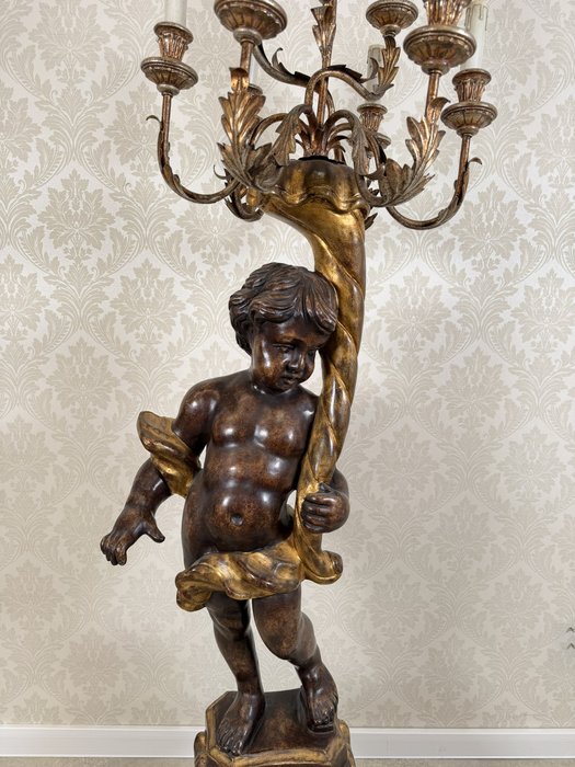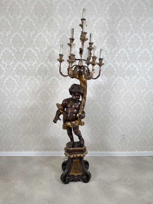 Dřevěný světlonoš v podobě sochy andílka, držícího bohatě zdobený devítiramenný světelný nástavec na el. energii. Výrazná modelace, patinovaný povrch a honosná podesta odkazují na reprezentativní prvky šlechtických interiérů.47 350 Kč