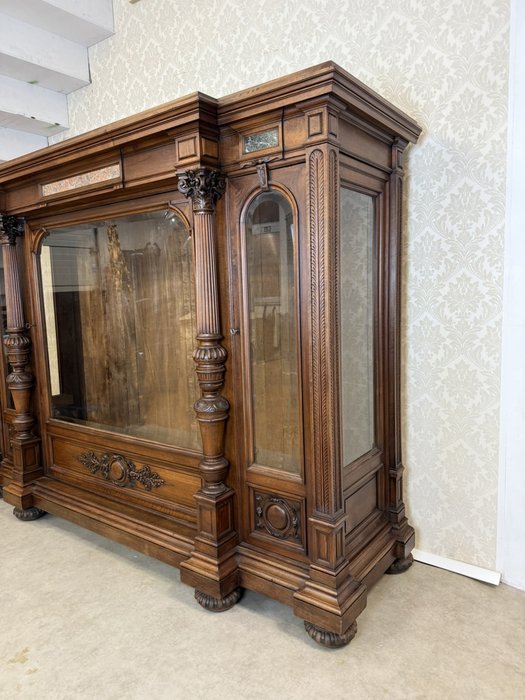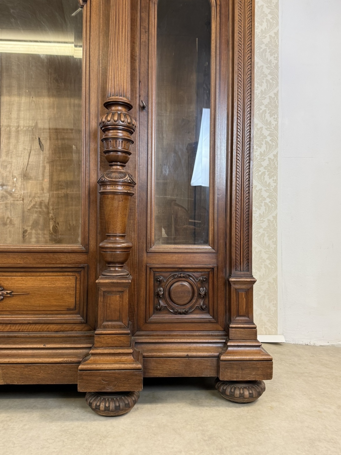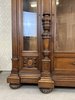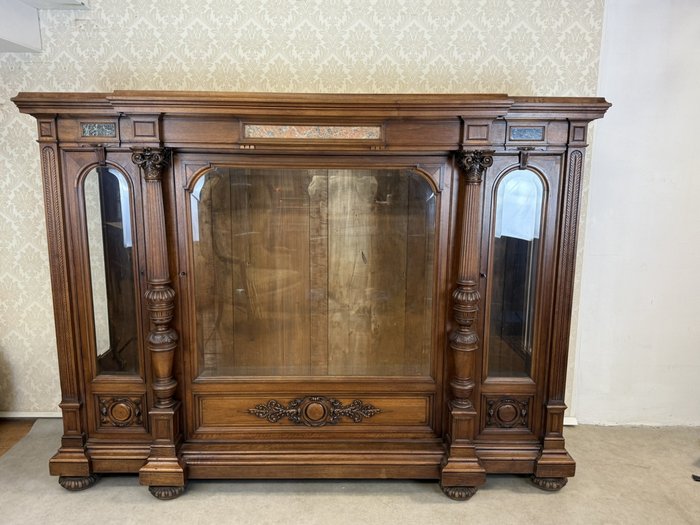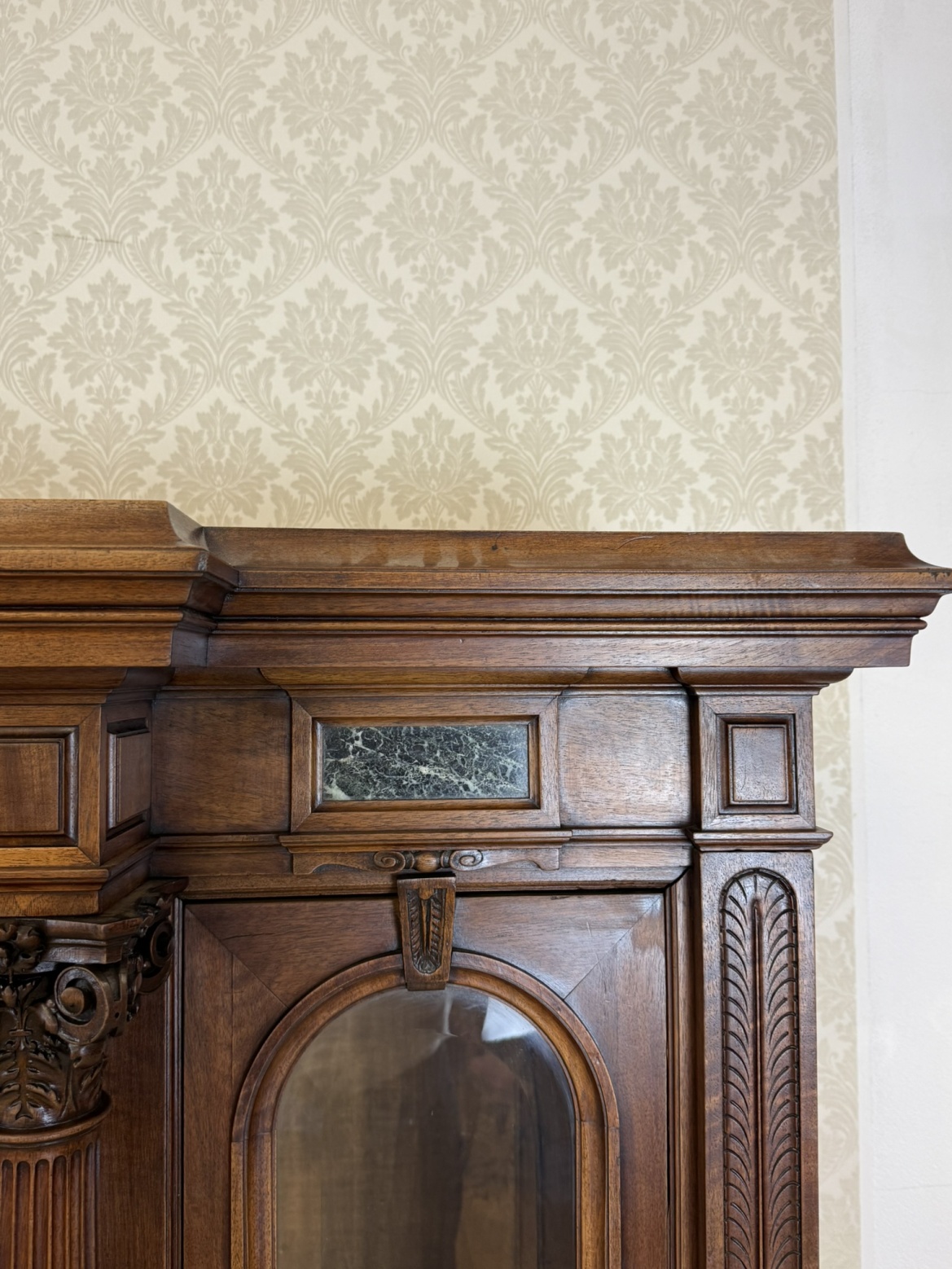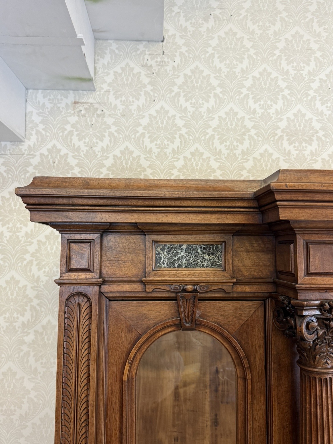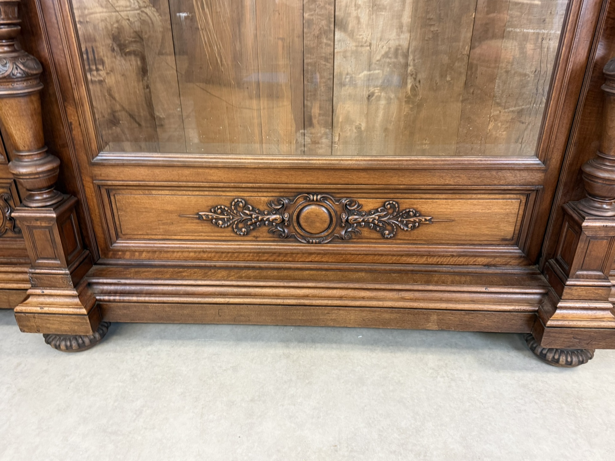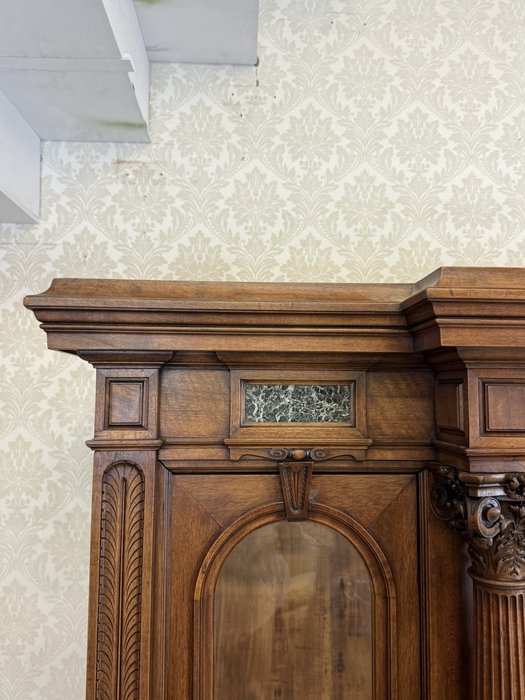 Impozantní knihovna se středovou prosklenou částí je doplněna dvěma užšími vitrínovými křídly po stranách, lemovanými profilovanými pilastry a robustními sloupky s vyřezávanými hlavicemi. Vrchní římsa je zvýrazněna obdélnými panely, které dodávají nábytku vznešený charakter. Podstavce zdobí plastické reliéfy a masivní patky ve tvaru mušlových nožek.80 650 Kč
