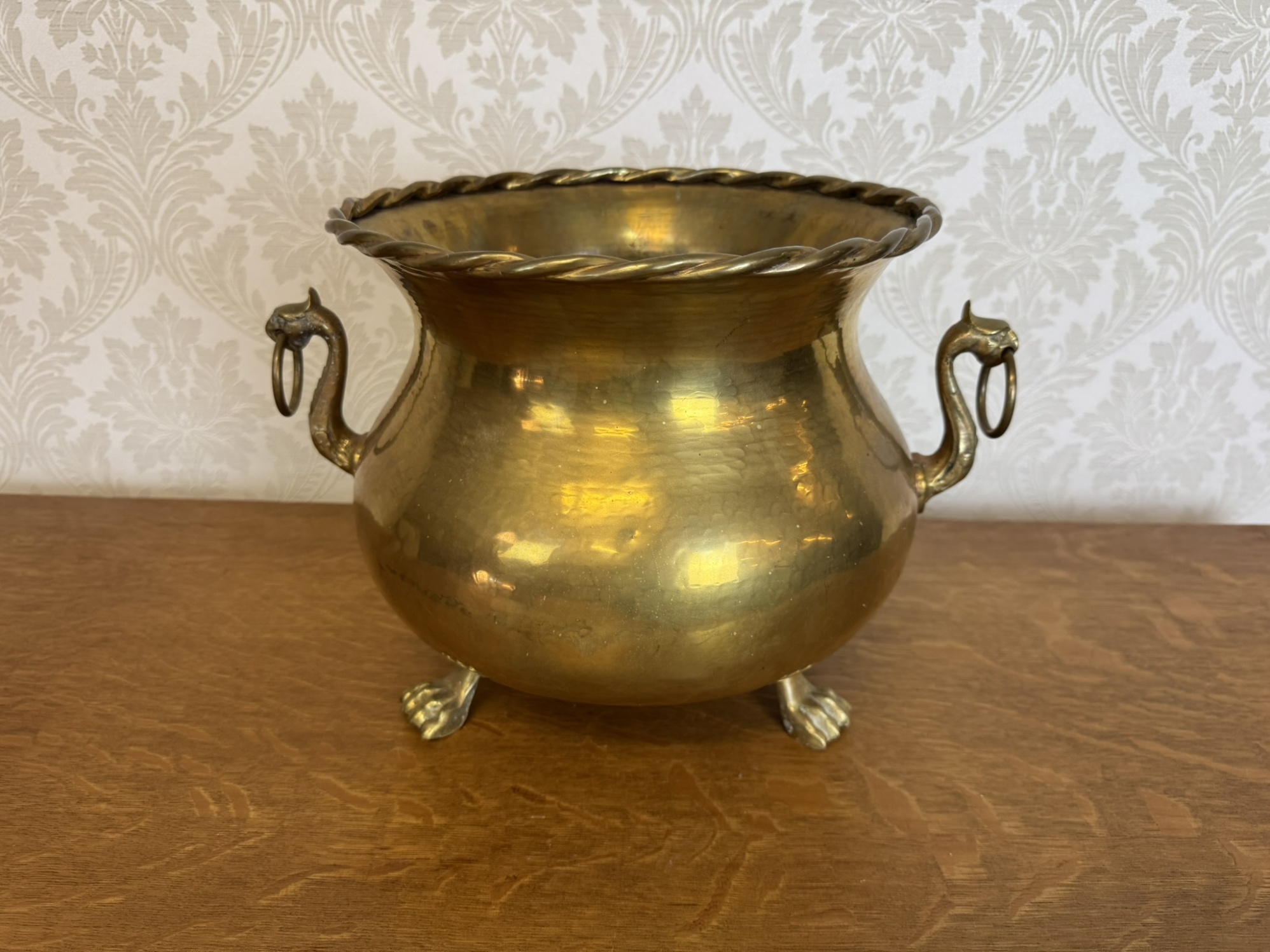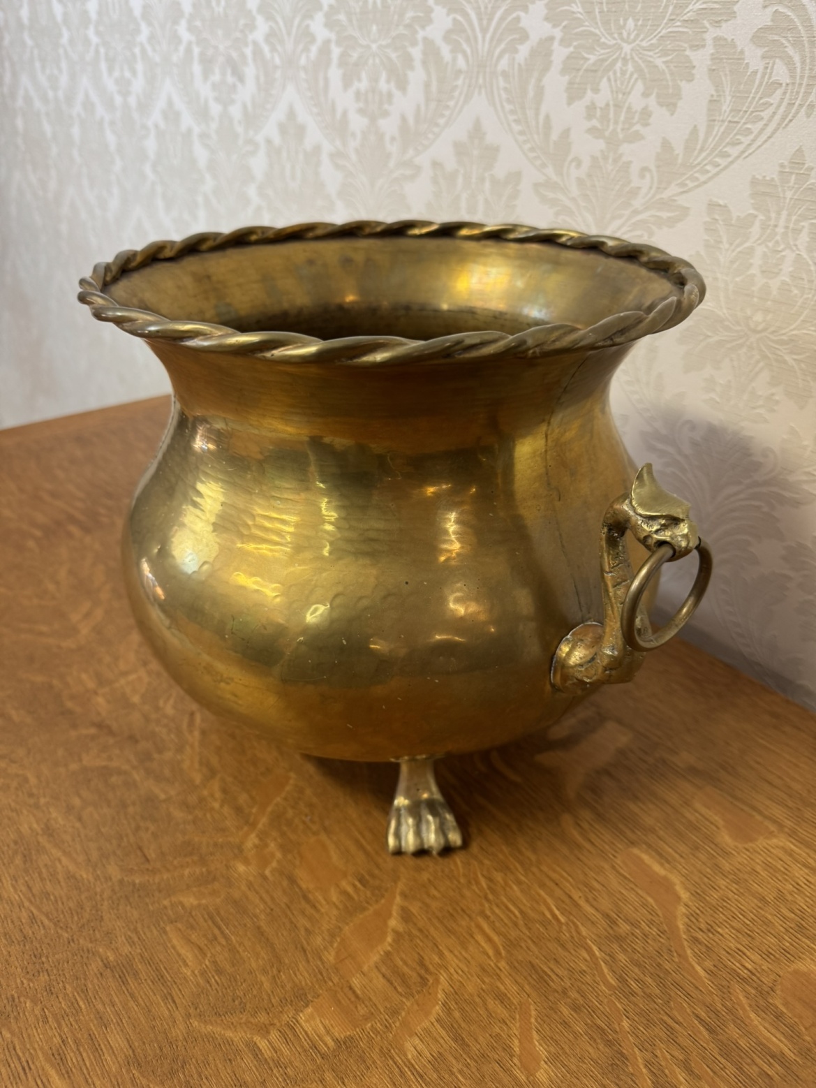 Dekorativní mosazná nádoba s rozšířeným hrdlem lemovaným točeným okrajem, bočními uchy ve tvaru kočičích hlav s kroužky a třemi plastickými nožkami ve tvaru lvích tlap. Precizní řemeslné zpracování s výraznými detaily.2 480 Kč